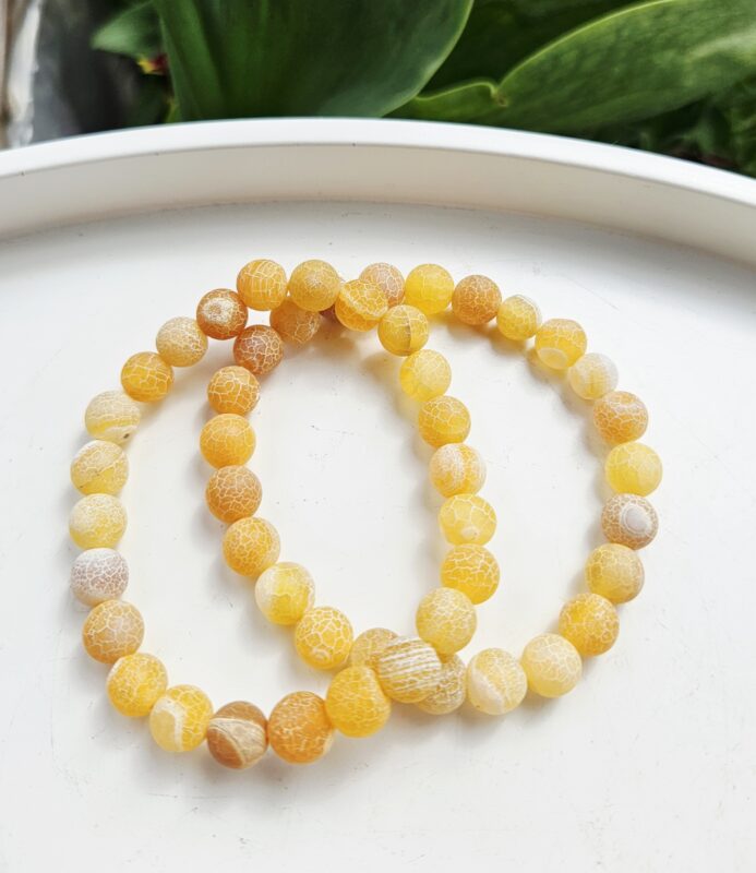 Tento jedinečný náramok z prírodného achátu v „frozen“ úprave očarí svojou zaujímavou popraskanou štruktúrou a krásnymi odtieňmi žltej – od jemnej krémovej až po teplú medovú.