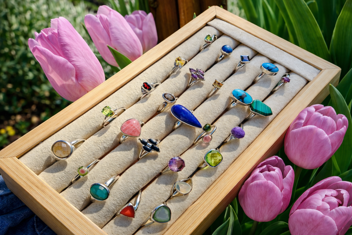 Jemné strieborné prstene s prírodnými minerálmi v rôznych farbách a tvaroch