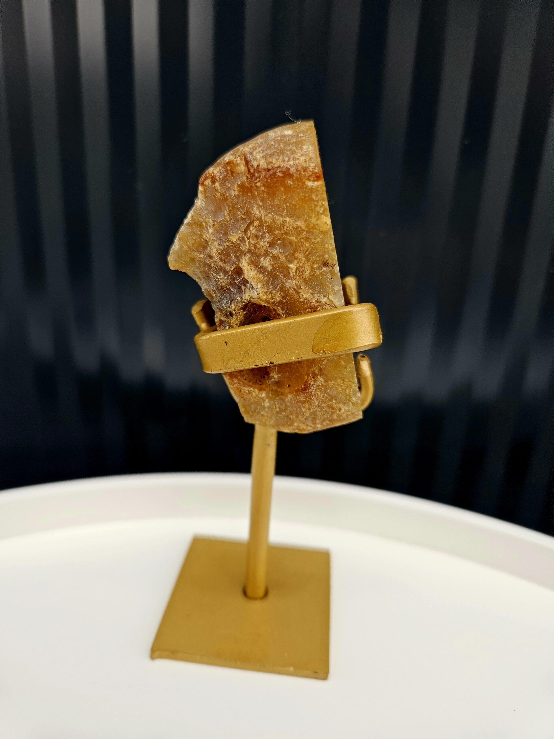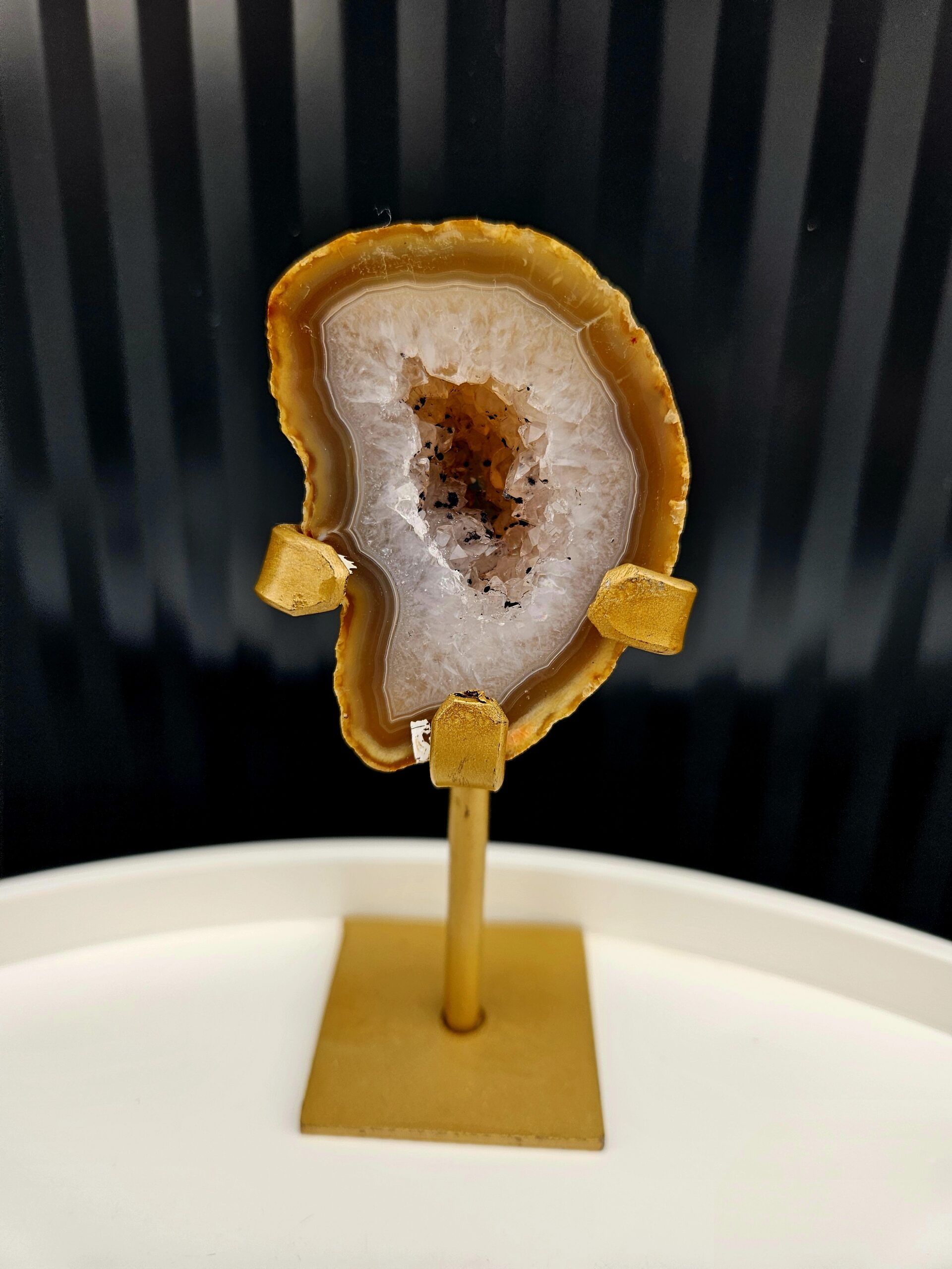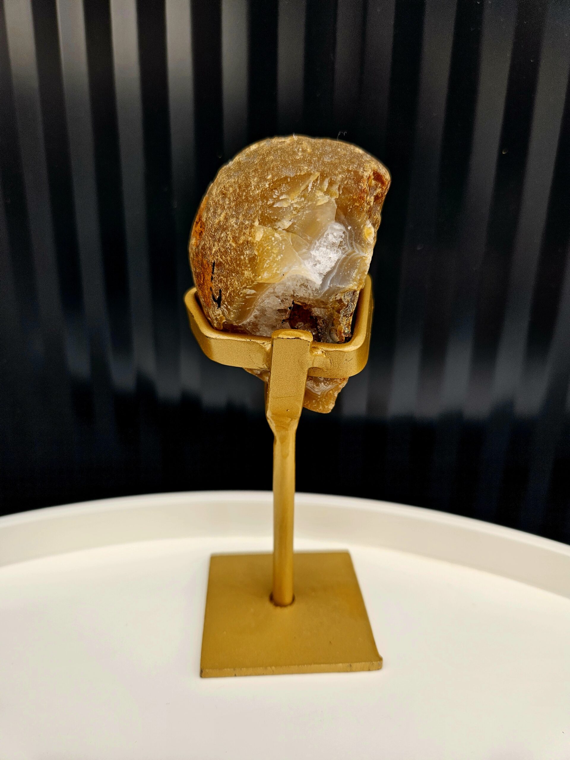 Teplé medové odtiene achátu obklopujú jemné kryštálové jadro, ktoré pôsobí nežne a harmonicky. Tento menší, ale výrazný kúsok je ideálny ako elegantný detail, ktorý zútulní každý priestor. Zlatý stojan podčiarkuje jeho prirodzenú krásu a dodáva mu luxusný vzhľad.