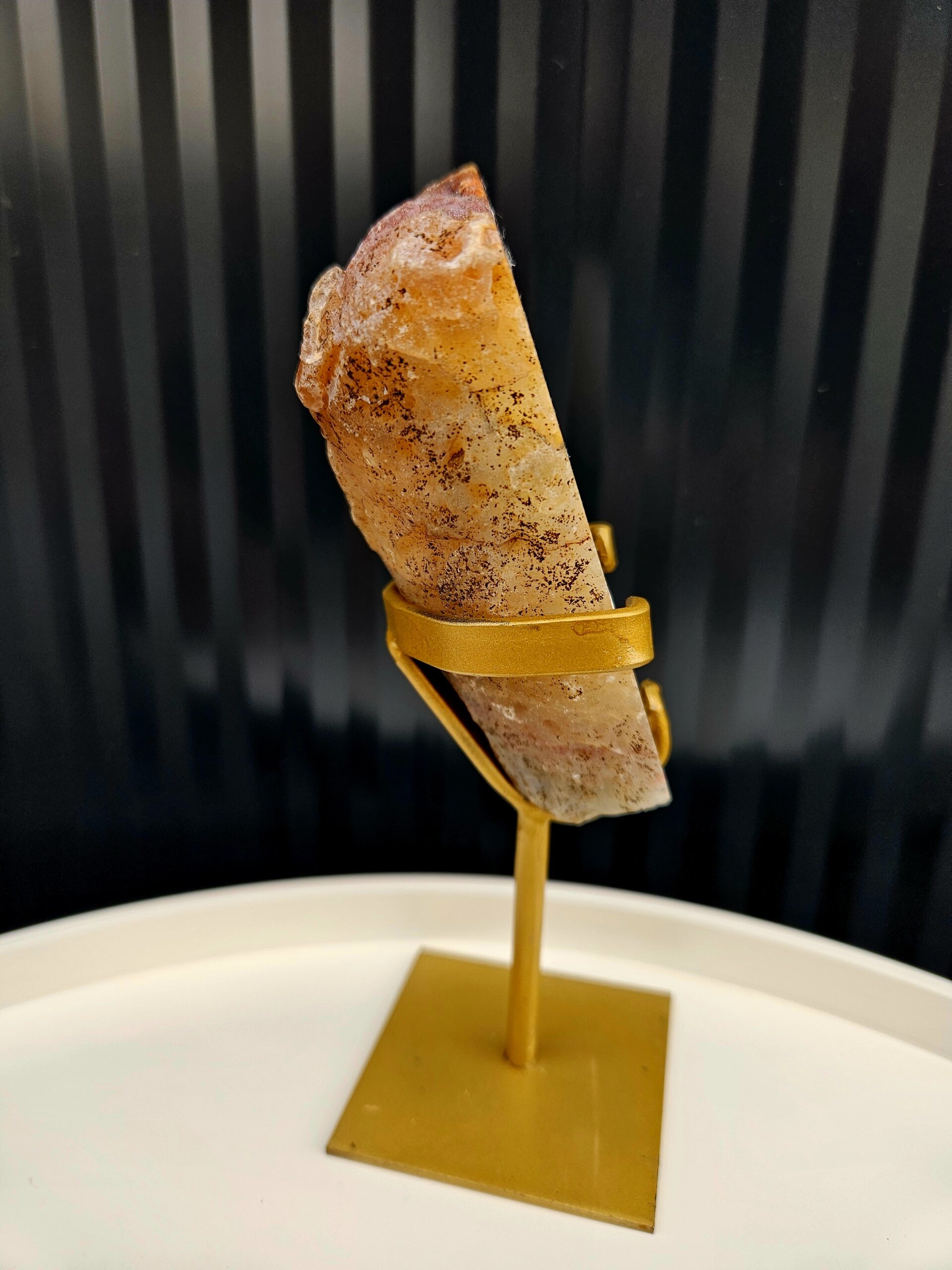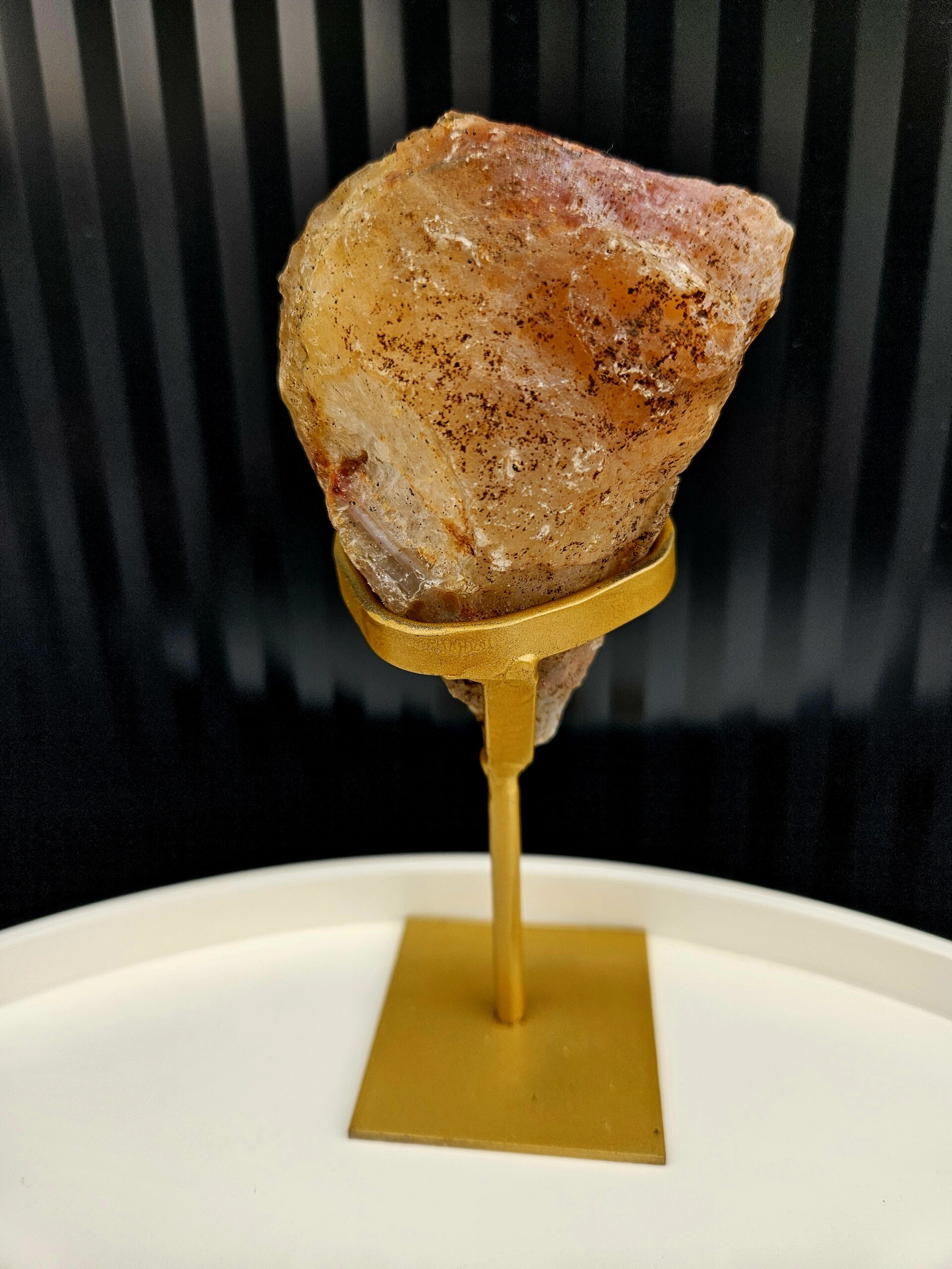 Jemná kresba achátu v svetlých krémových tónoch prechádza do trblietavého kryštálového jadra s teplými hnedými odleskami. Tento výrazný kúsok pôsobí elegantne a prirodzene zároveň – ako malý umelecký detail vytvorený prírodou. Zlatý stojan krásne podčiarkuje jeho jedinečnosť.