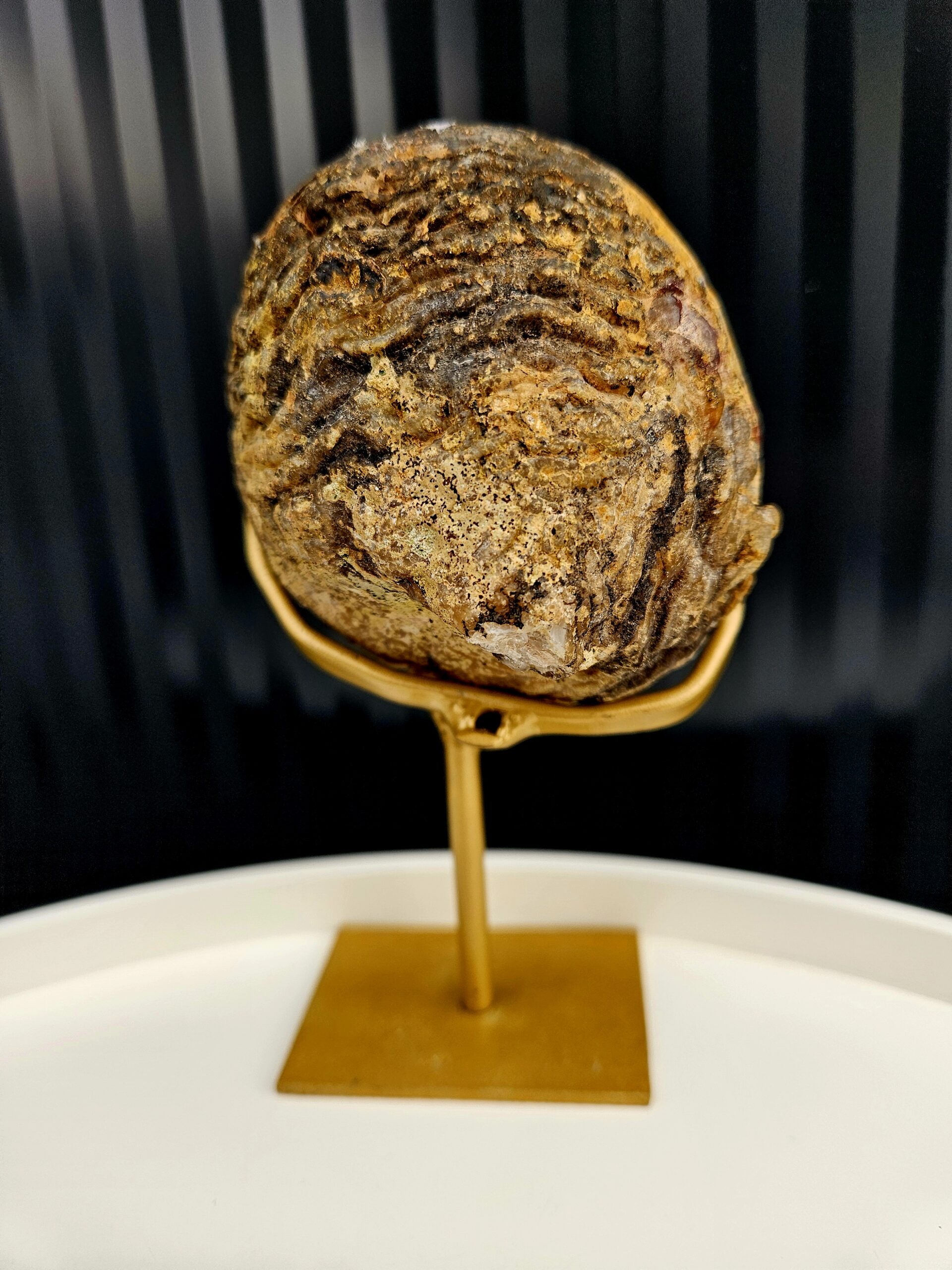Nádherná achátová geóda s výrazným kryštálovým jadrom v teplých hnedo-medových odtieňoch, ktoré sa jemne lesknú pri dopade svetla. Okolitá svetlá štruktúra vytvára zaujímavý kontrast a dodáva tomuto kúsku hĺbku a charakter. Zlatý stojan podčiarkuje jeho prirodzenú eleganciu.