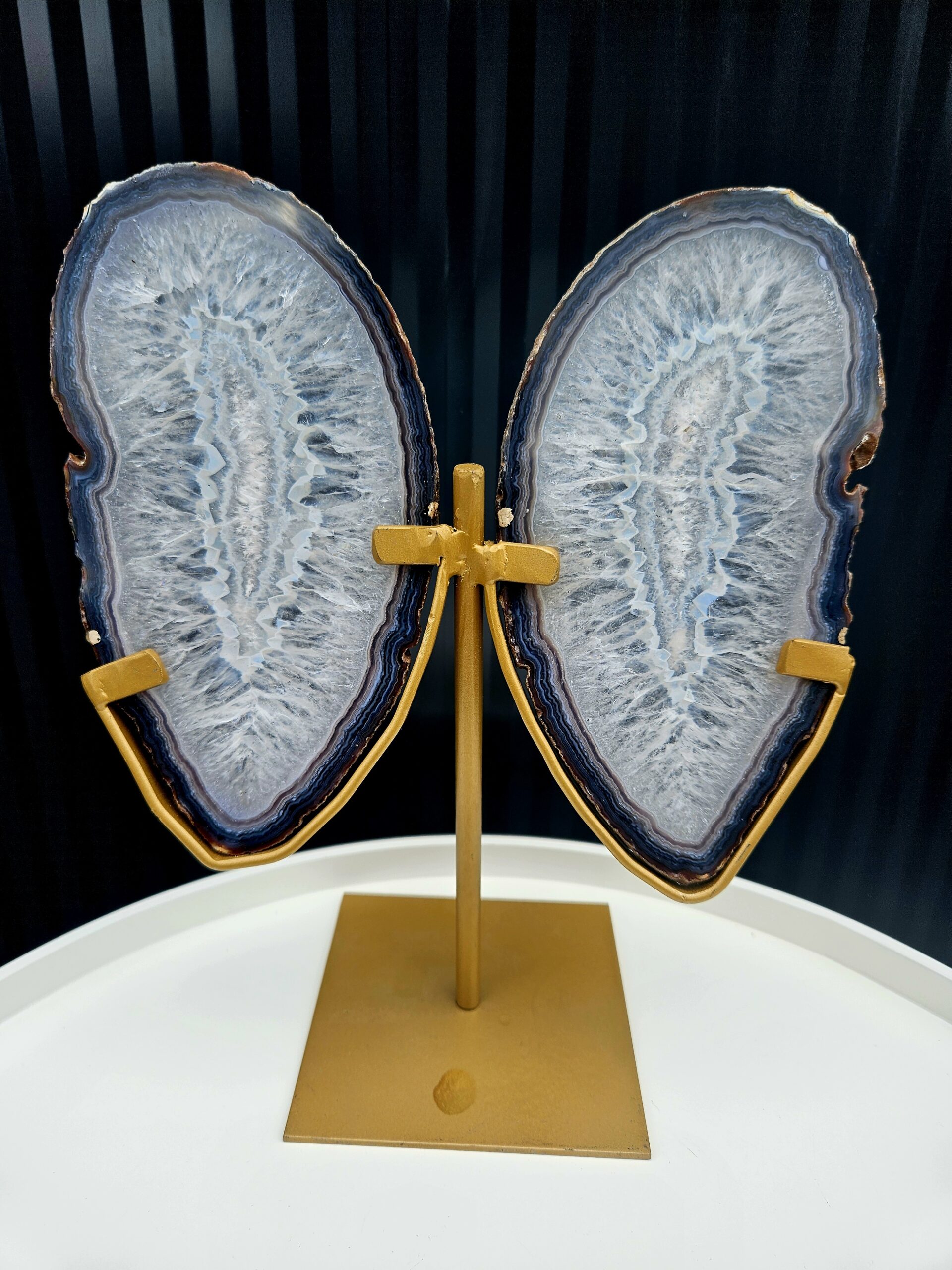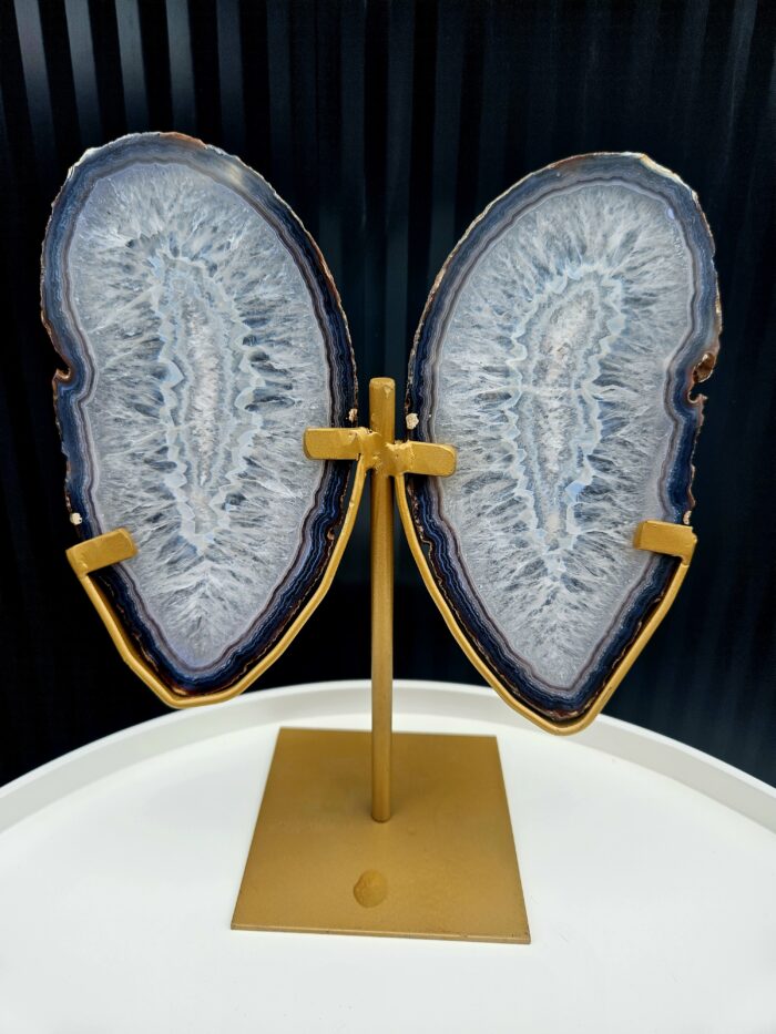 Elegantná dekorácia, ktorá v sebe spája krásu prírody a jemnú symboliku premeny. Dva precízne leštené achátové plátky vytvárajú tvar motýlích krídel, ktoré vyniknú na luxusnom zlatom stojane. Každý kus je originál s unikátnou kresbou a jemnými prechodmi farieb.