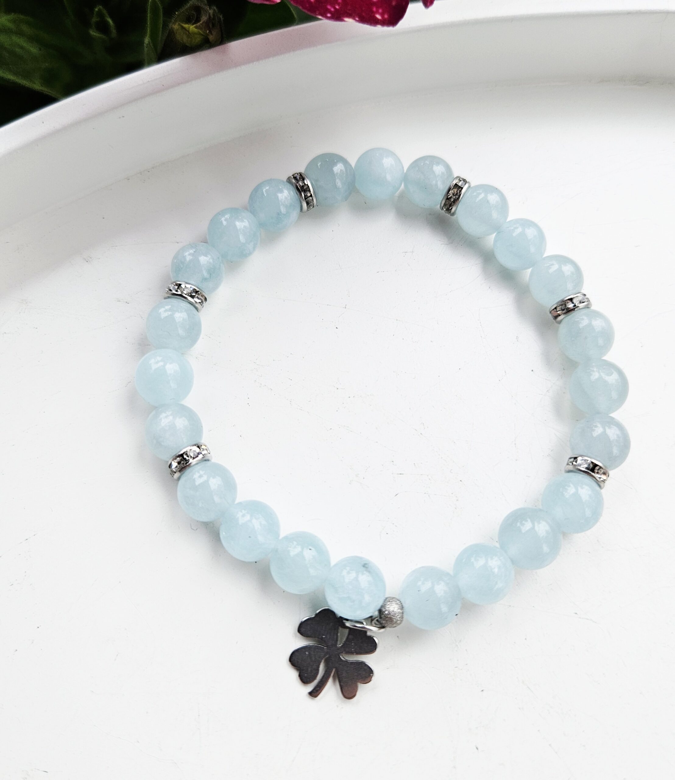 Elegantný náramok z prírodného akvamarínu v jemných svetlomodrých tónoch, doplnený o lesklé prvky z chirurgickej ocele a prívesok štvorlístka – symbol šťastia a ochrany.
