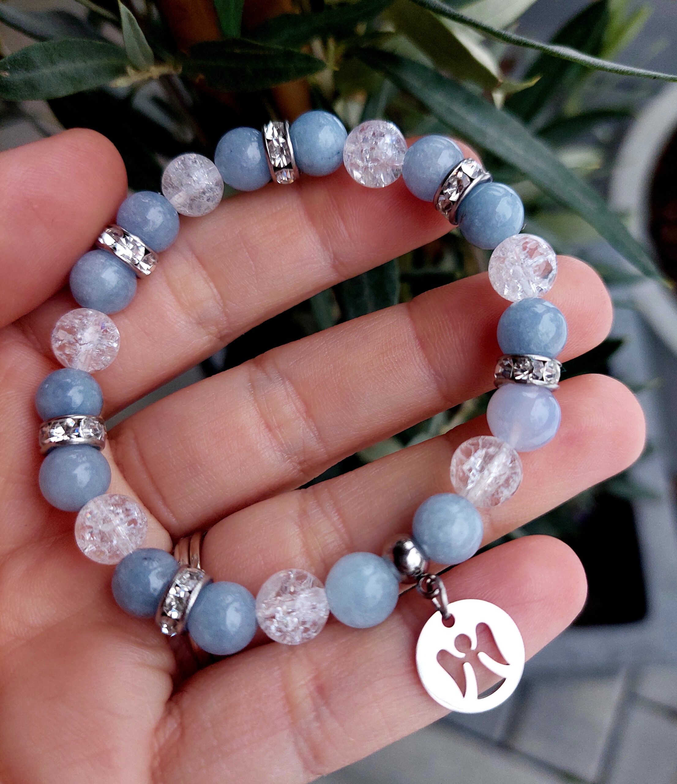 Akvamarín + Krištáľ náramok 8mm anjelik