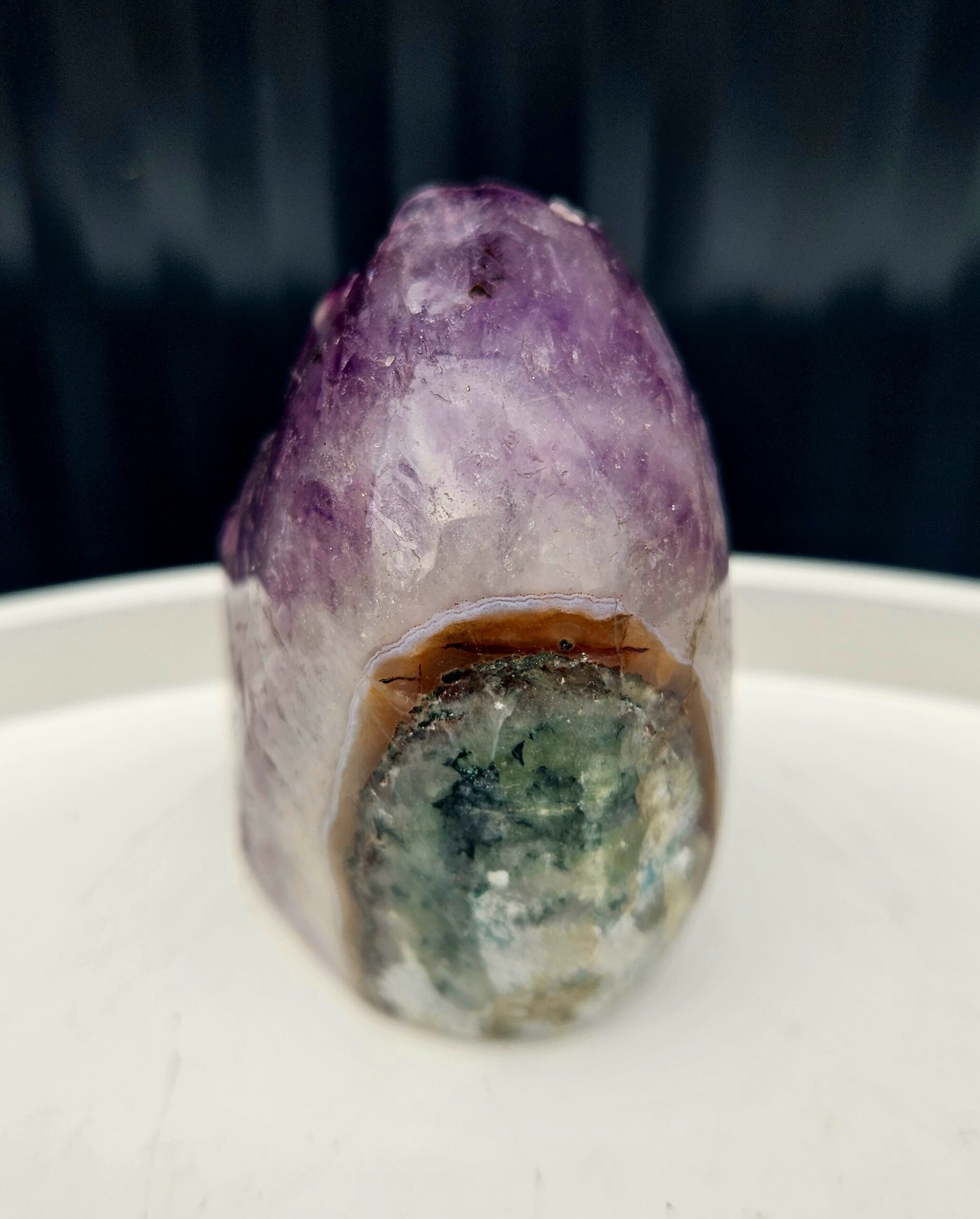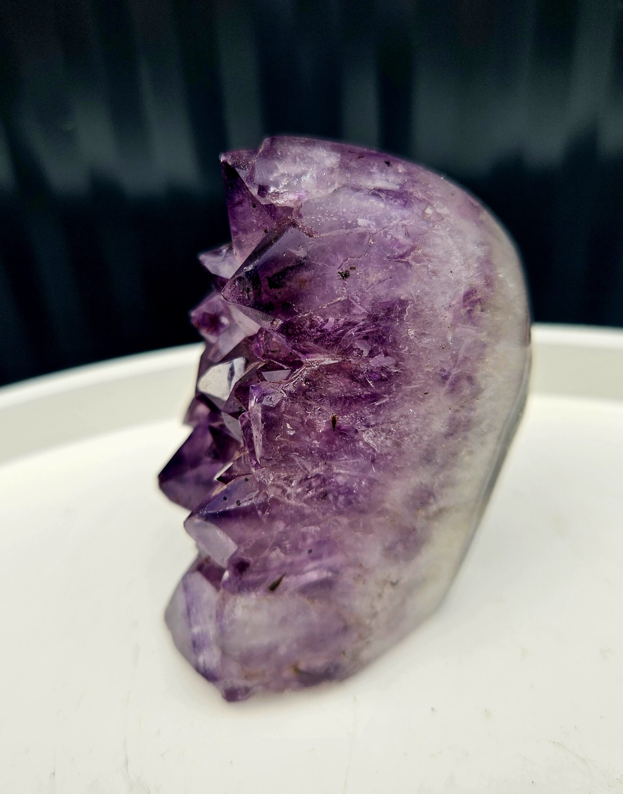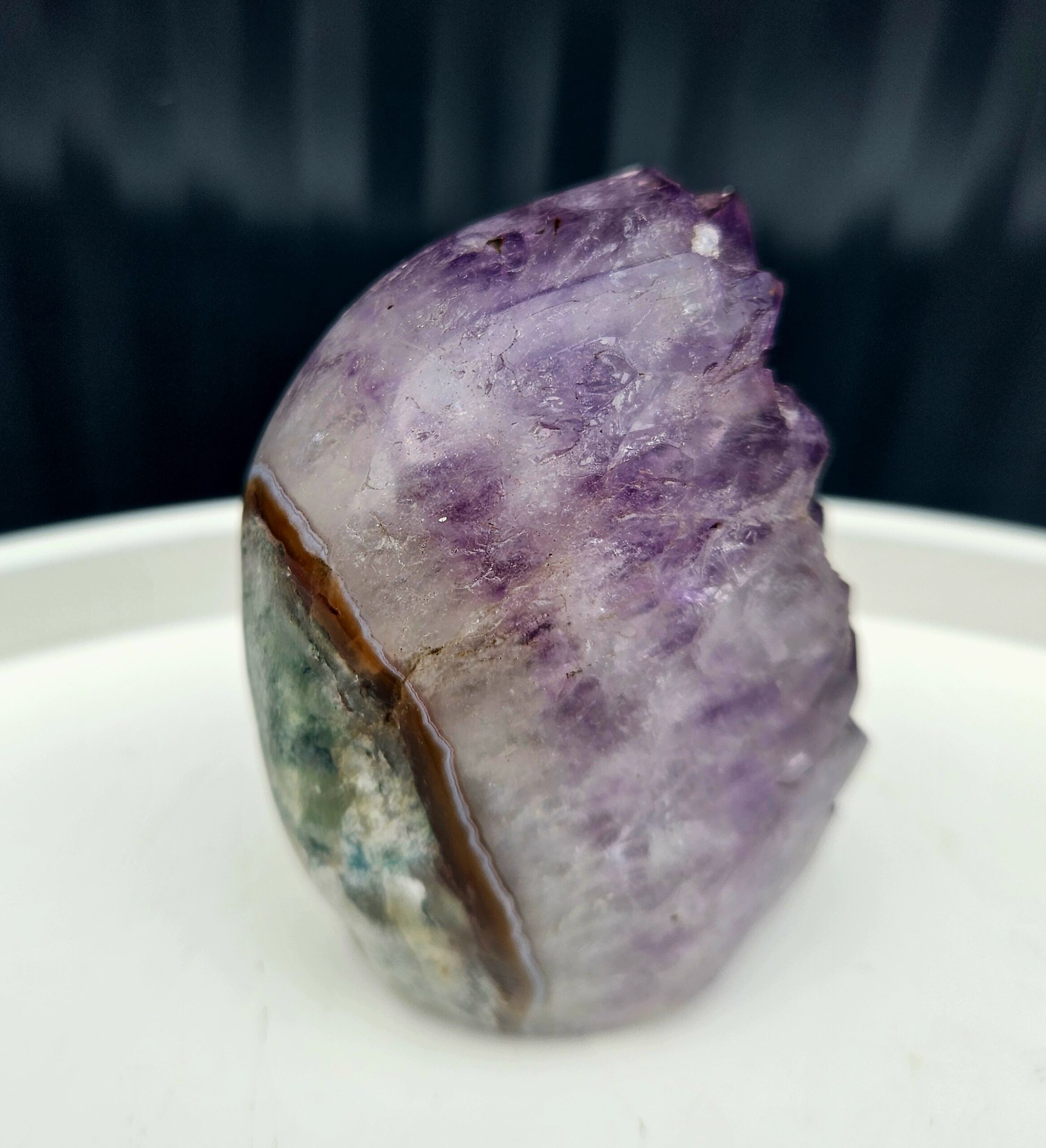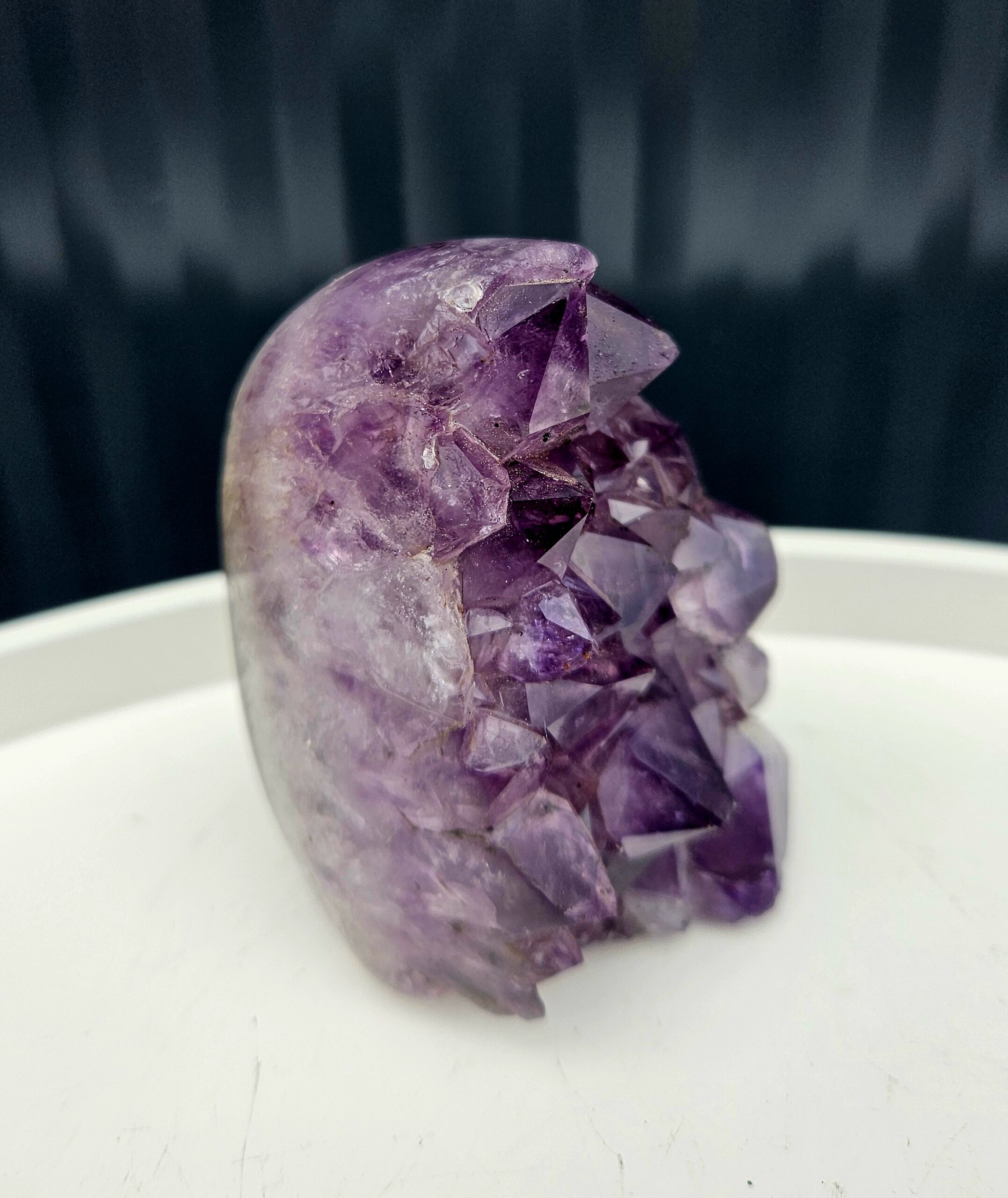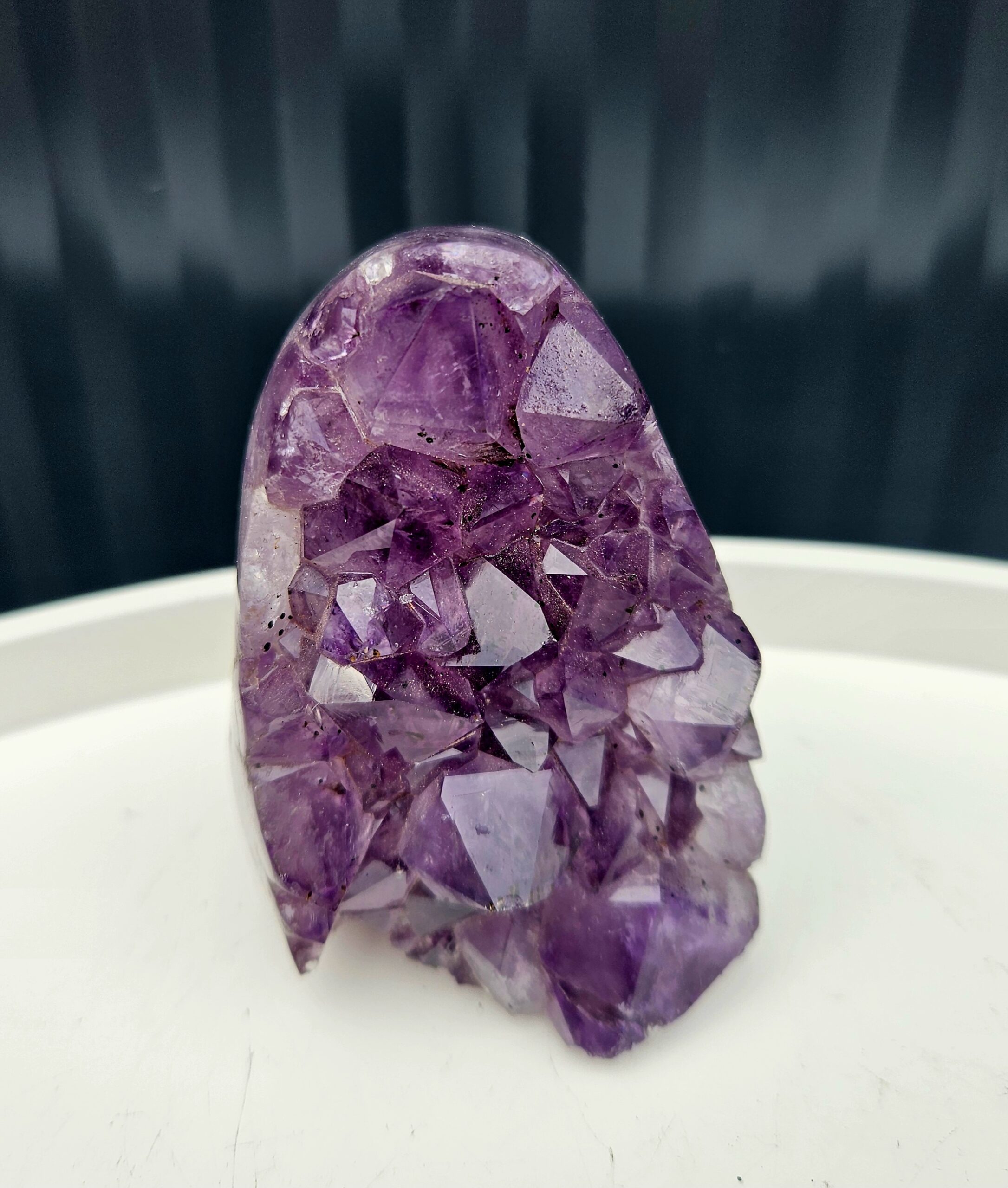 Tento krásny ametyst spája jemne leštenú formu s prirodzenou kryštálovou štruktúrou, ktorá vytvára nádherný kontrast medzi hladkým povrchom a trblietavými fialovými kryštálmi. Každý detail v sebe ukrýva jedinečnú kresbu prírody