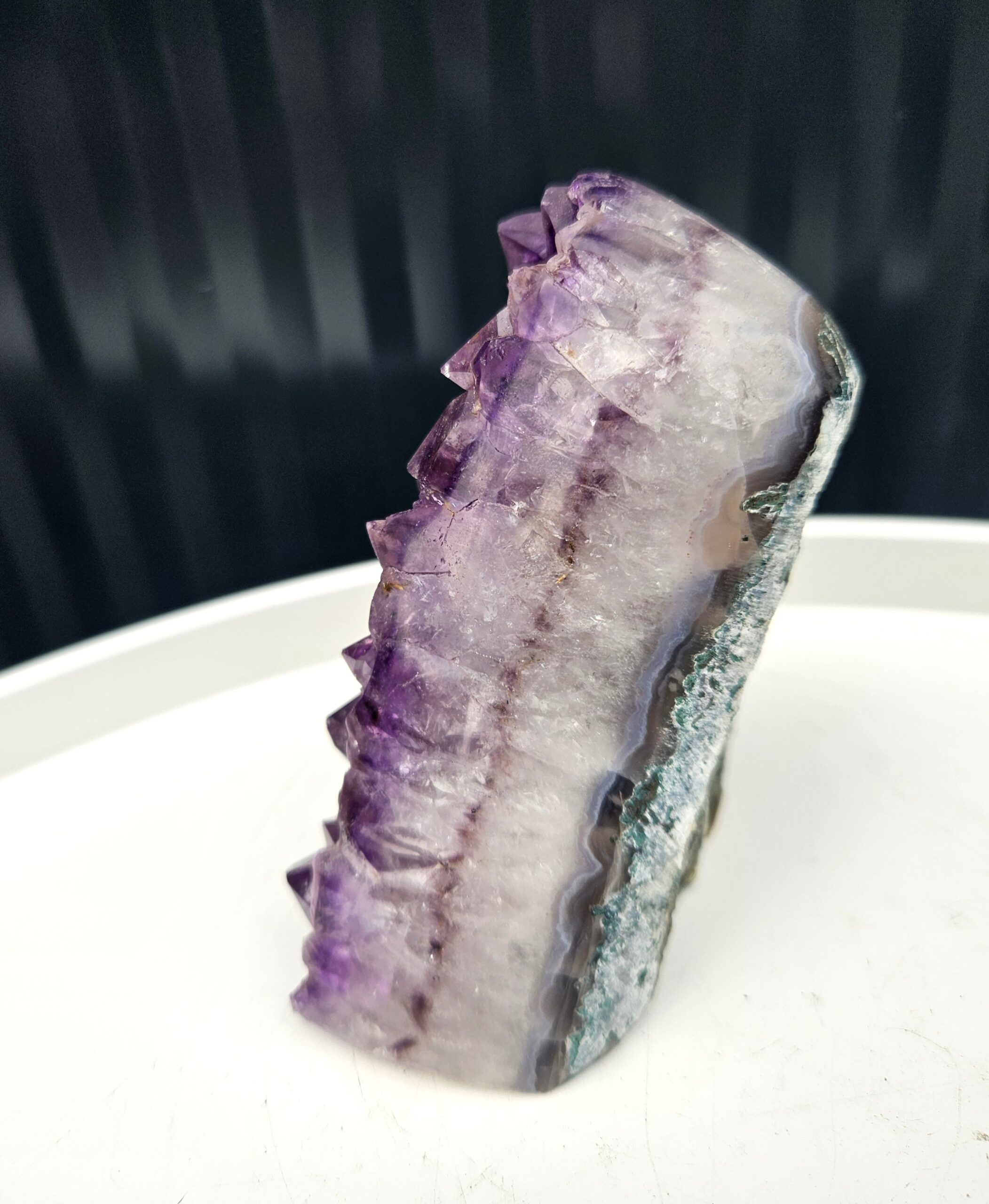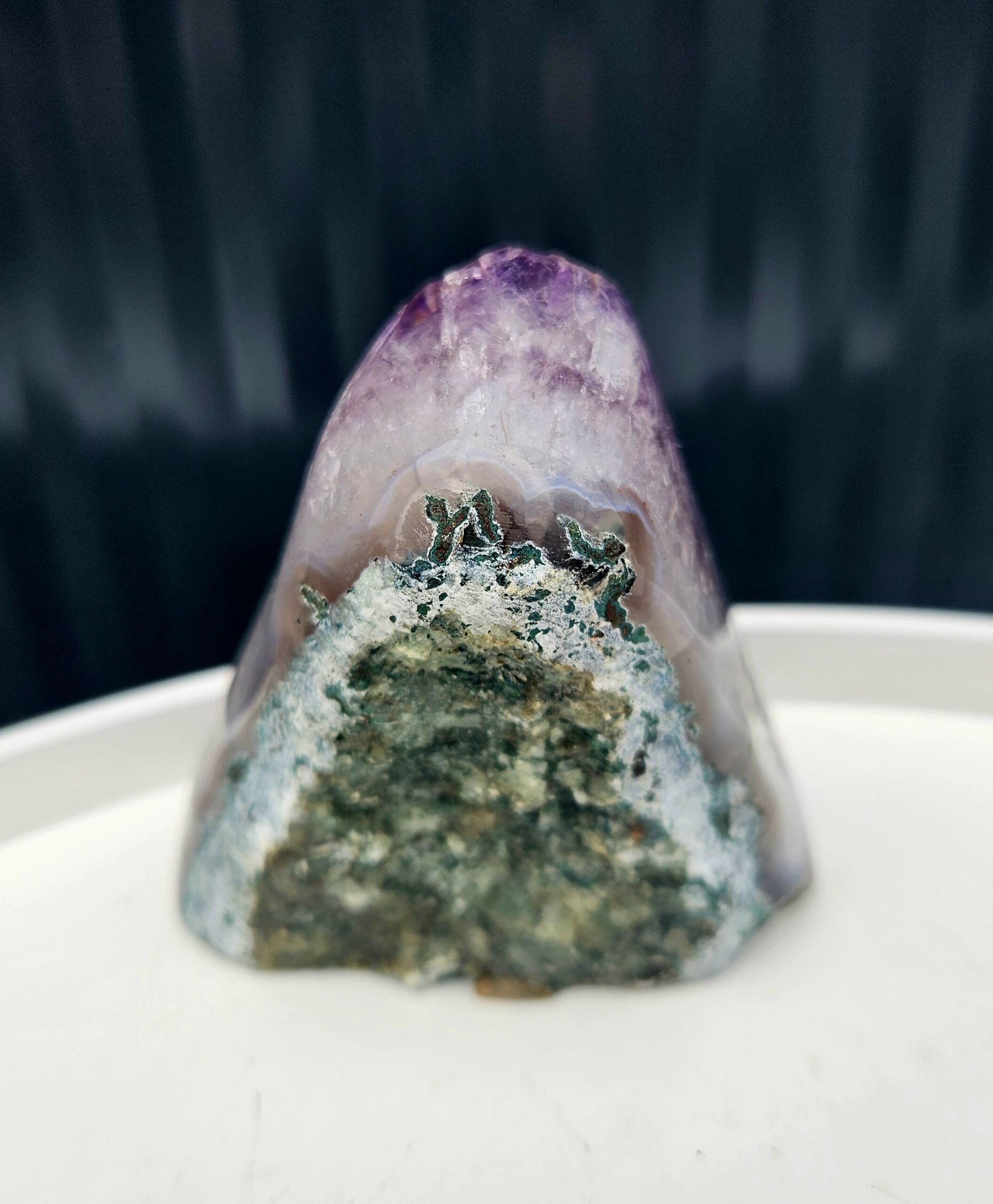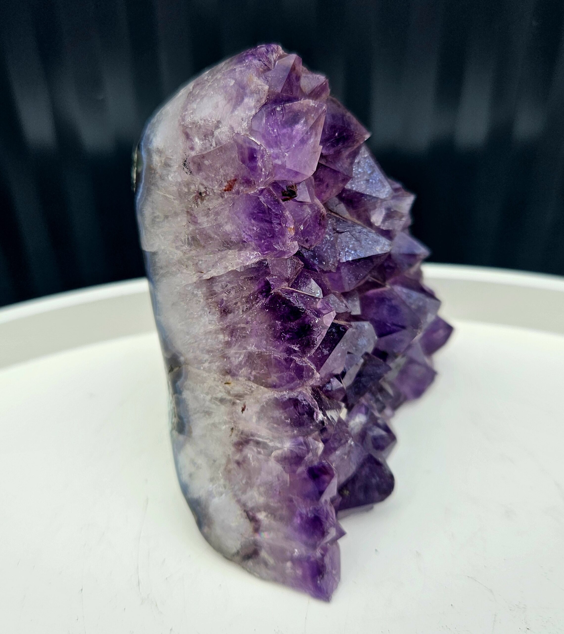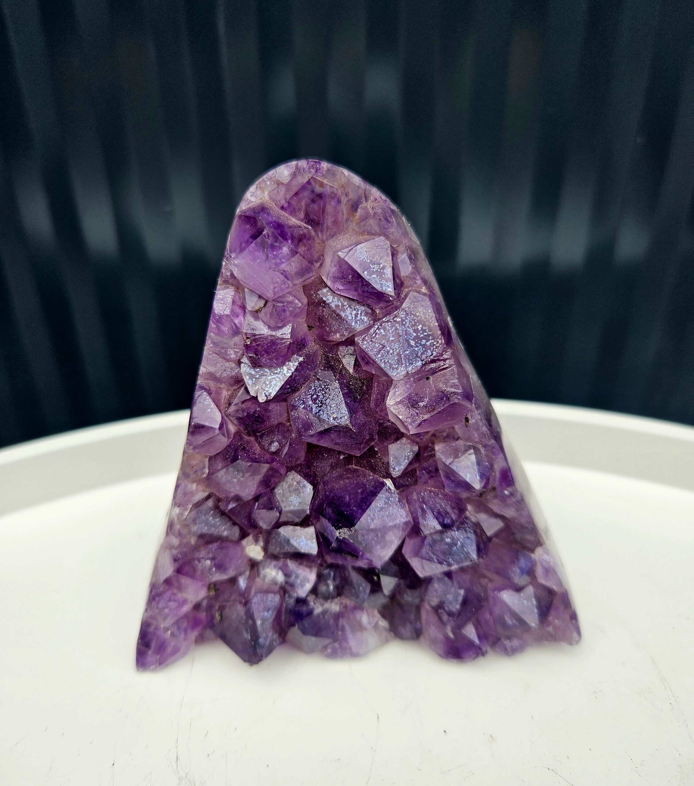 Tento krásny ametyst spája jemne leštenú formu s prirodzenou kryštálovou štruktúrou, ktorá vytvára nádherný kontrast medzi hladkým povrchom a trblietavými fialovými kryštálmi. Každý detail v sebe ukrýva jedinečnú kresbu prírody