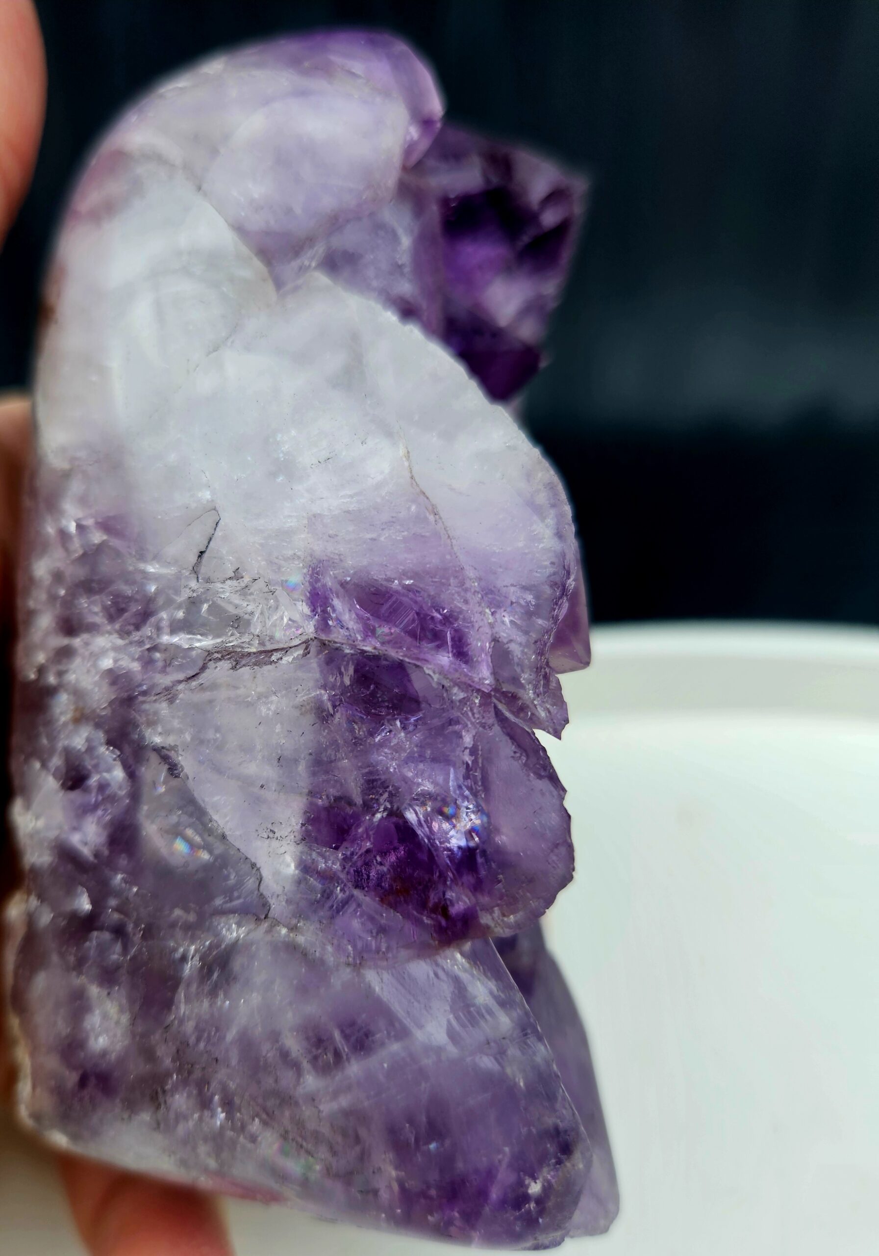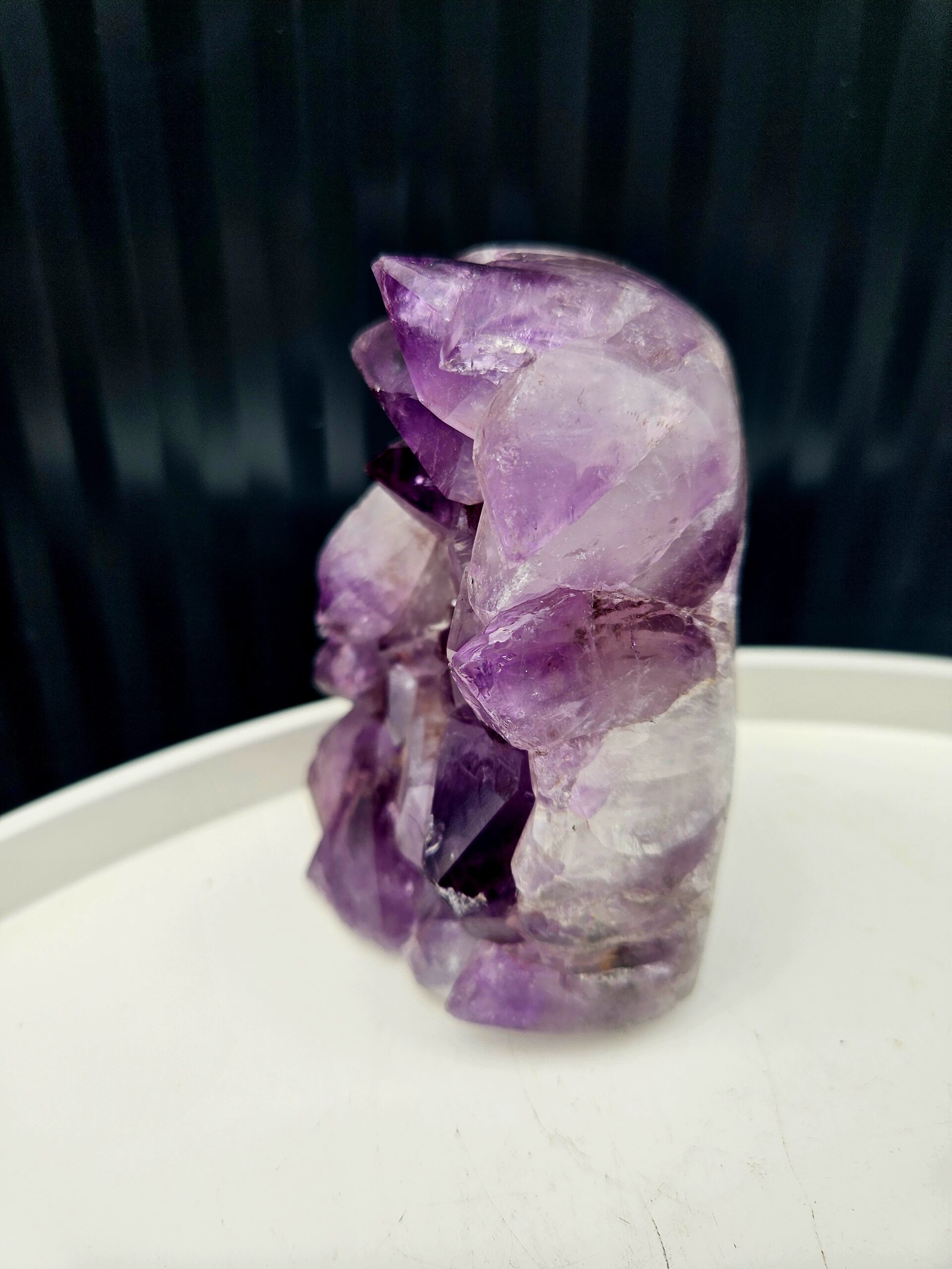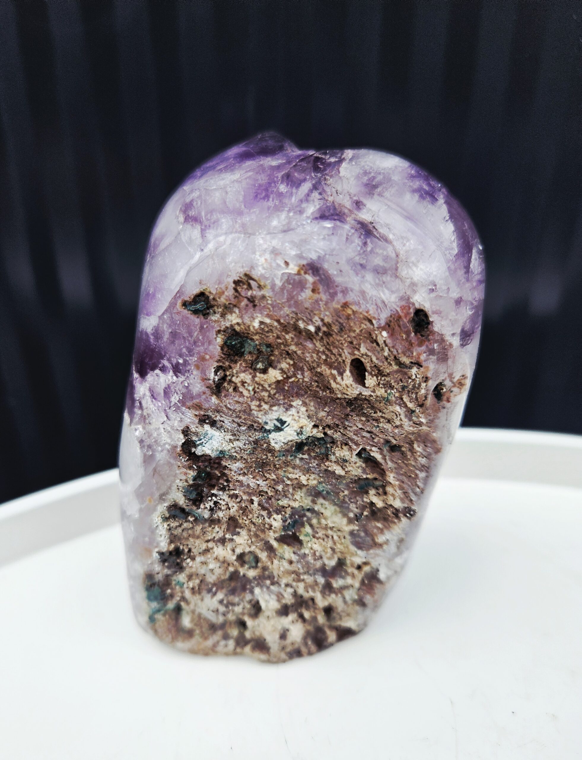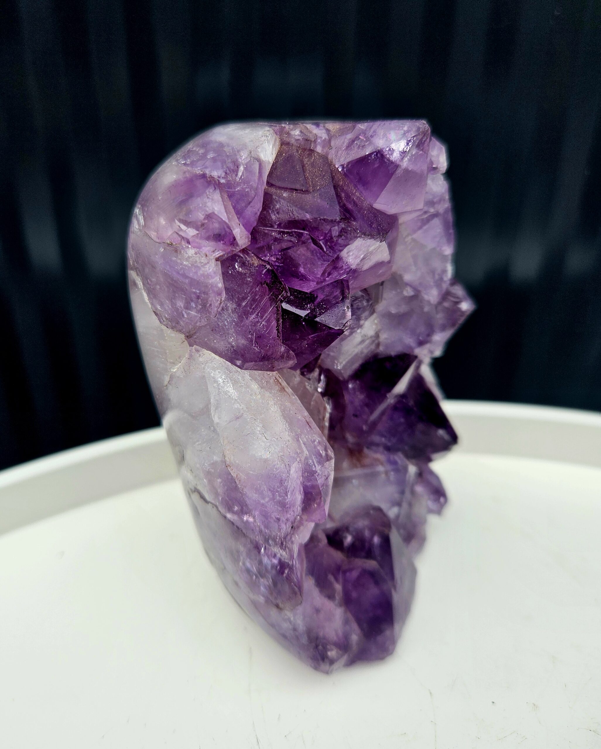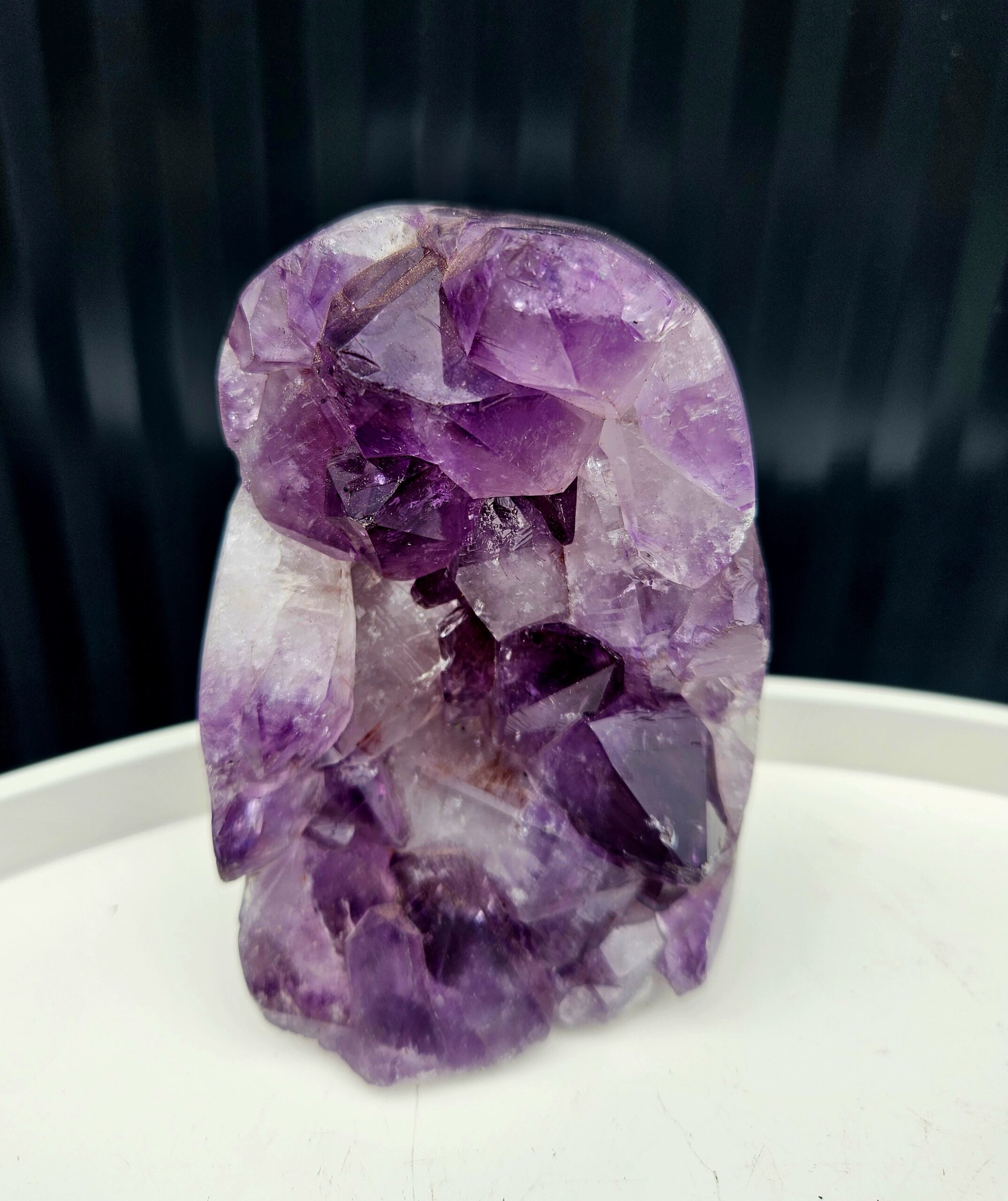 Tento krásny ametyst spája jemne leštenú formu s prirodzenou kryštálovou štruktúrou, ktorá vytvára nádherný kontrast medzi hladkým povrchom a trblietavými fialovými kryštálmi. Každý detail v sebe ukrýva jedinečnú kresbu prírody
