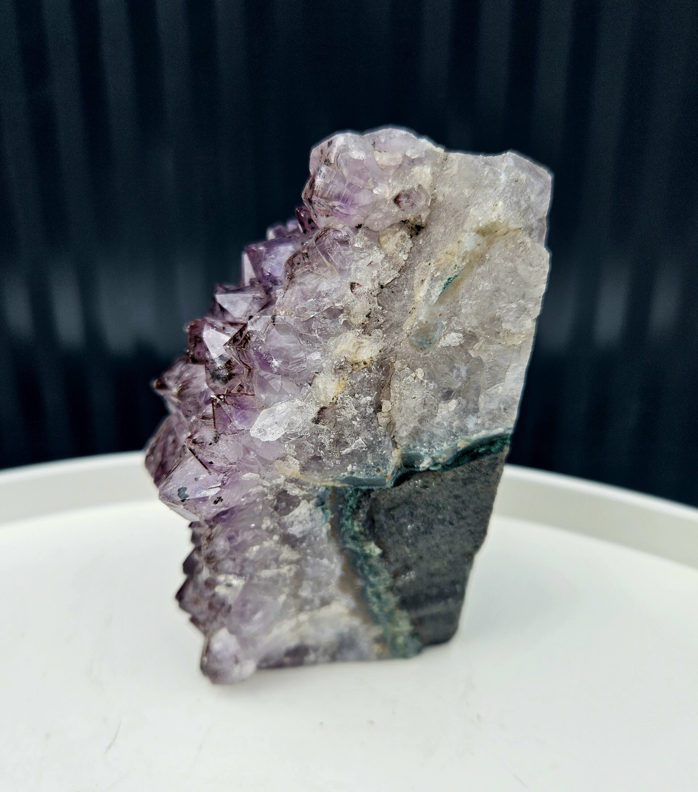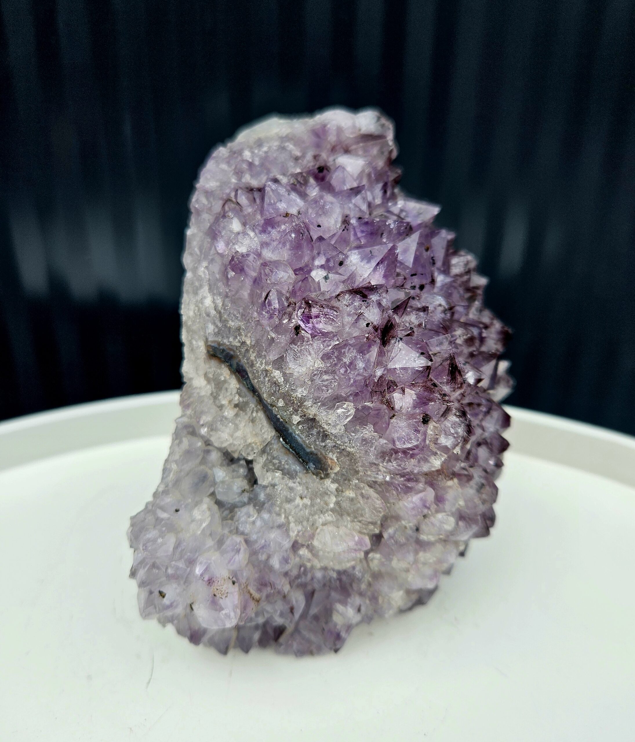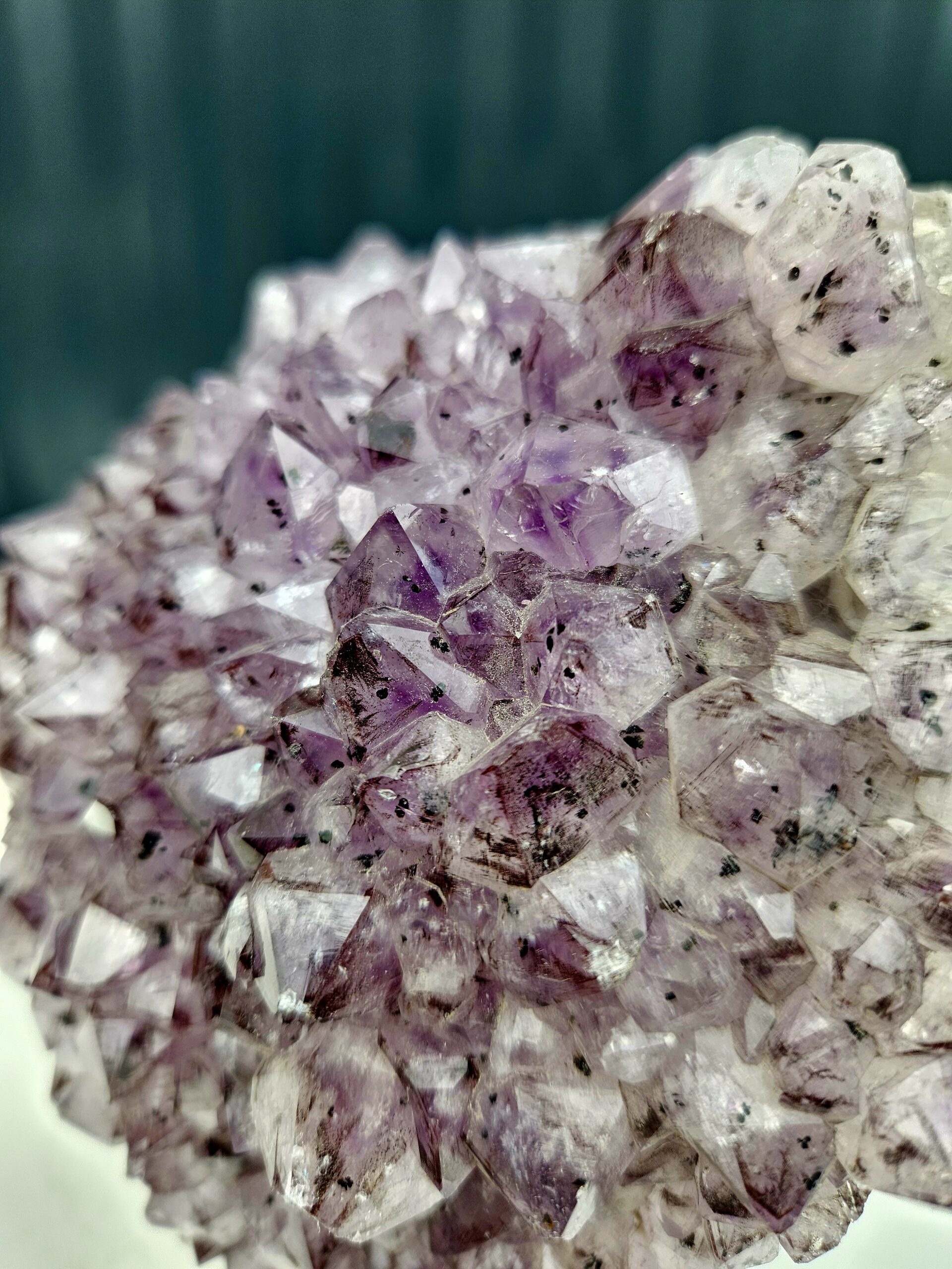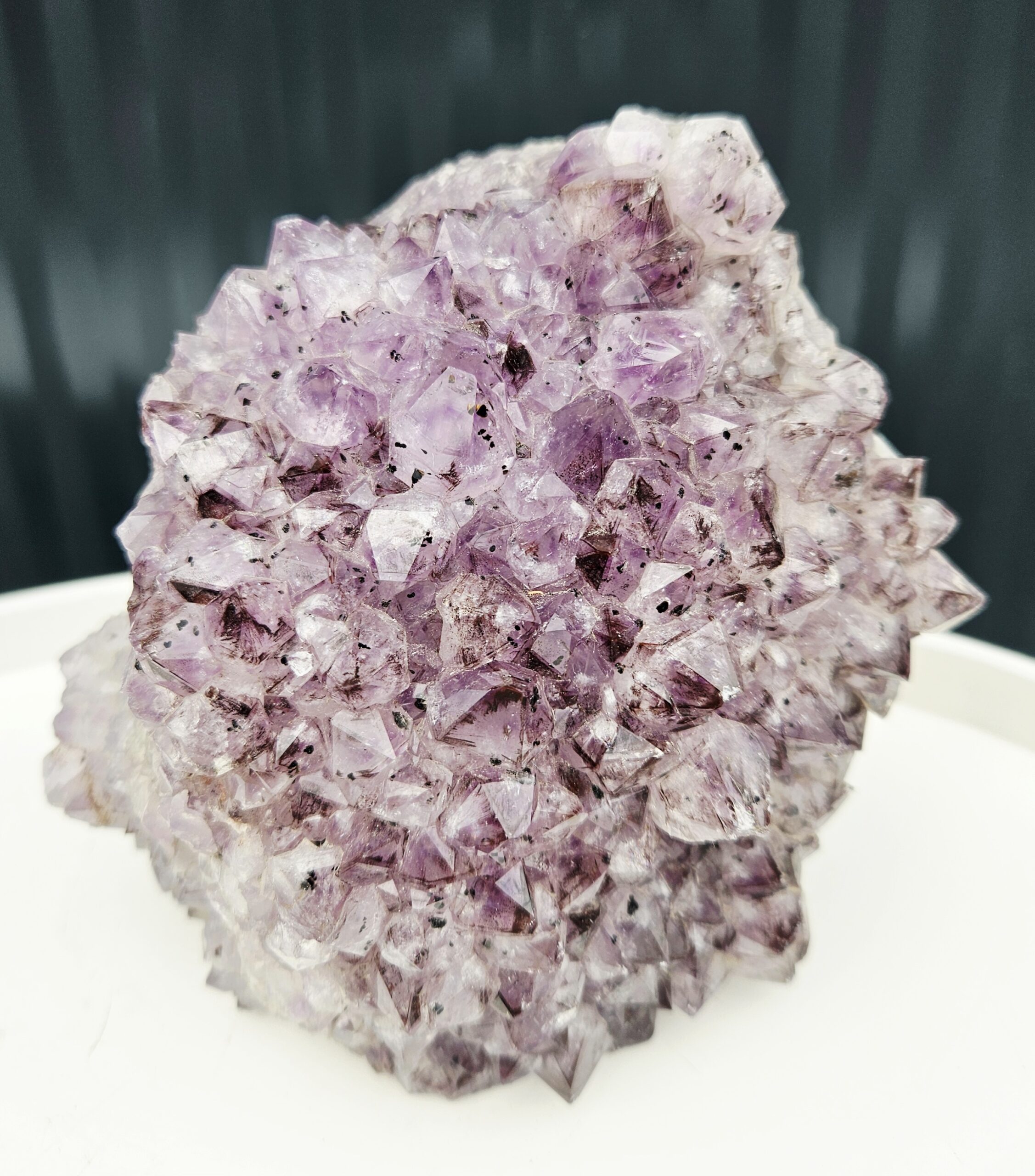 Tento jedinečný ametyst vás zaujme na prvý pohľad svojou jemnou fialovou farbou a zaujímavými tmavými bodkami, ktoré mu dodávajú úplne originálny charakter