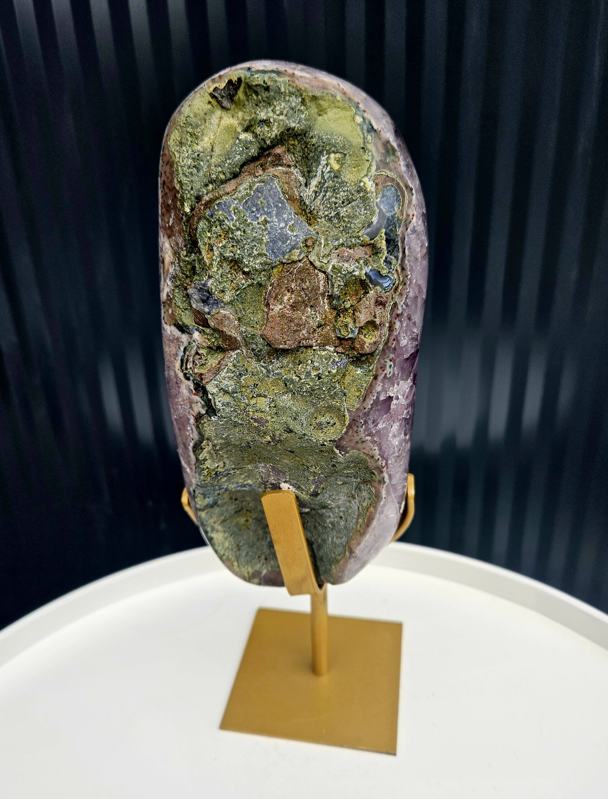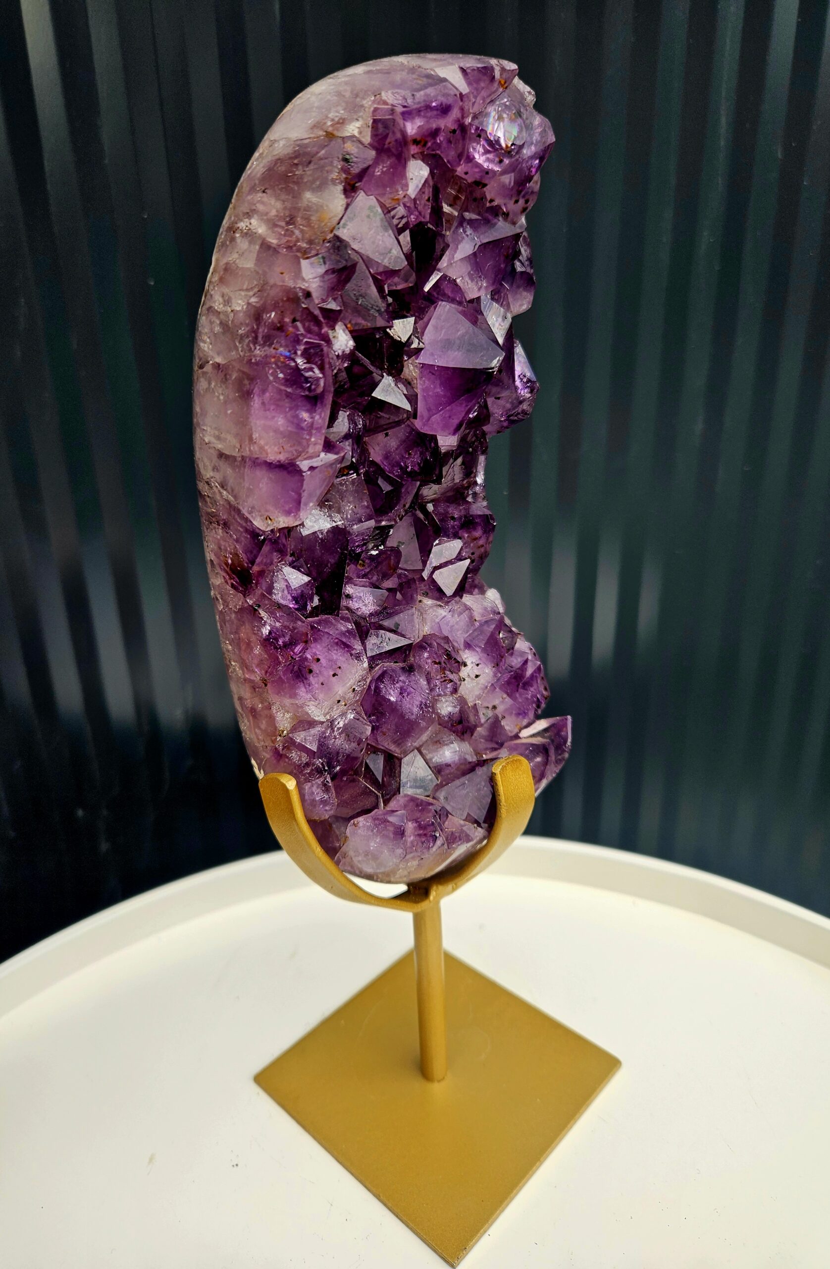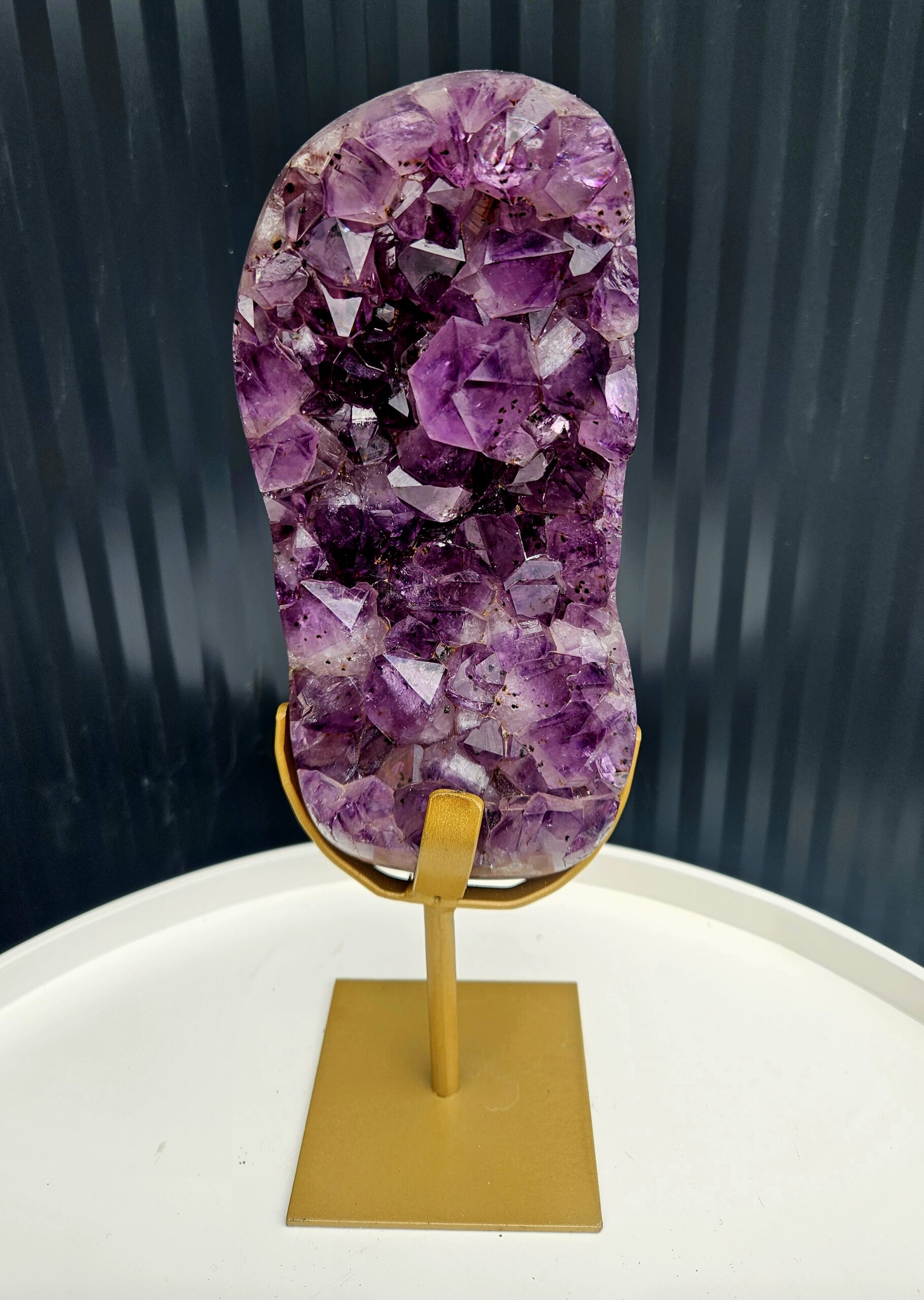 Elegantné spojenie surovej prírody a luxusného zlatého stojana – ideálny doplnok do interiéru alebo výnimočný darček. Ametyst navyše prináša pokoj, harmóniu a ochrannú energiu do priestoru.