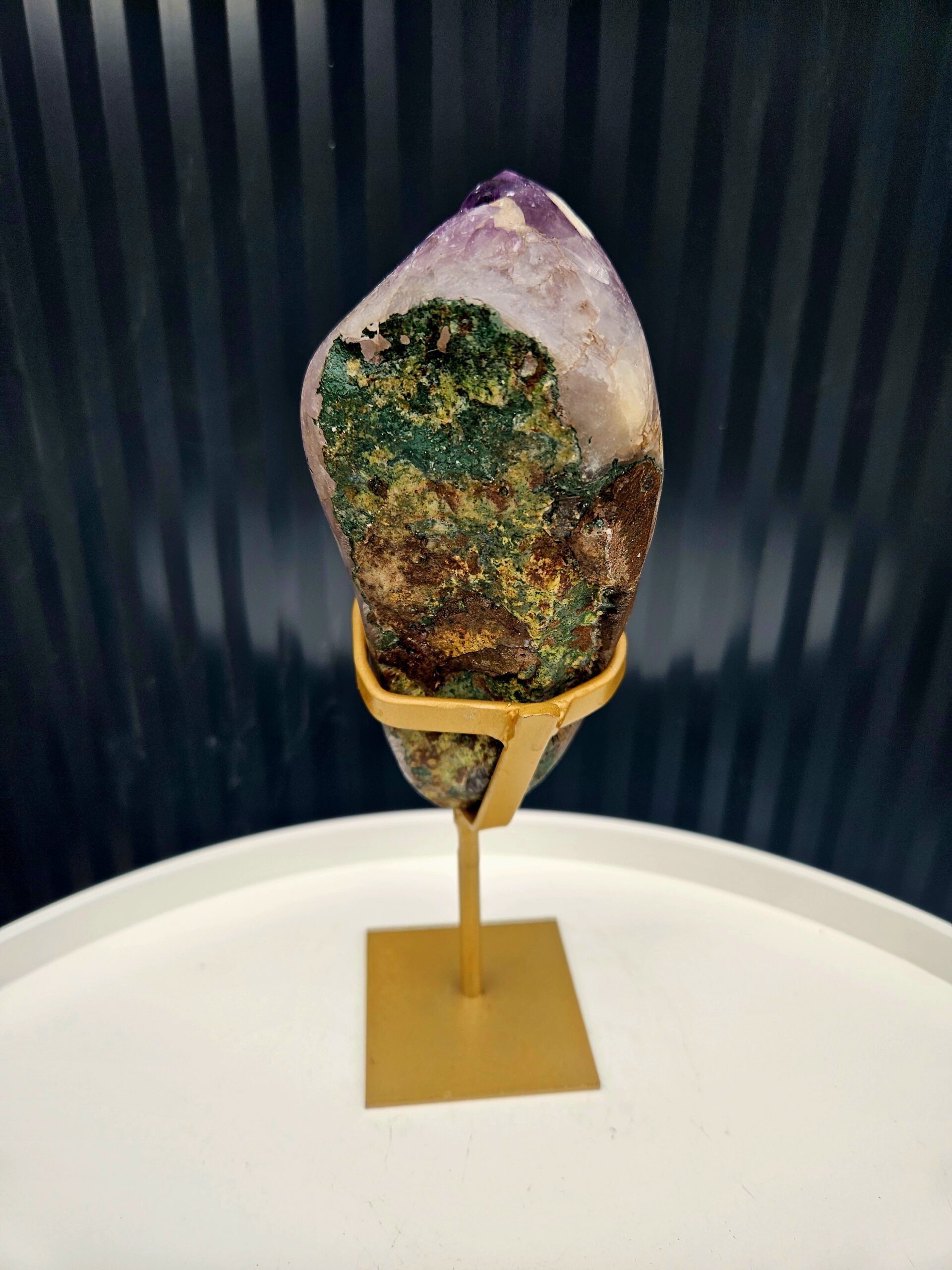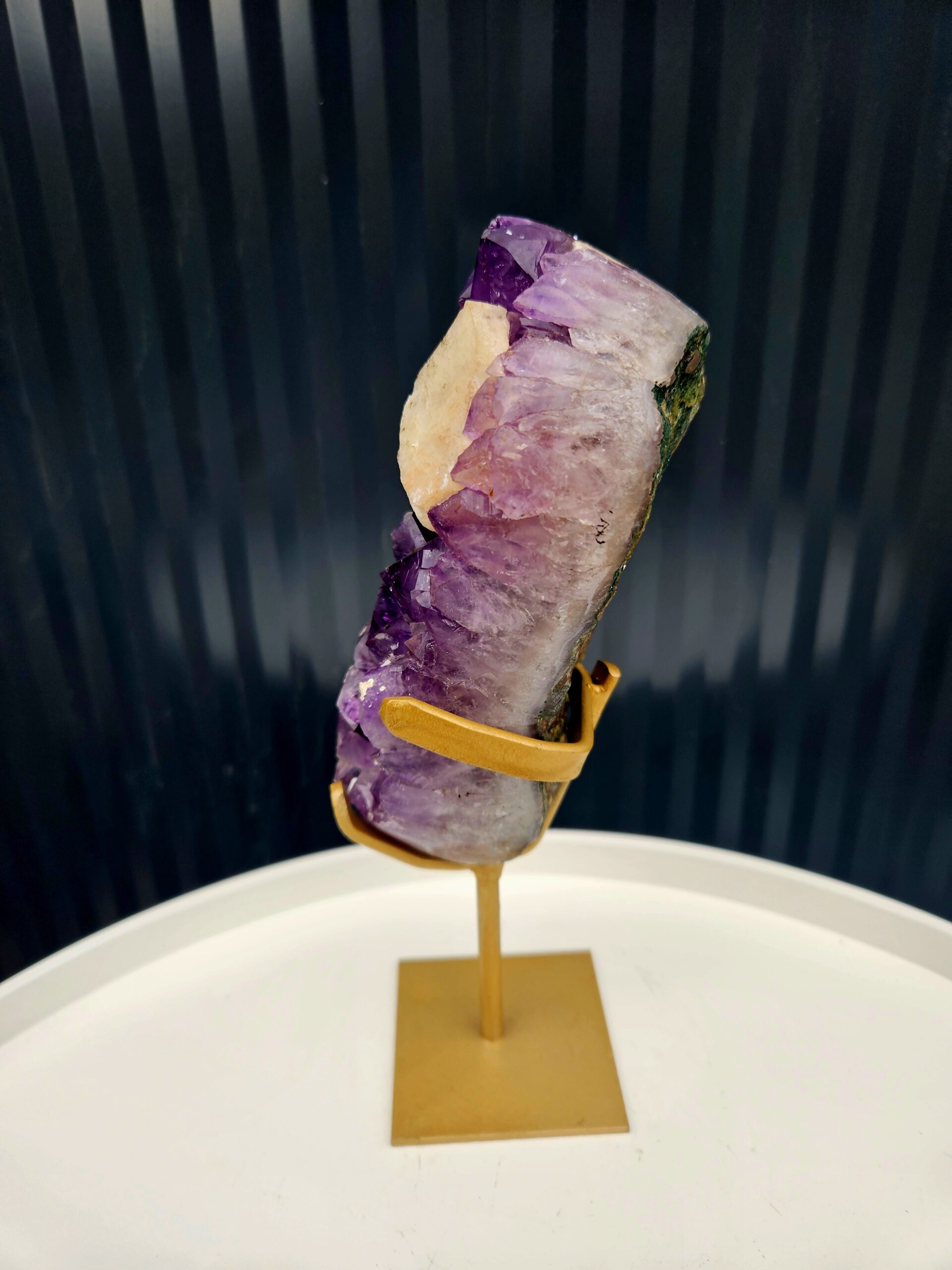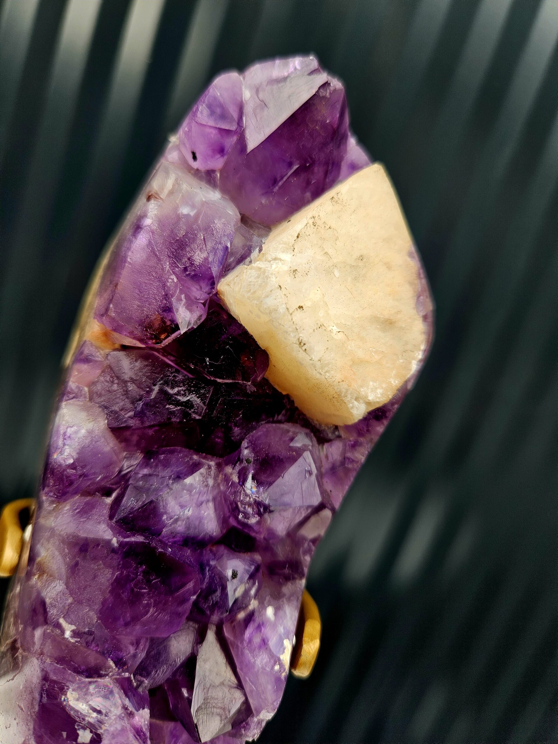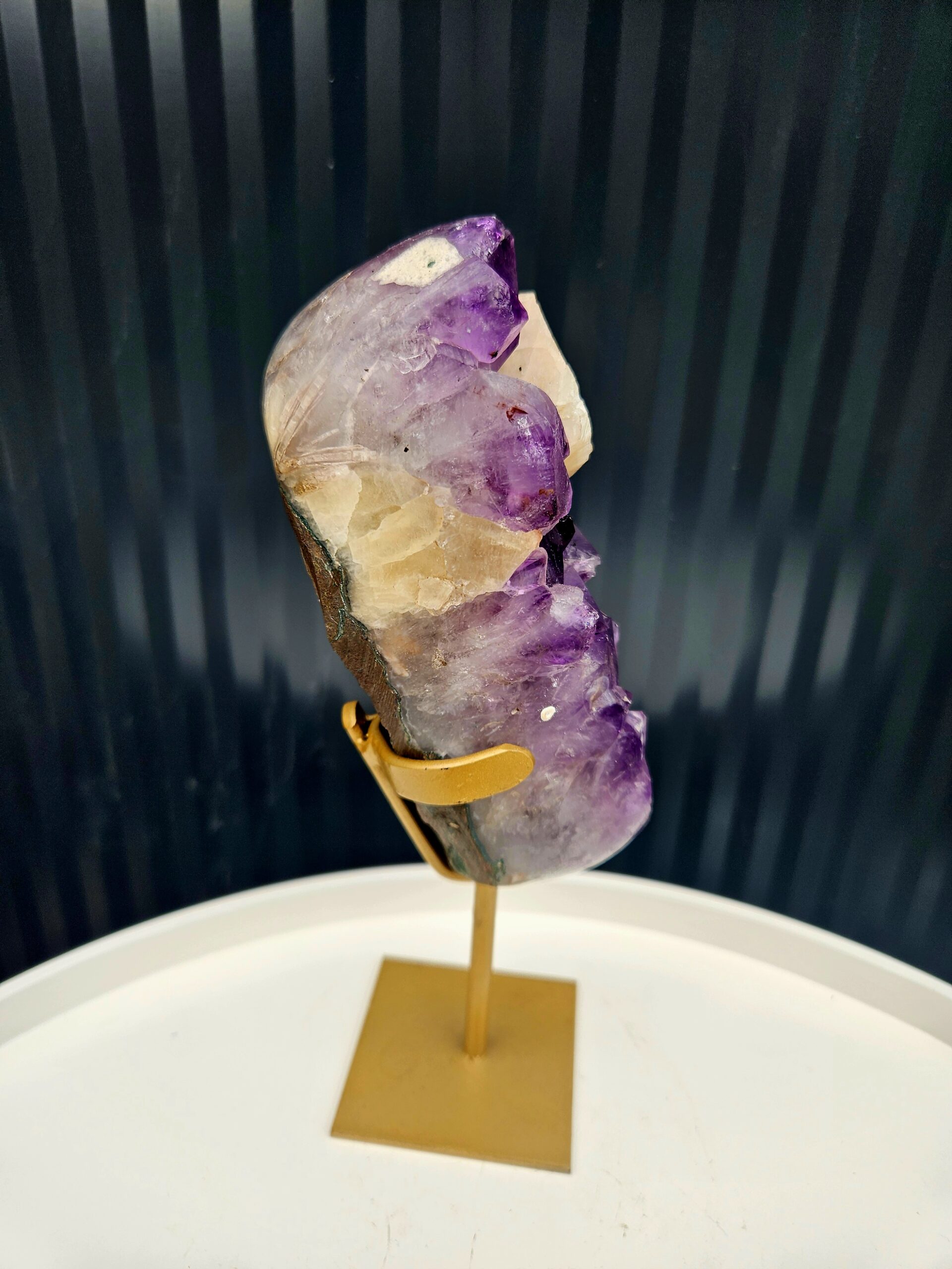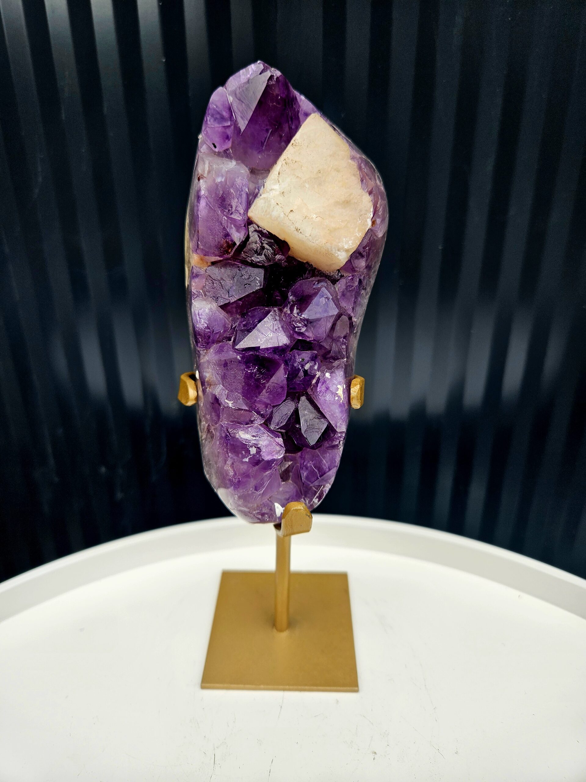 💜 Ametyst s výrazným kalcitom na zlatom stojane