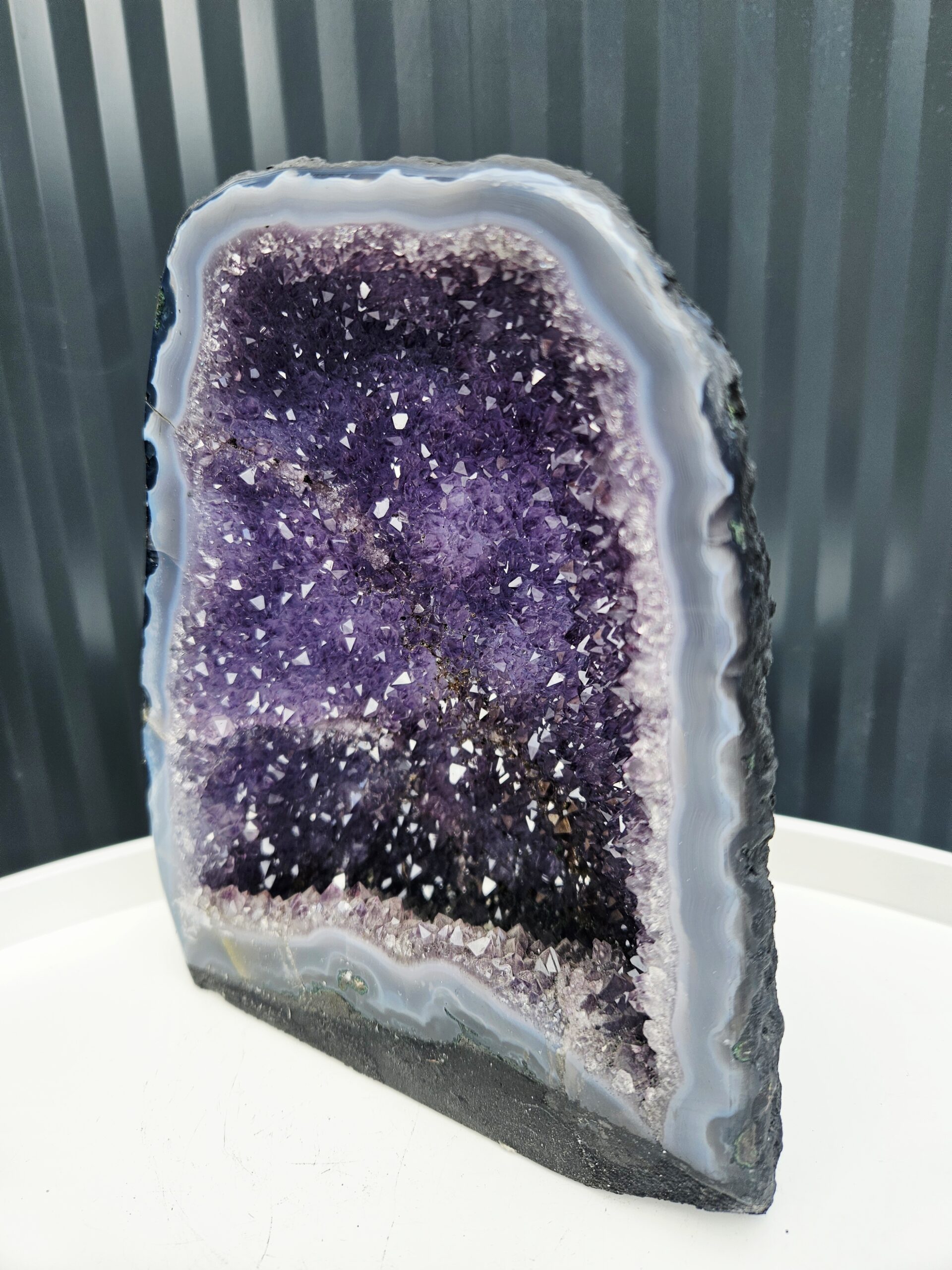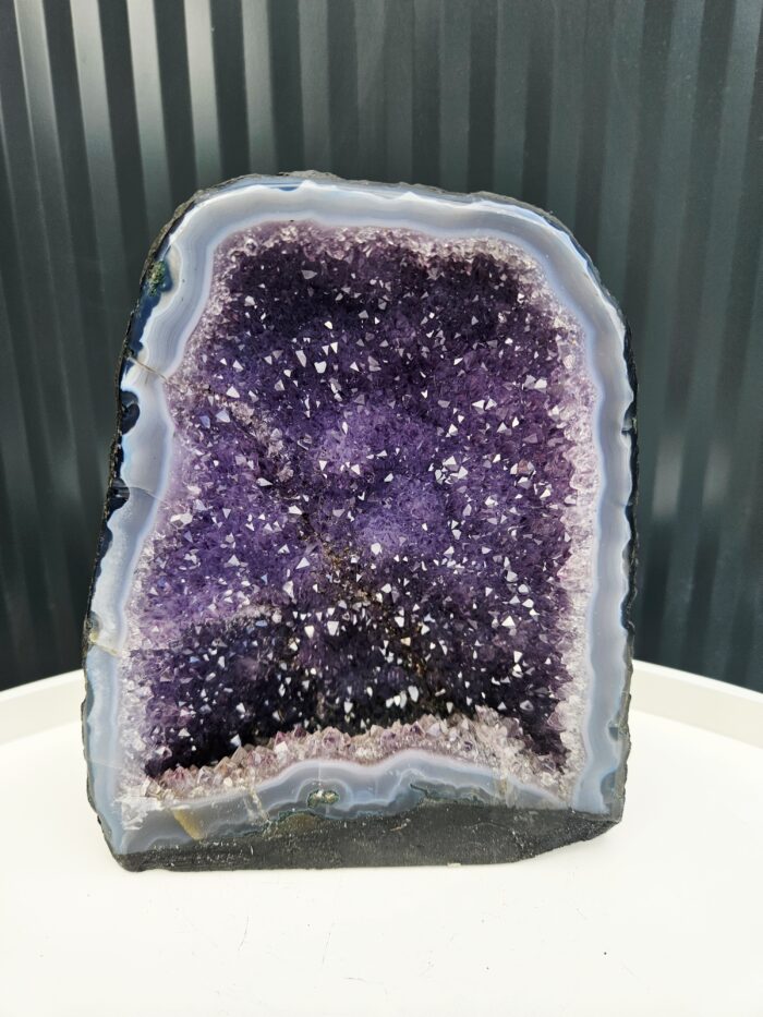 Sýto fialové jadro je lemované výrazným achátovým pásovaním v jemných sivomodrých tónoch, ktoré vytvára nádherný kontrast a dodáva kúsku luxusný vzhľad. Spodná časť s tmavšími kryštálmi pridáva hĺbku a zaujímavý vizuálny efekt ✨