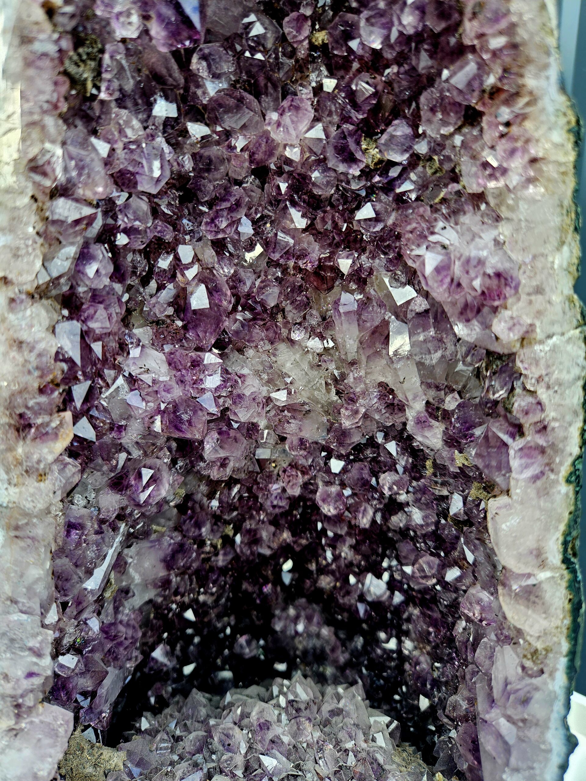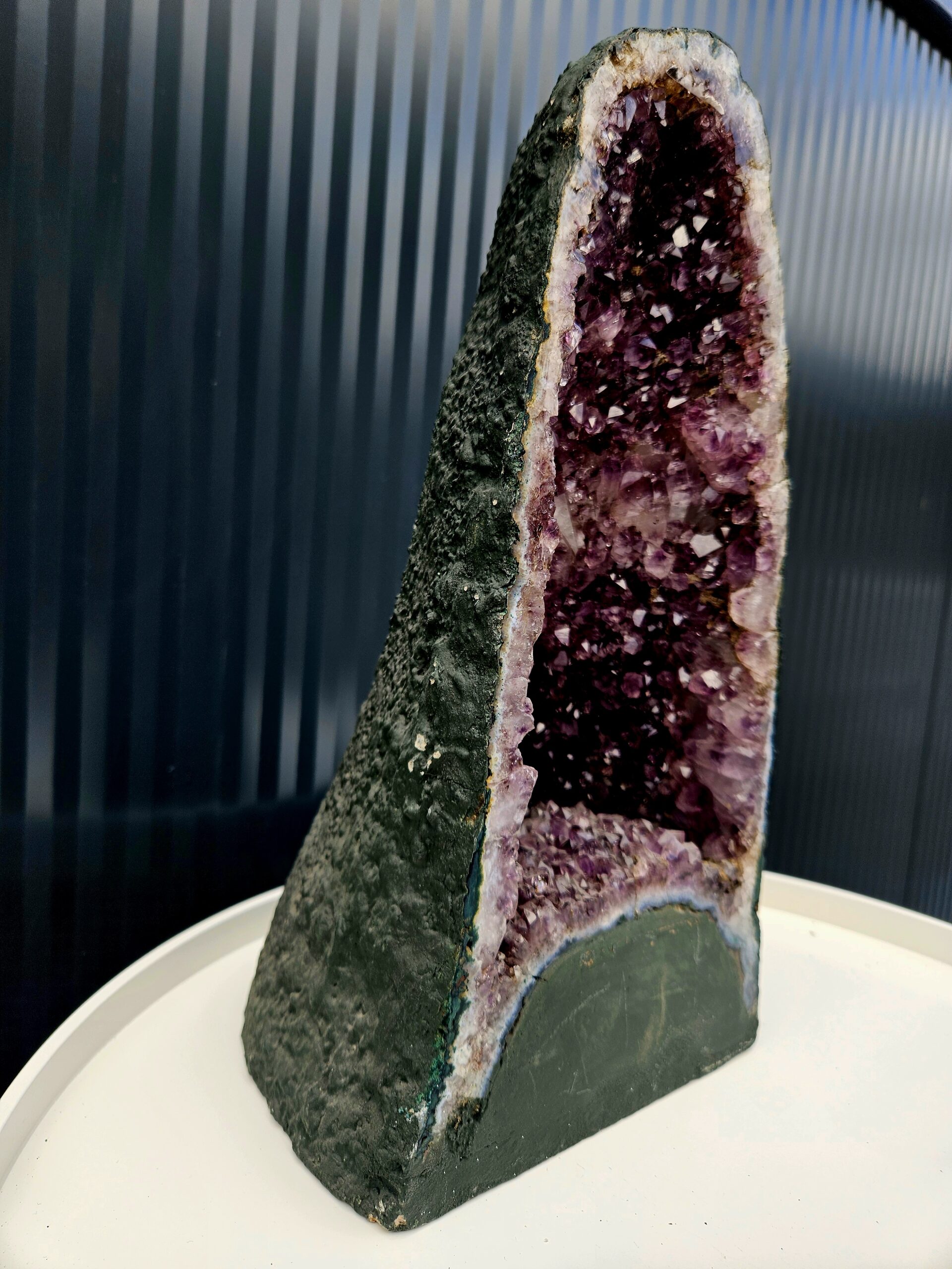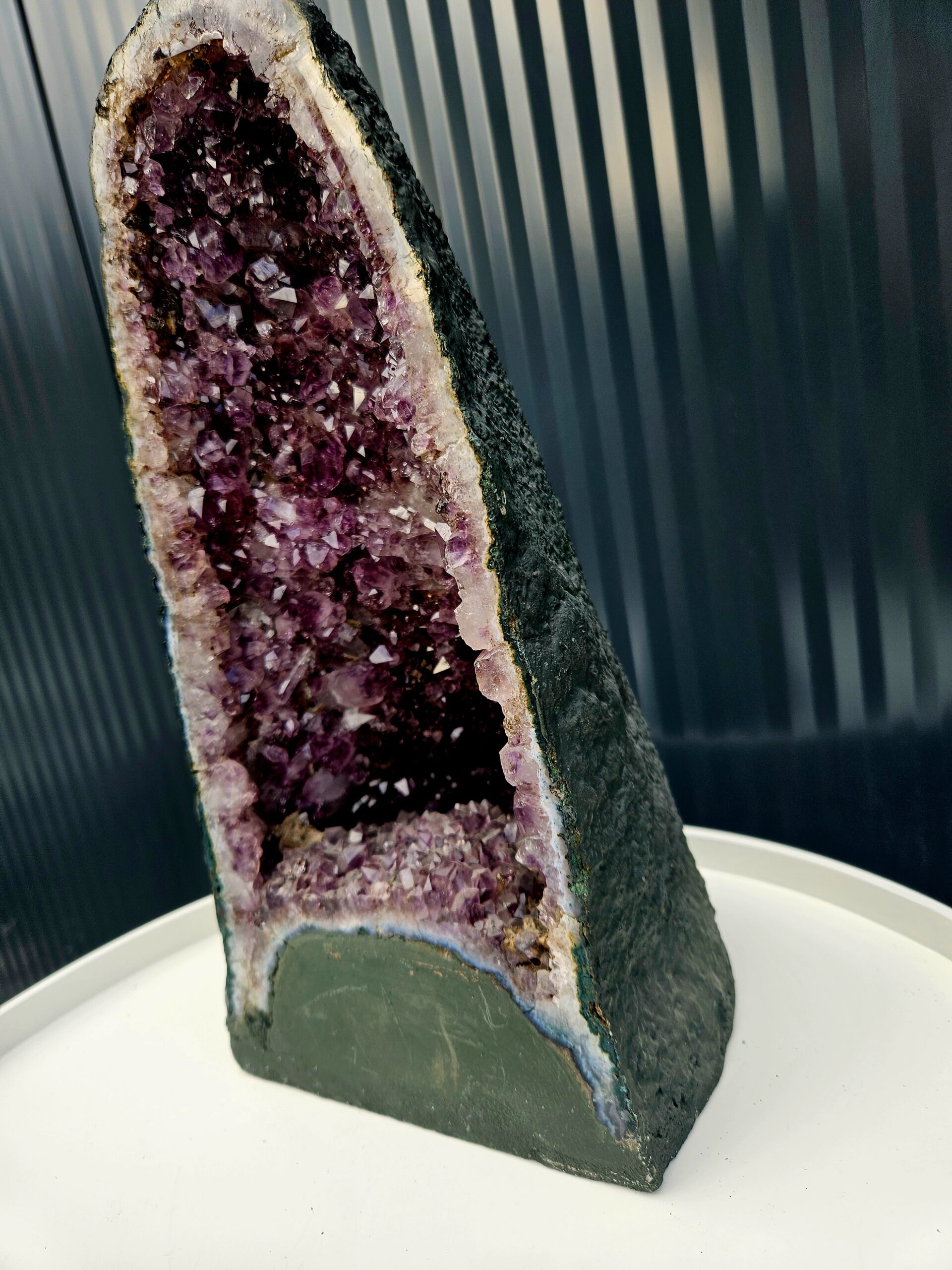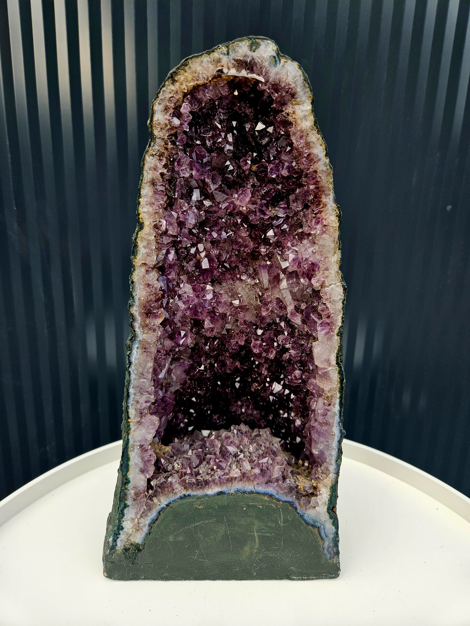 Vysoký „jaskynný“ tvar ukrýva hlboké, sýto fialové kryštály, ktoré sa nádherne lesknú a vytvárajú dojem tajomného vnútorného priestoru. Okraje sú lemované svetlými vrstvami kremeňa a jemným achátovým pásovaním, čo ešte viac zvýrazňuje kontrast medzi surovým povrchom a trblietavým vnútrom ✨