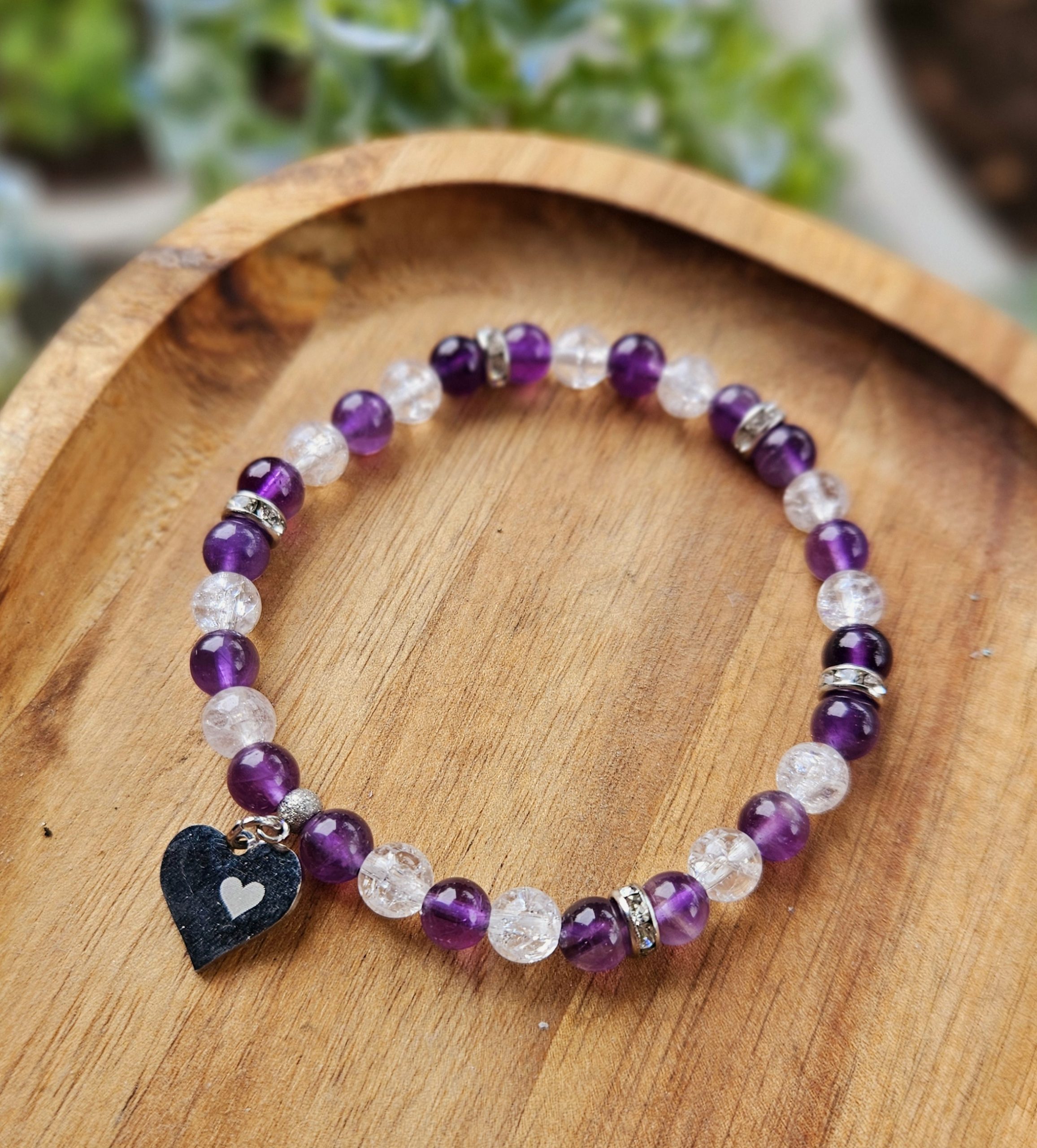 Ametyst + Krištáľ náramok 6mm Srdiečko