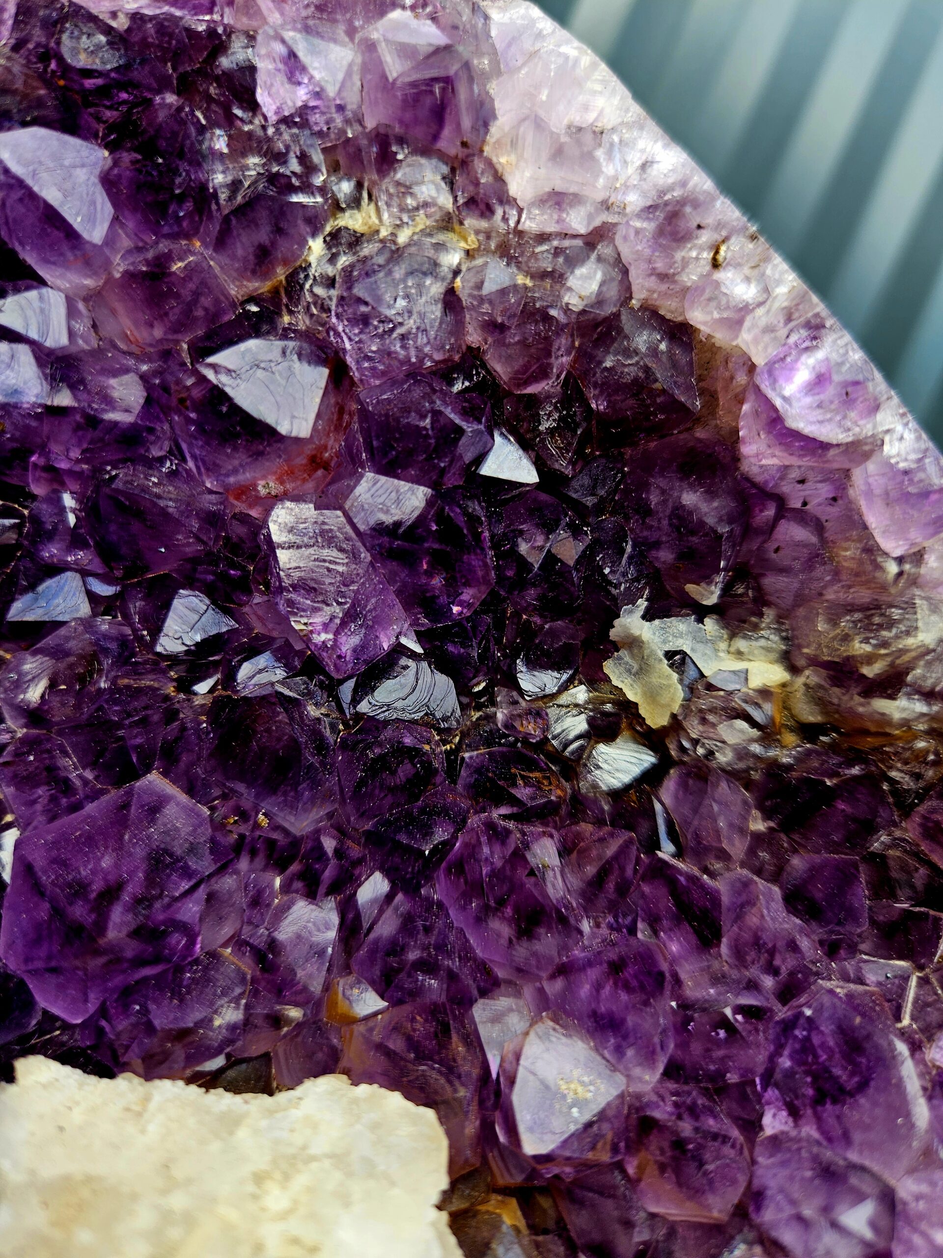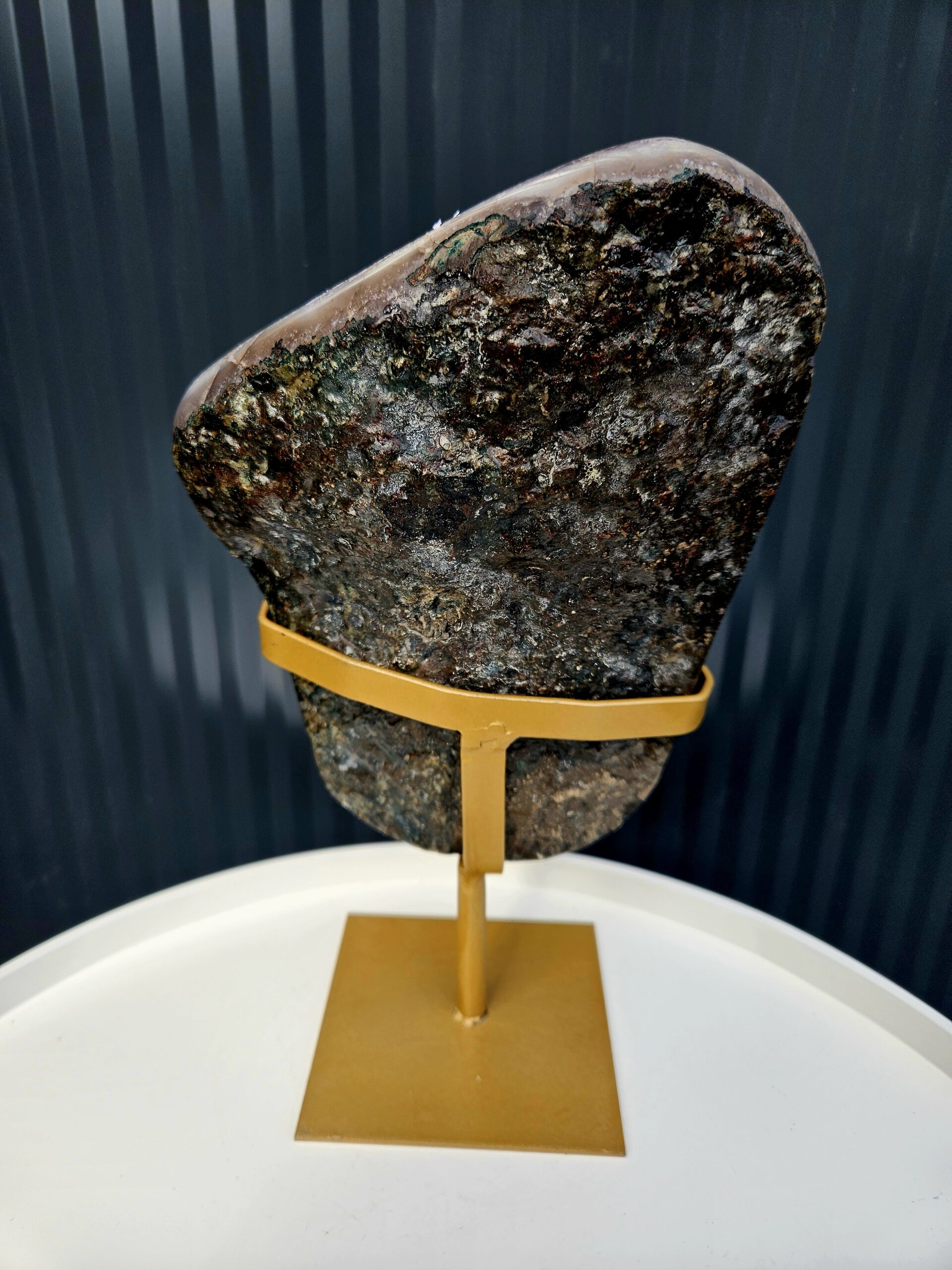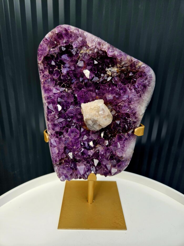 Dominantným prvkom tohto kúsku je výrazný kalcit umiestnený priamo v strede – unikátny detail, ktorý robí tento ametyst skutočne zberateľským skvostom. Kontrast medzi fialovým ametystom a svetlým kalcitom vytvára harmonickú, no zároveň výraznú kompozíciu.