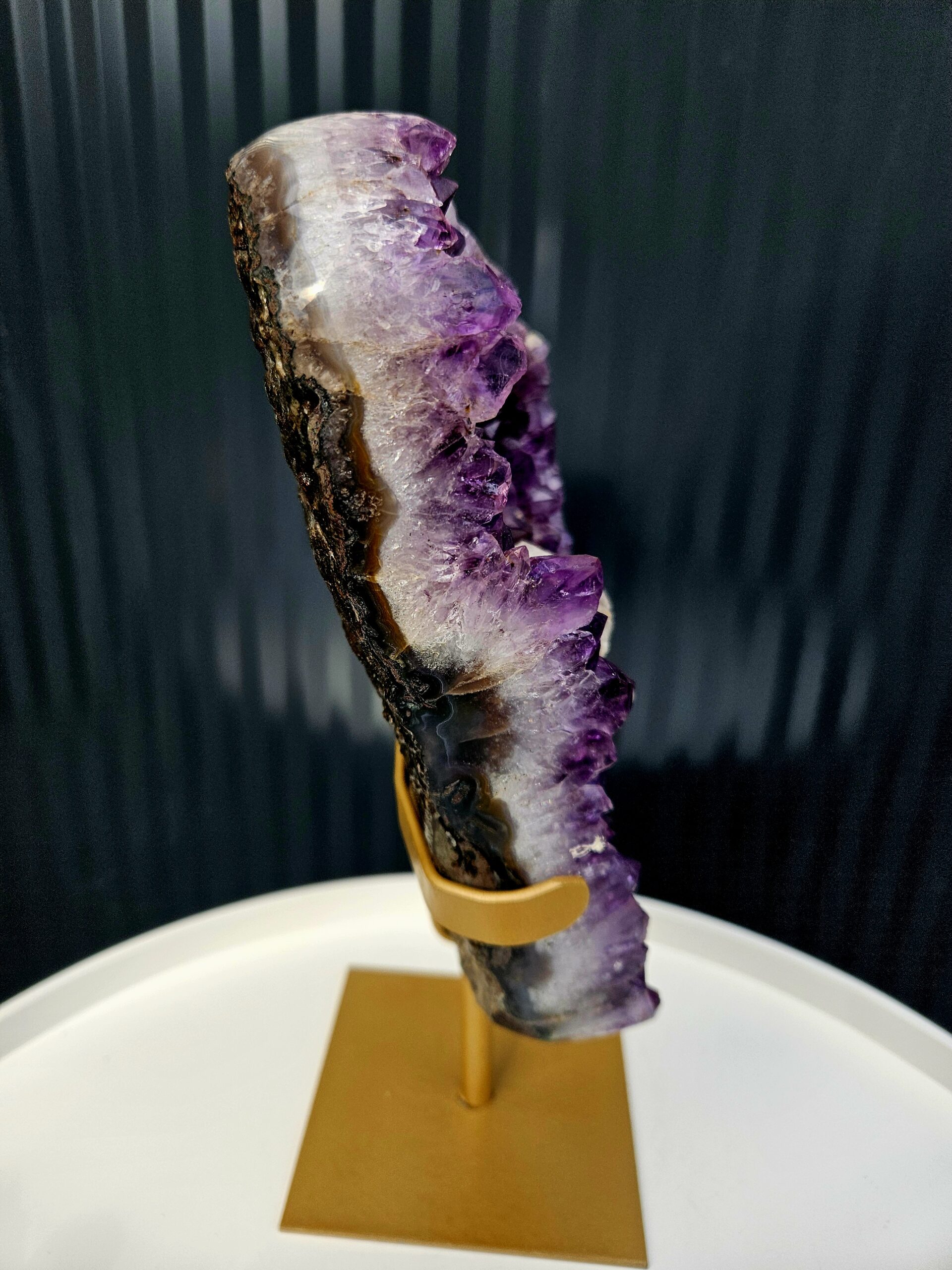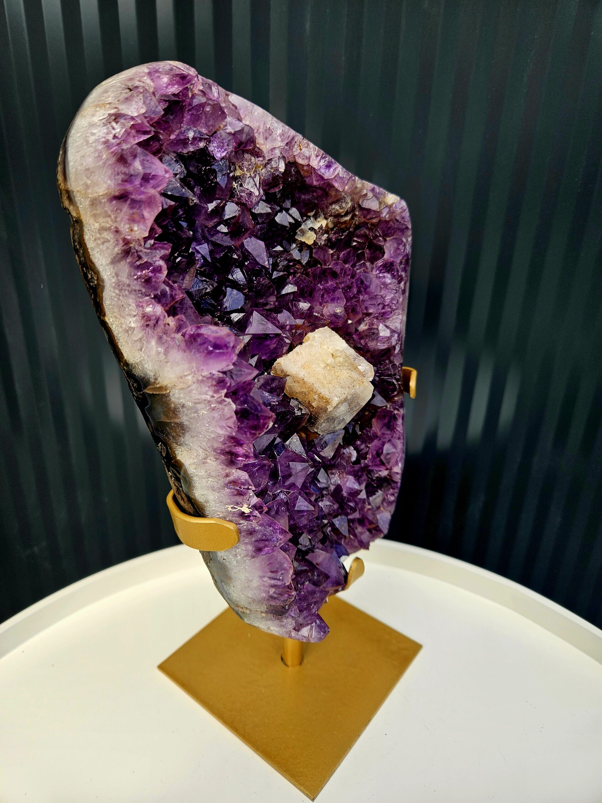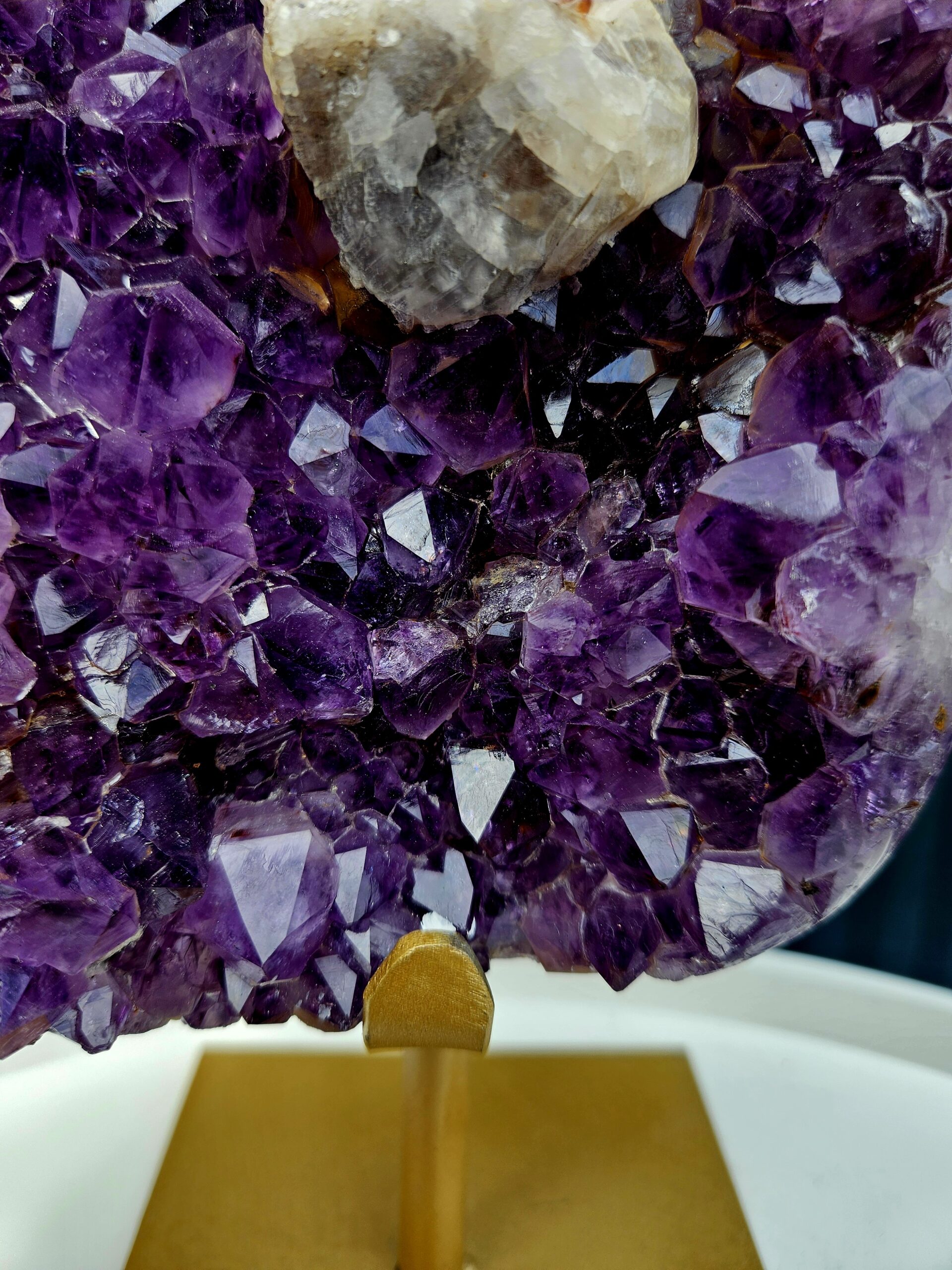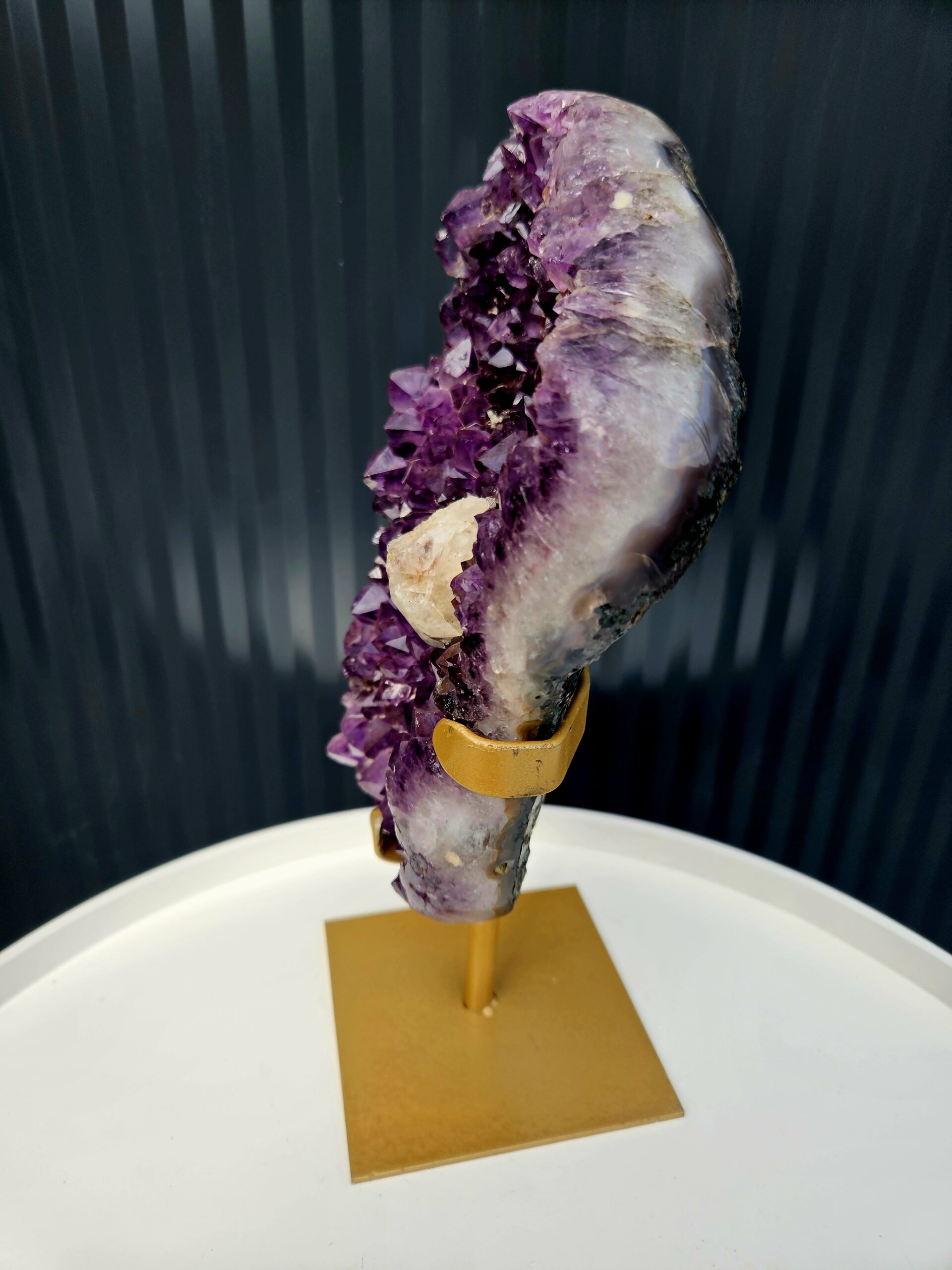 Zberateľský ametyst AAA s výrazným kalcitom na zlatom stojane