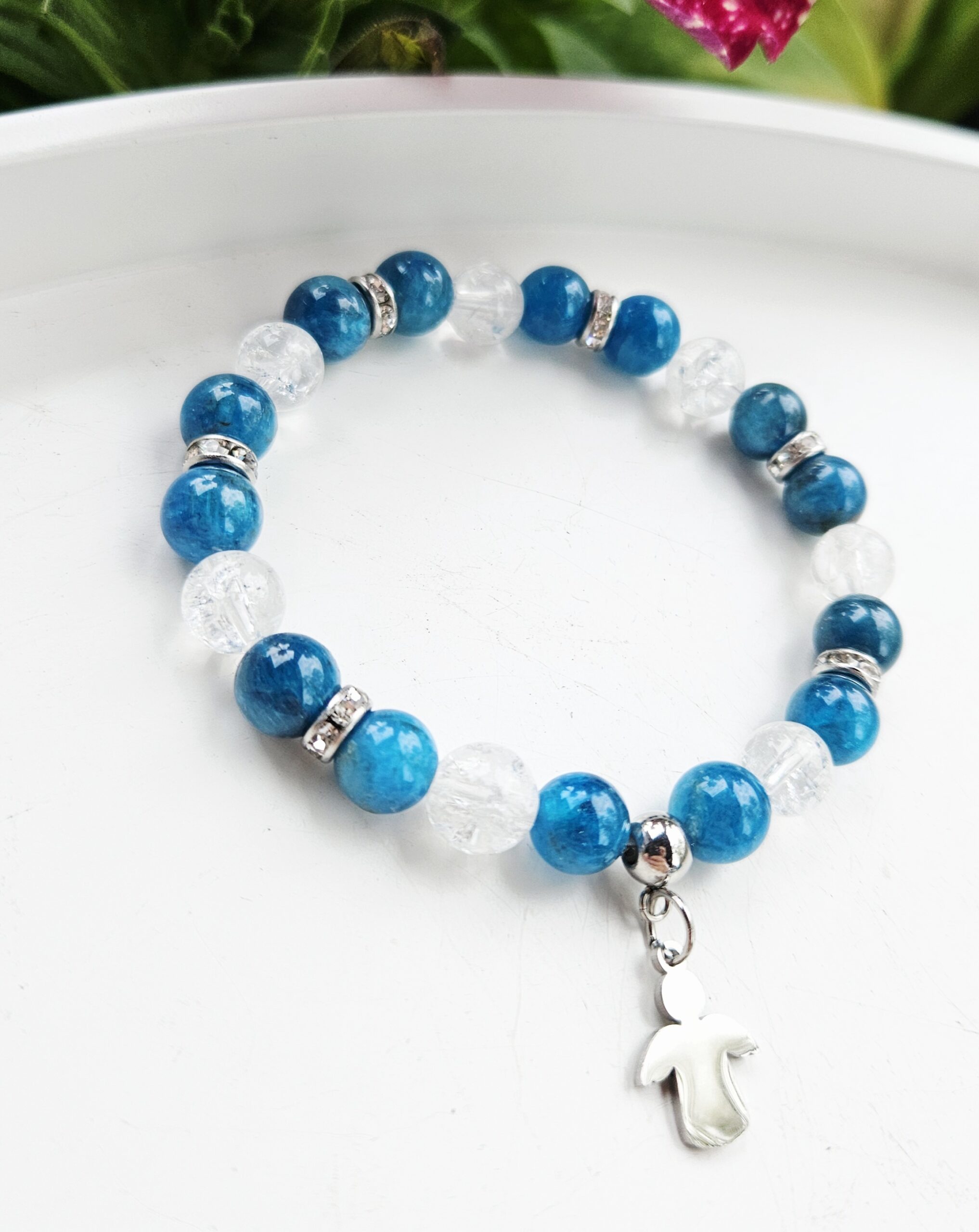 Harmonický náramok z kombinácie apatitu a krištáľu, ktorý spája krásu modro-tyrkysových odtieňov s jemnou čistotou číreho kameňa. Elegantné komponenty z chirurgickej ocele a štýlový prívesok dodávajú náramku jedinečný vzhľad.