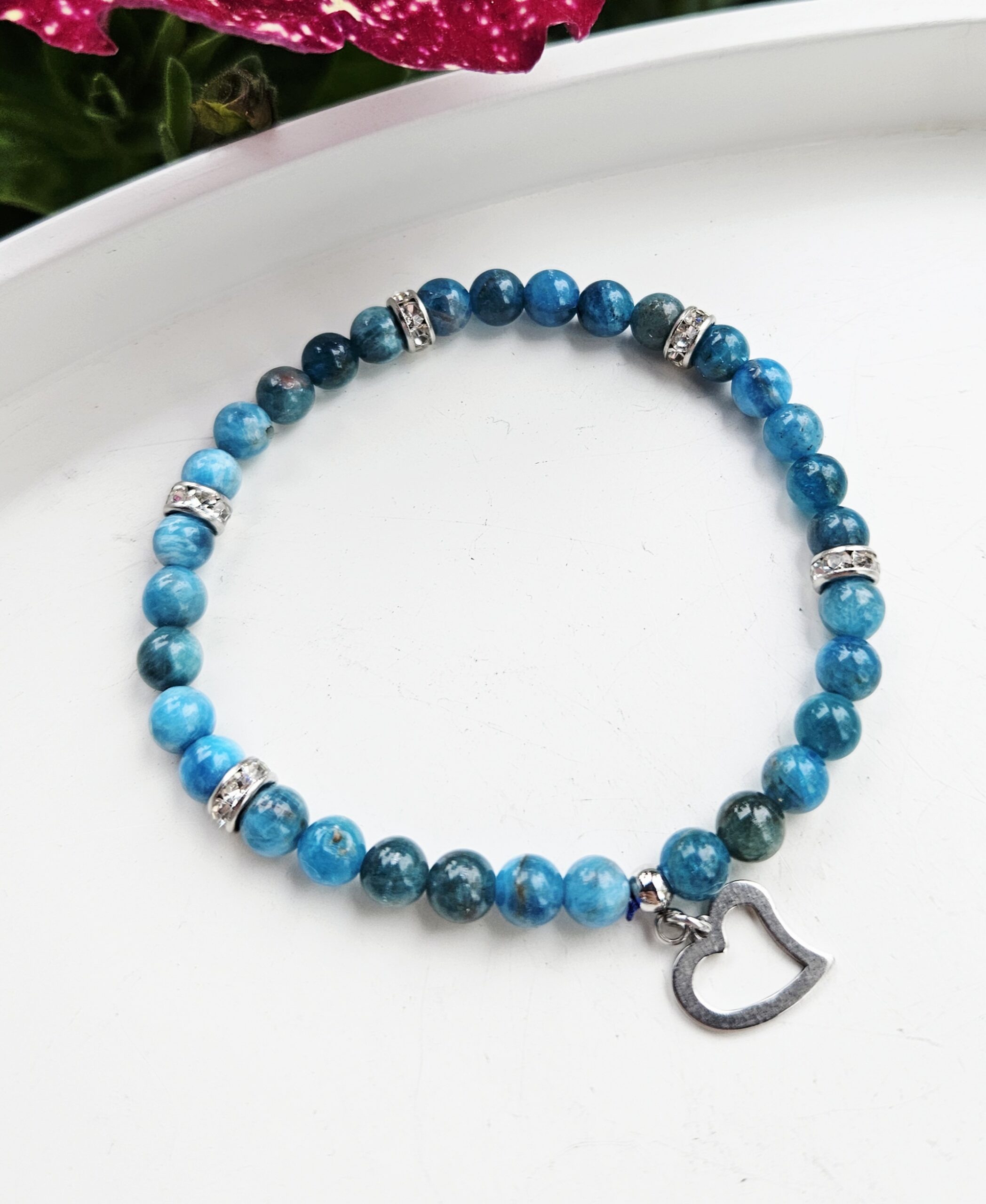 Elegantný náramok z prírodného apatitu v nádherných modro-tyrkysových odtieňoch, doplnený komponentmi z chirurgickej ocele. Vďaka svojmu jemnému, no zároveň výraznému vzhľadu sa hodí na každodenné nosenie aj ako štýlový doplnok k outfitu.