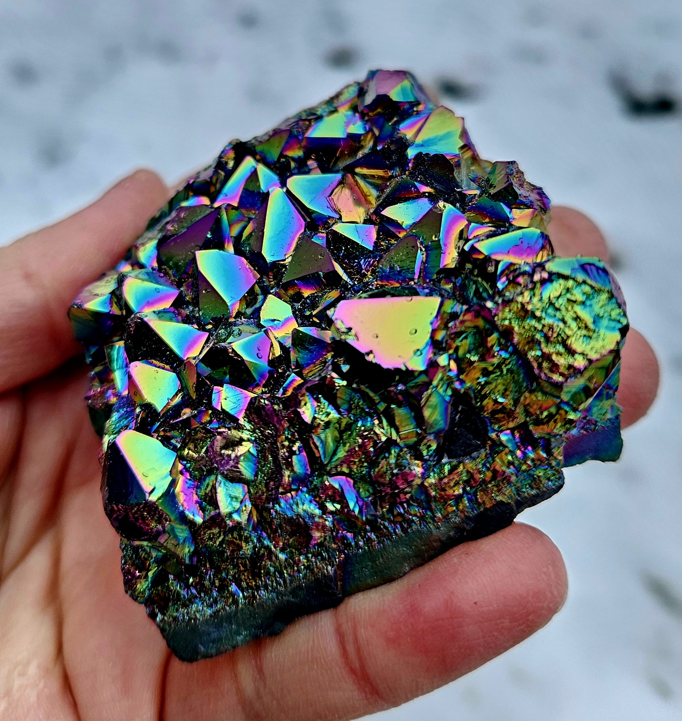 Táto očarujúca Aqua Aura drúza je spojením prírodnej krásy krištáľu a alchýmie svetla. Jej povrch hrá fascinujúcimi dúhovými odleskami v odtieňoch zlata, tyrkysu, fialovej a modrej – ako zachytený kúsok vesmíru vo Vašej dlani.