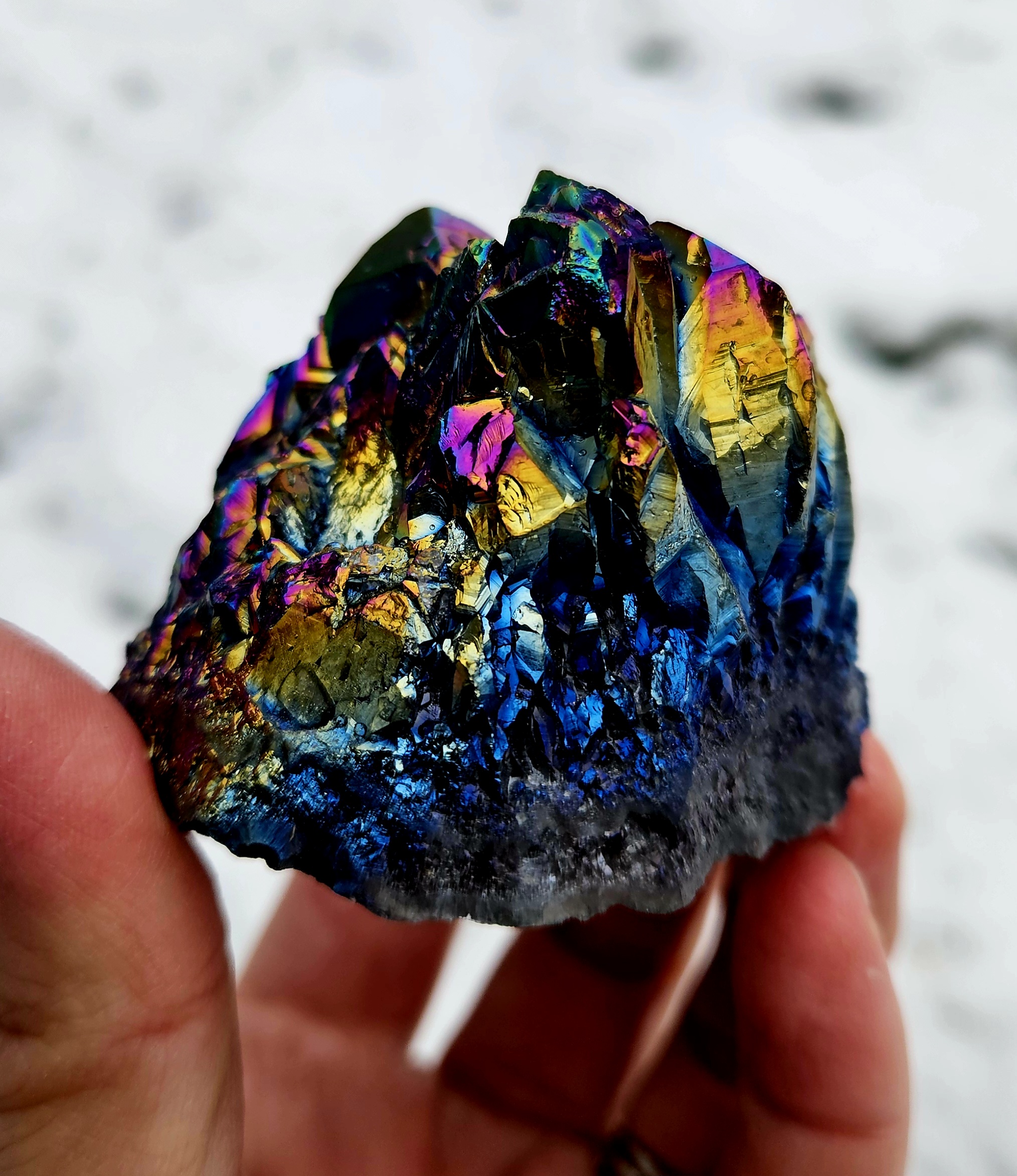 Táto očarujúca Aqua Aura drúza je spojením prírodnej krásy krištáľu a alchýmie svetla. Jej povrch hrá fascinujúcimi dúhovými odleskami v odtieňoch zlata, tyrkysu, fialovej a modrej – ako zachytený kúsok vesmíru vo Vašej dlani.