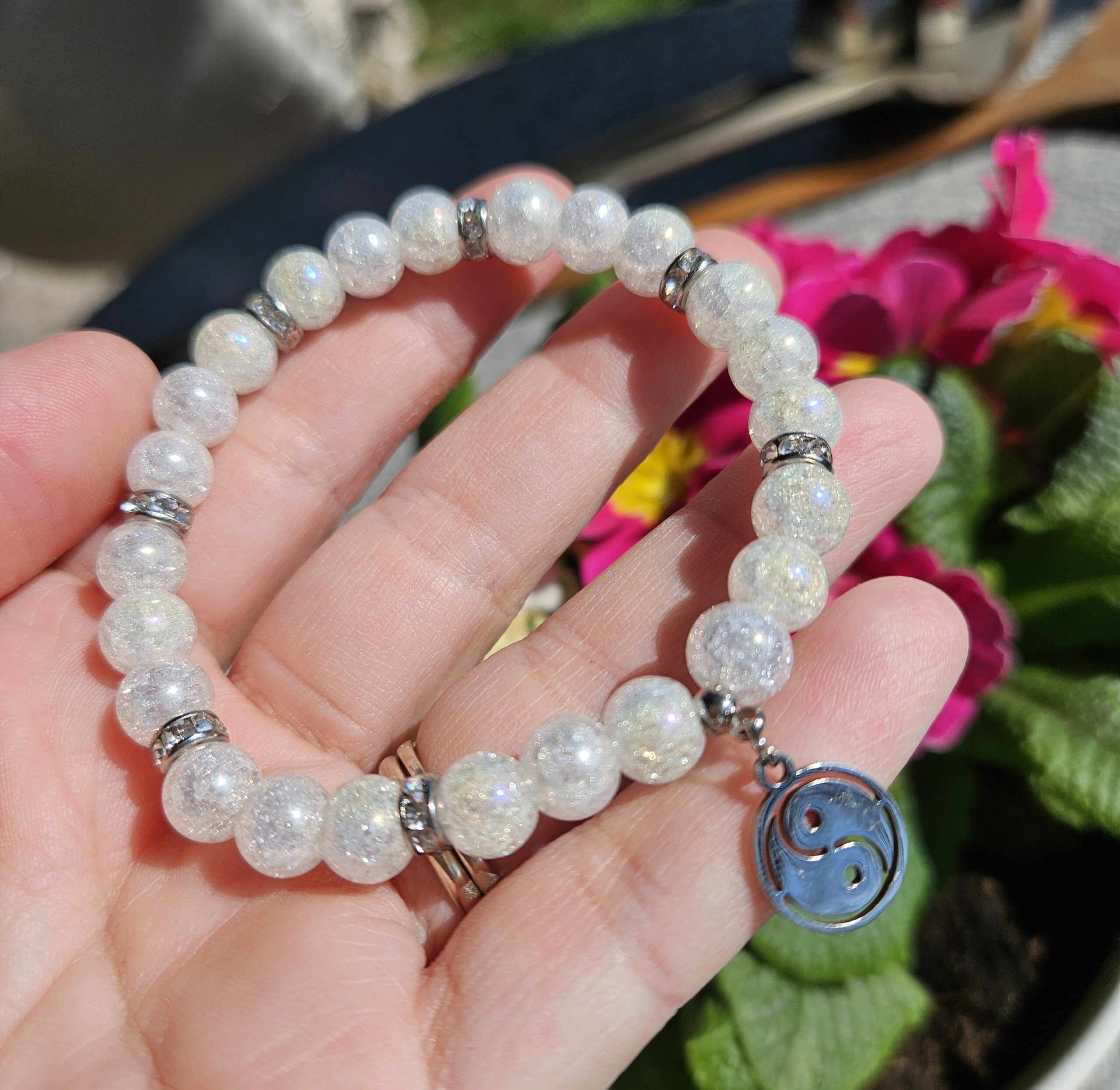 Aqua Aura biela praskaná náramok 8mm Jing Jang
