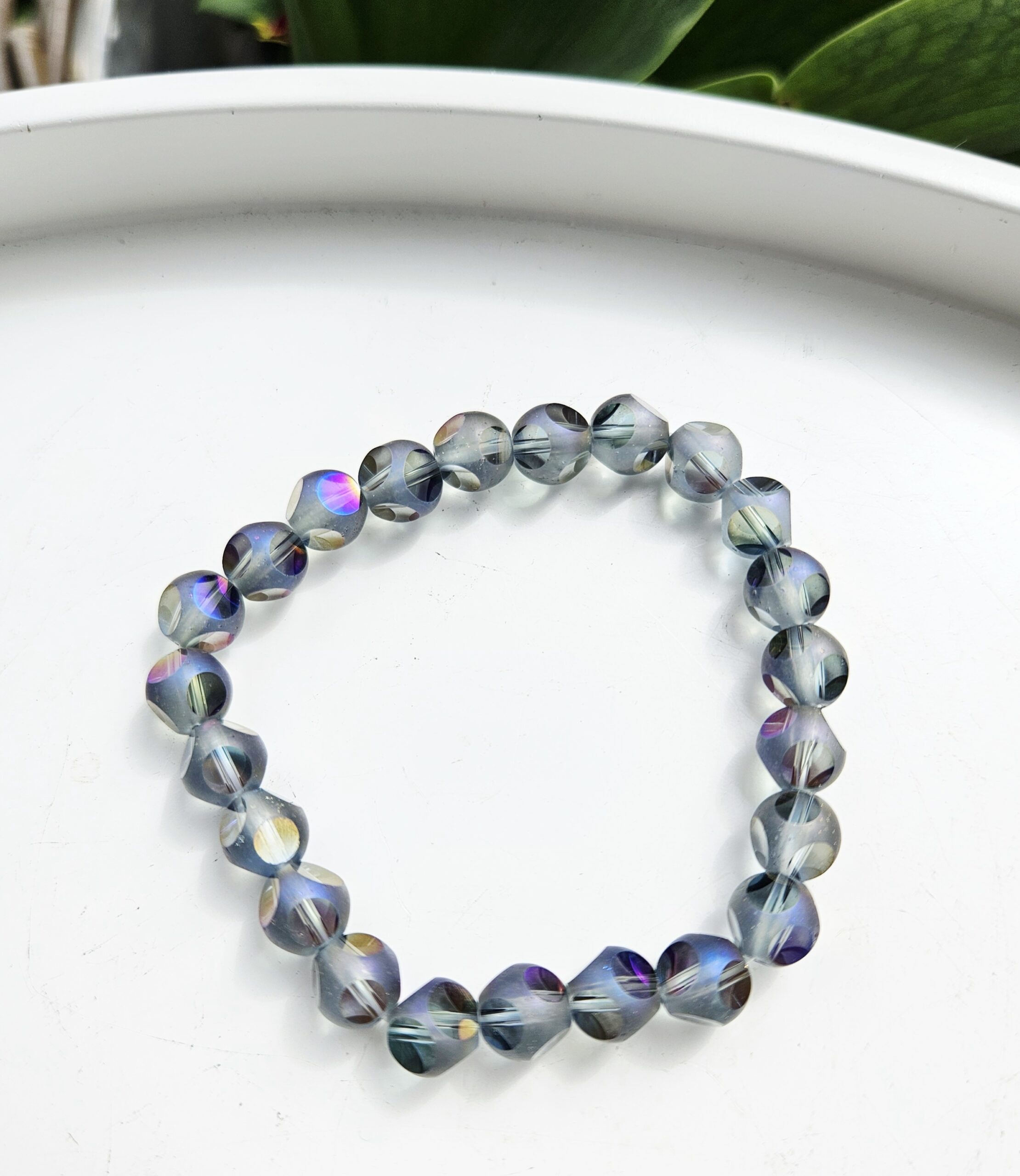 Tento výnimočný náramok z aqua aura kameňa v šedom odtieni s fazetovaným brúsením nádherne odráža svetlo a vytvára jemné dúhové odlesky pri každom pohybe.