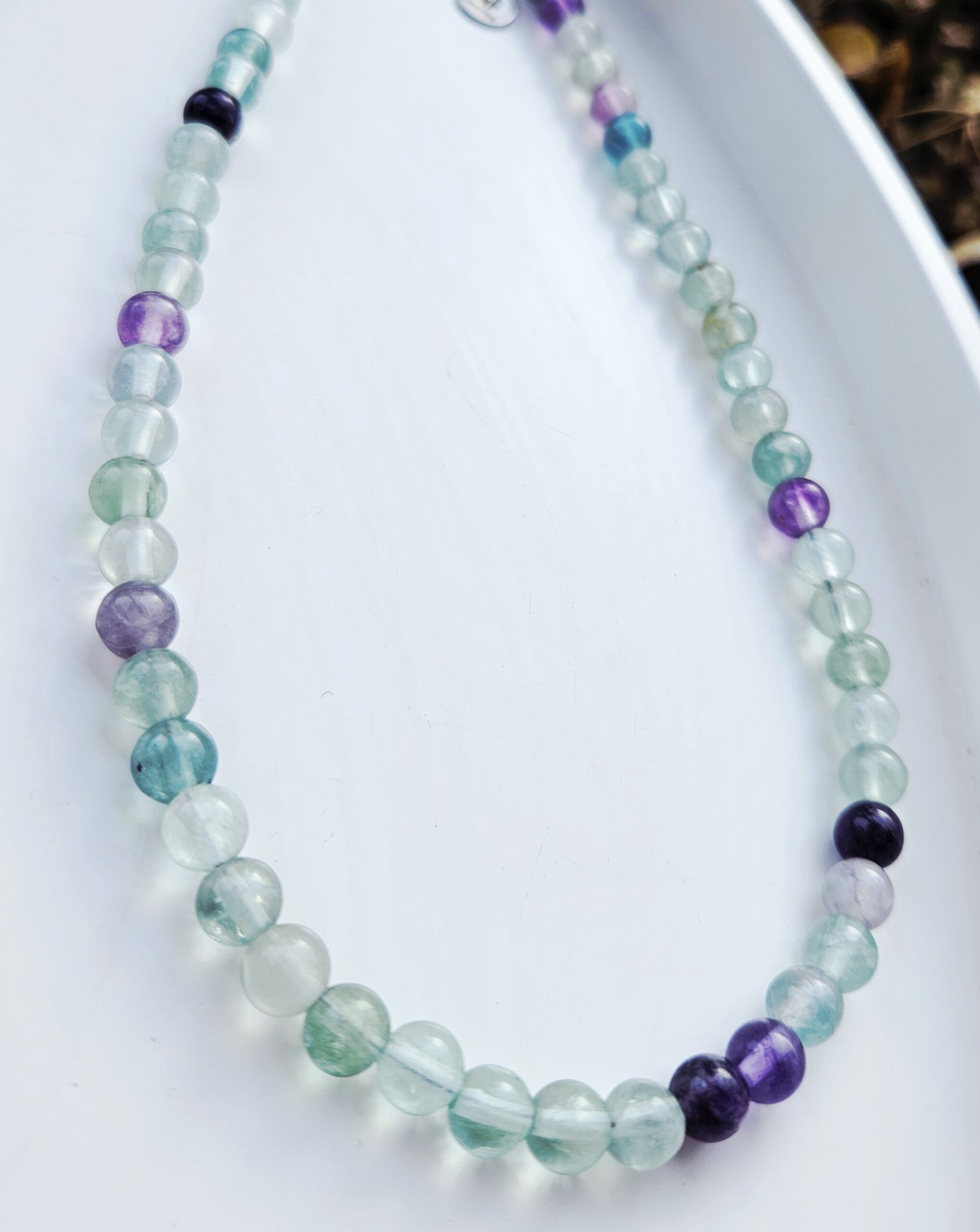 Elegantný náhrdelník z prírodného fluoritu očarí jemnou hrou pastelových odtieňov zelenej, fialovej a čírej. Harmonické striedanie farieb pôsobí nežne, žensky a nadčasovo – ideálny doplnok na každý deň aj k slávnostnejším outfitom.