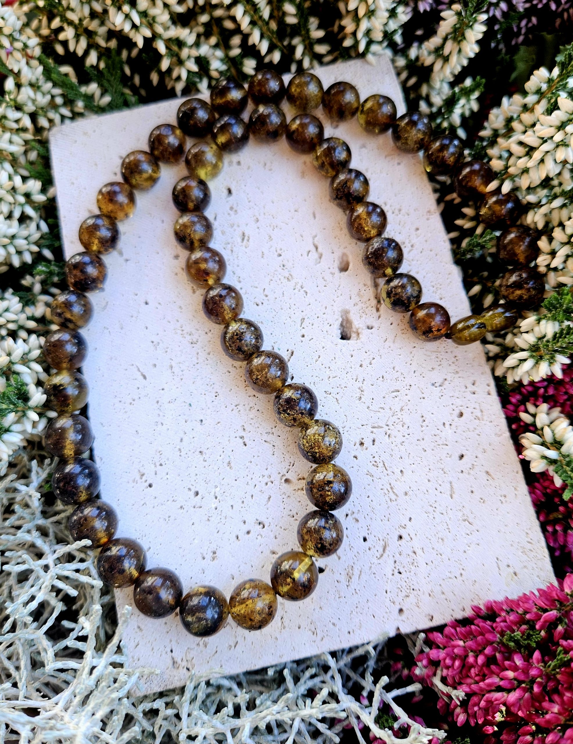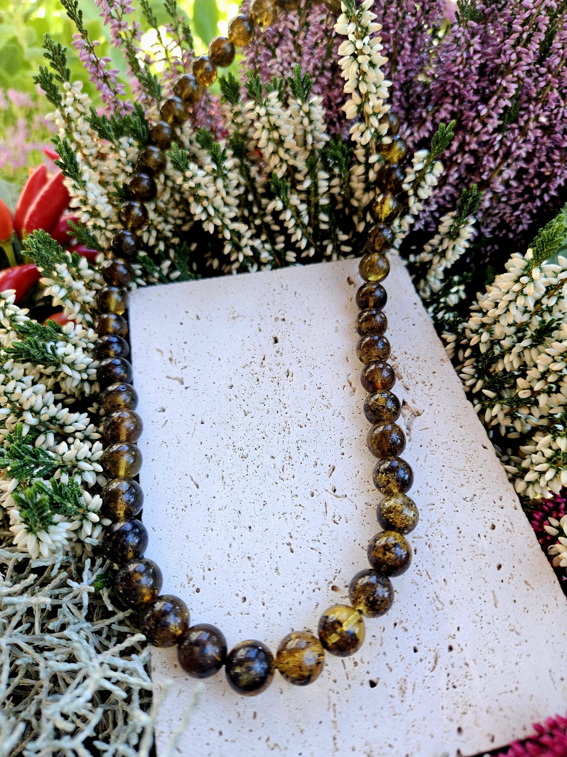 Náhrdelník je navlečený na šnúrke a zapínanie má šroubovacie z Jantáru.