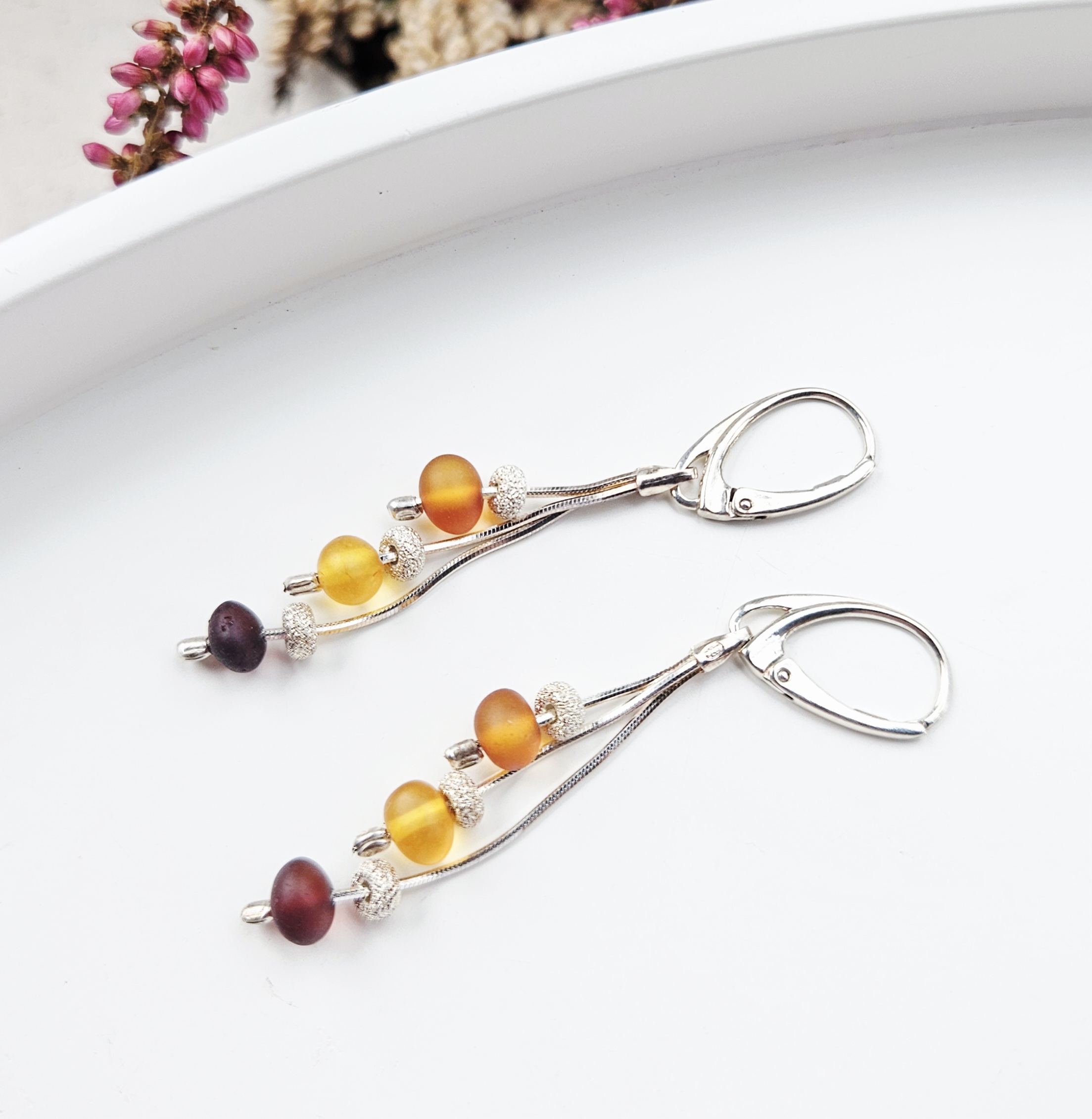 Elegantné visiace náušnice z prírodného jantáru v teplých medových a koňakových odtieňoch, ktoré krásne zachytávajú svetlo a dodávajú šperku jemný luxusný vzhľad. Kombinácia rôznych farebných tónov jantáru vytvára harmonický a zároveň originálny dizajn, vďaka ktorému sú náušnice výrazným, no stále veľmi elegantným doplnkom na každodenné nosenie aj výnimočné príležitosti.