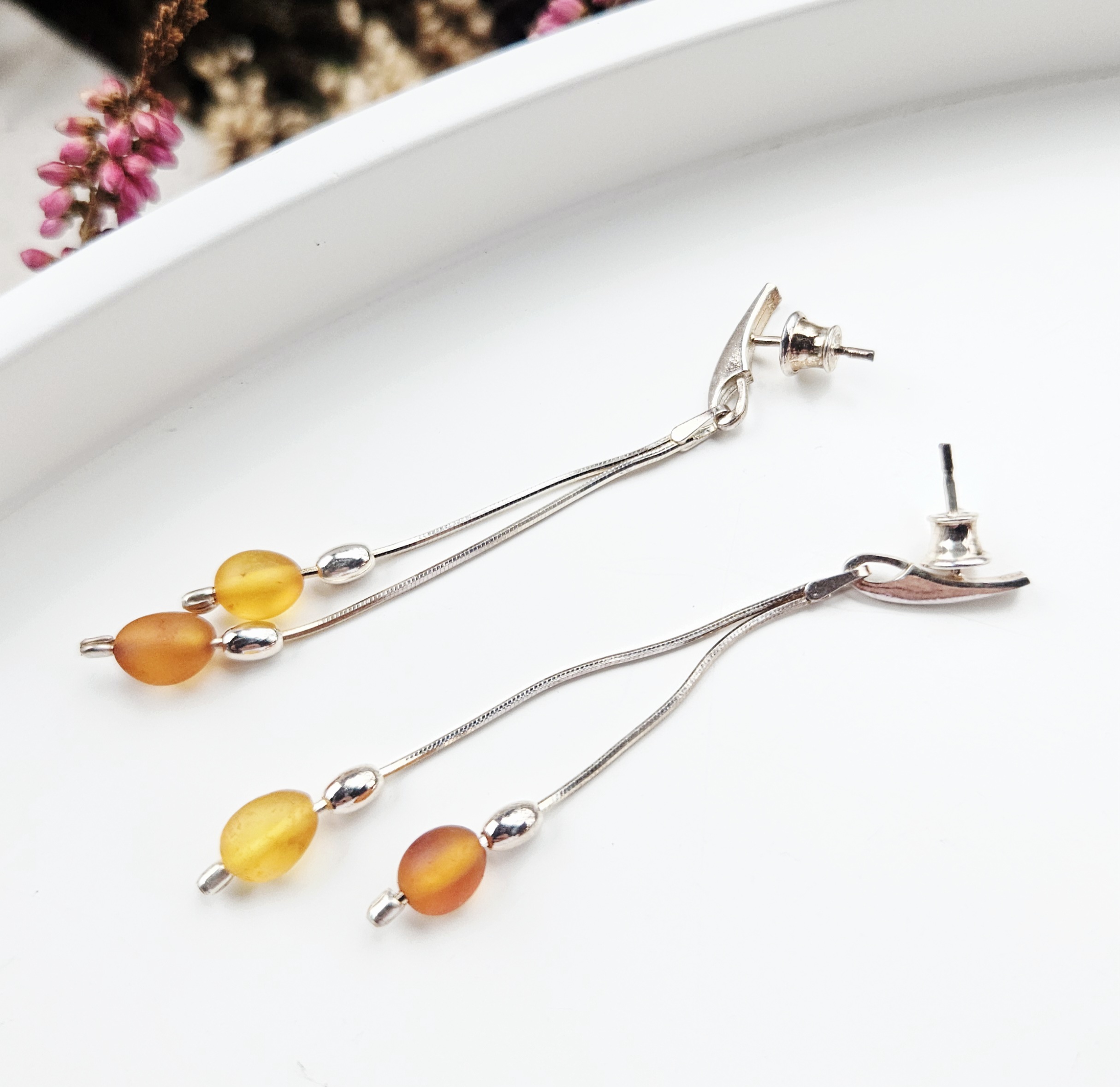Elegantné visiace náušnice z prírodného jantáru v teplých medových a koňakových odtieňoch, ktoré krásne zachytávajú svetlo a dodávajú šperku jemný luxusný vzhľad. Kombinácia rôznych farebných tónov jantáru vytvára harmonický a zároveň originálny dizajn, vďaka ktorému sú náušnice výrazným, no stále veľmi elegantným doplnkom na každodenné nosenie aj výnimočné príležitosti.