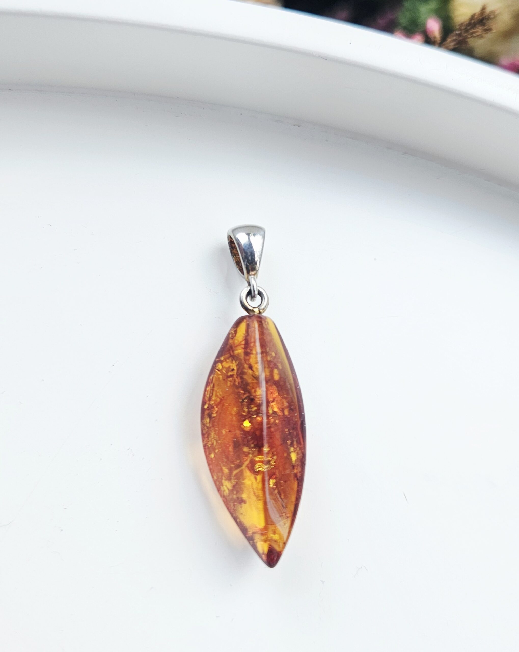 Nežný prívesok z pravého jantáru v tvare slzy, ktorý v sebe nesie teplo dávnych čias a prirodzenú krásu prírody. Jeho zlatisto-medový odtieň jemne zachytáva svetlo a vytvára živý, hrejivý lesk, ktorý pôsobí elegantne a nadčasovo.