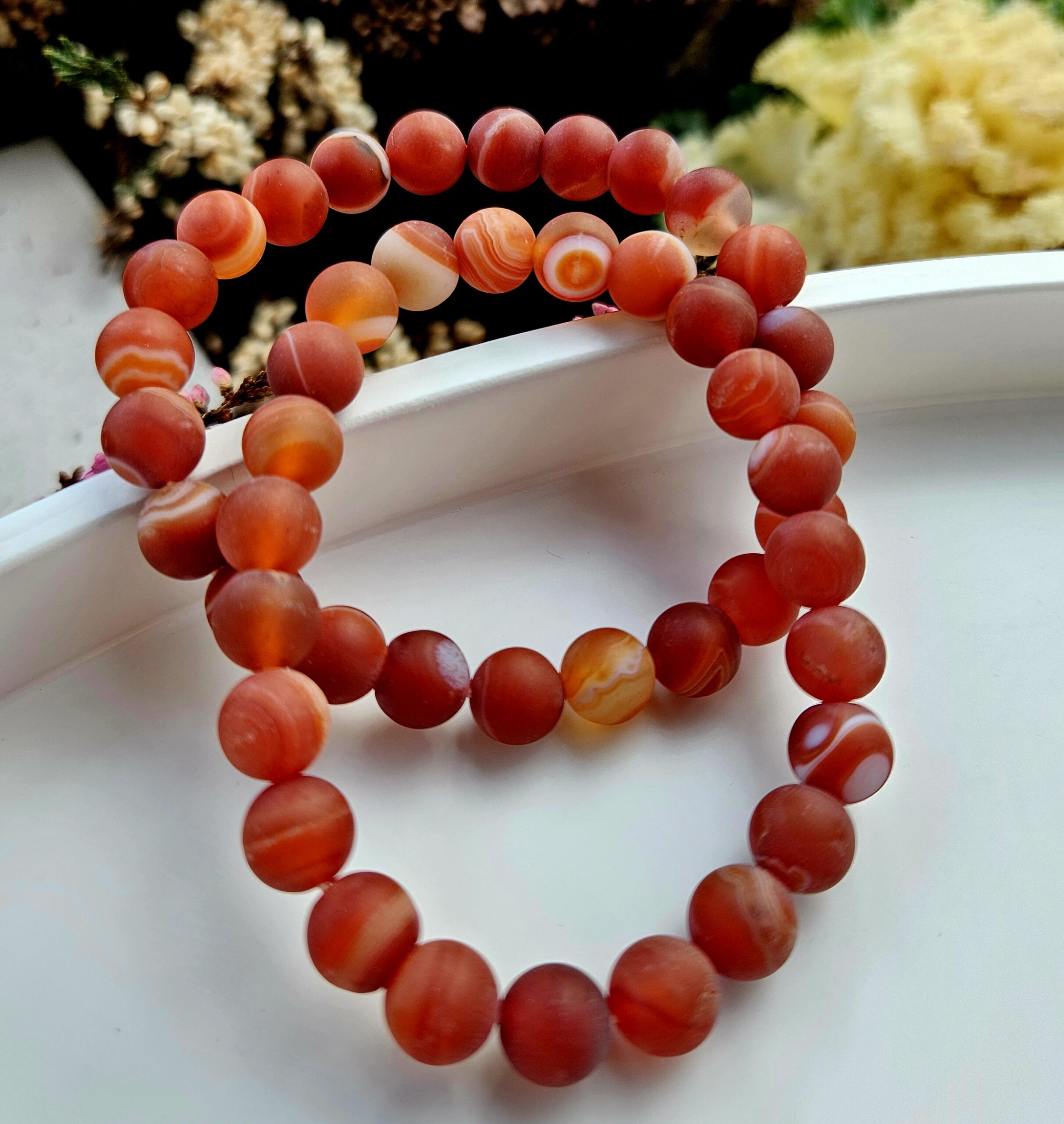 Každý náramok je originál – prirodzené páskovanie a farebné prechody karneolu sa môžu mierne líšiť.