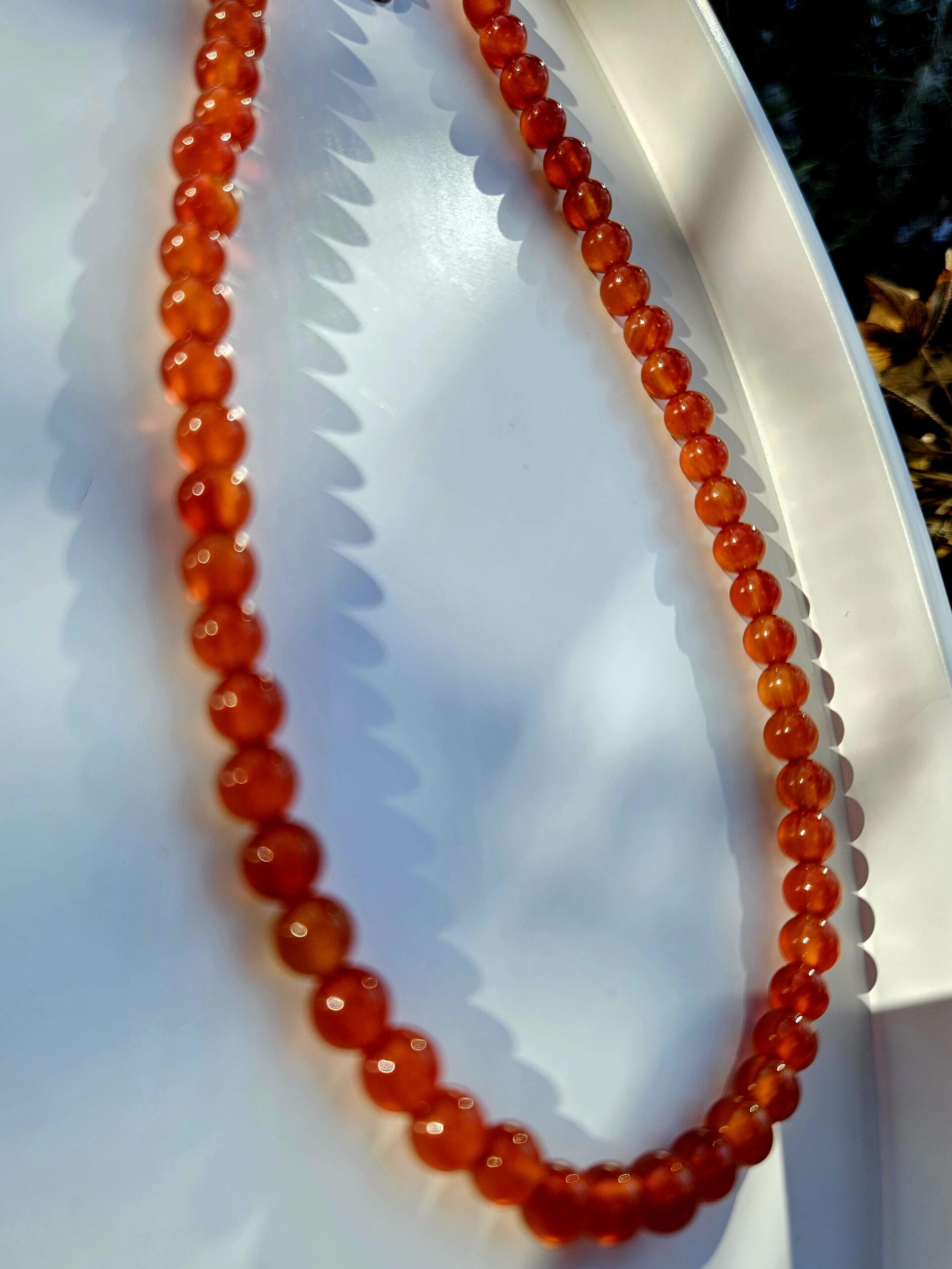 Elegantný náhrdelník z prírodného karneolu s guľôčkami o veľkosti 6 mm je silným talizmanom vitality, odvahy a životnej energie. Teplé ohnivé odtiene karneolu symbolizujú vnútornú silu, vášeň a radosť zo života.