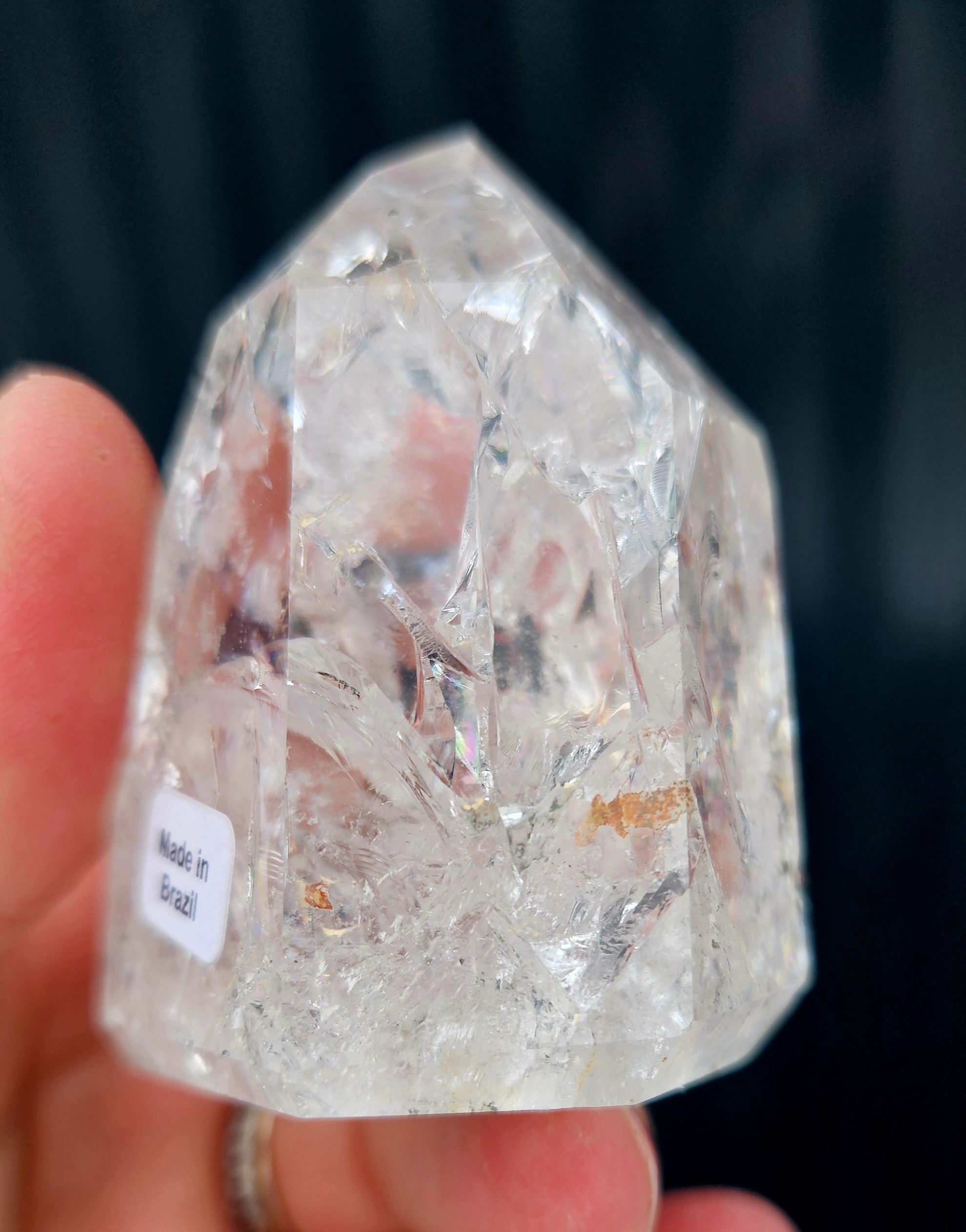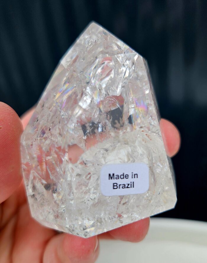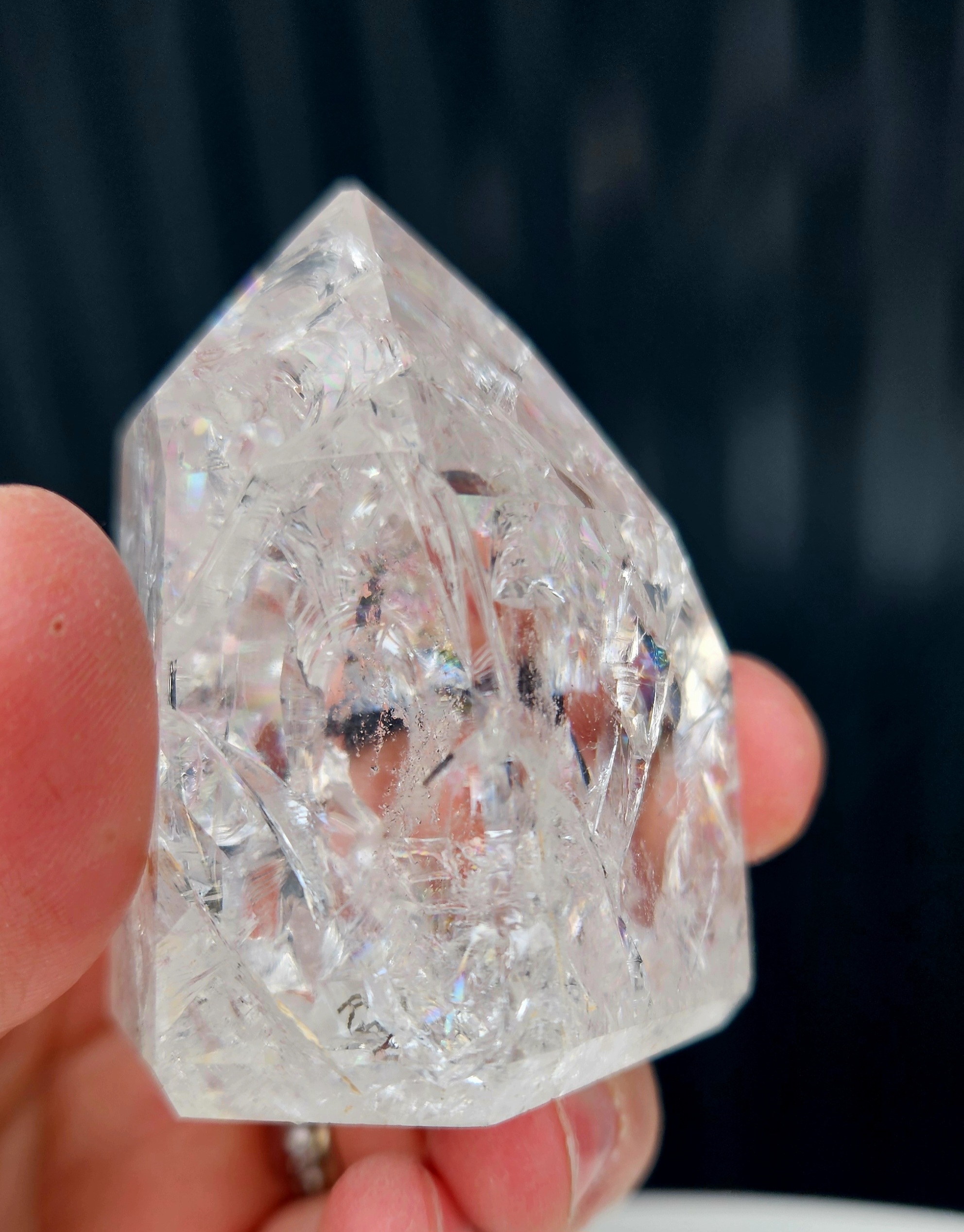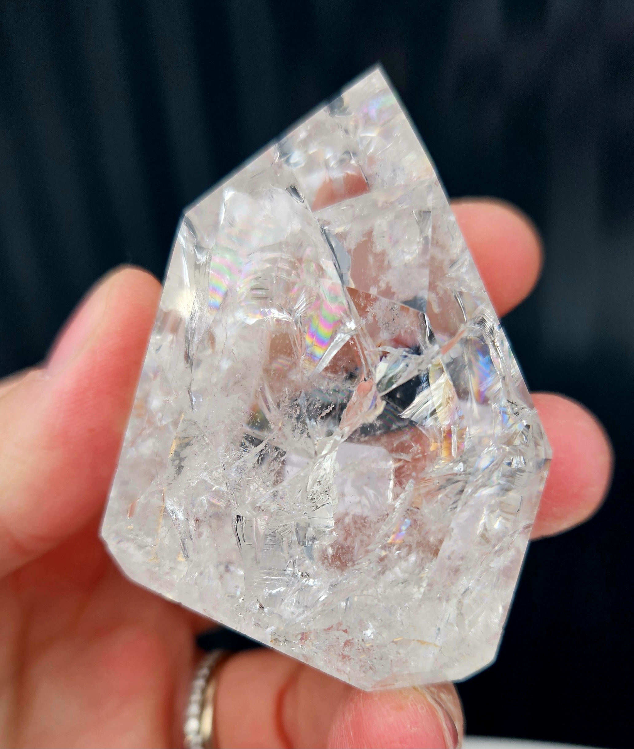 Jeho vnútro je bohato prežiarené jemnými prasklinkami a štruktúrami, ktoré vytvárajú nádherné dúhové (aura) odlesky 🌈 – živé, hravé a neustále sa meniace.