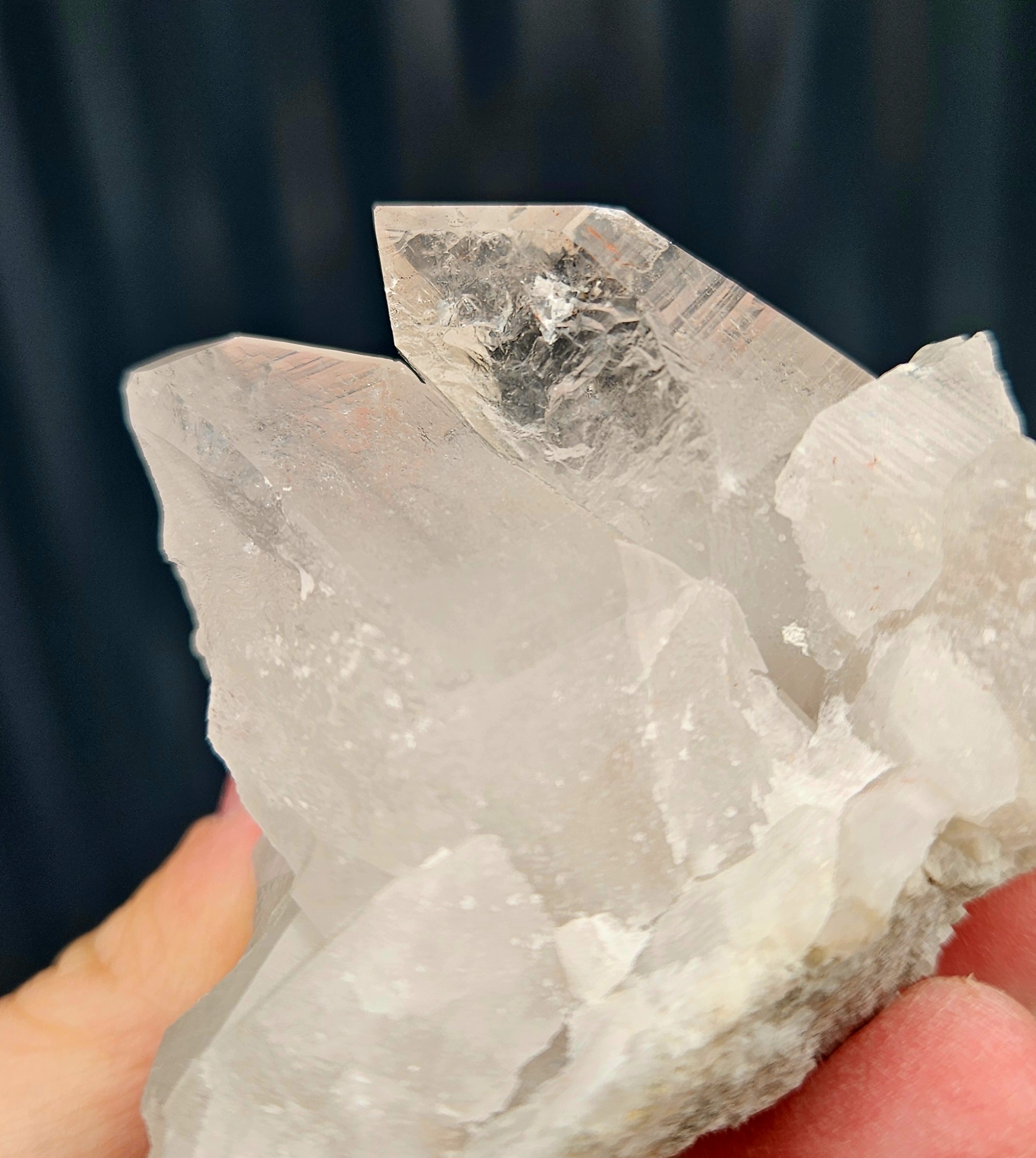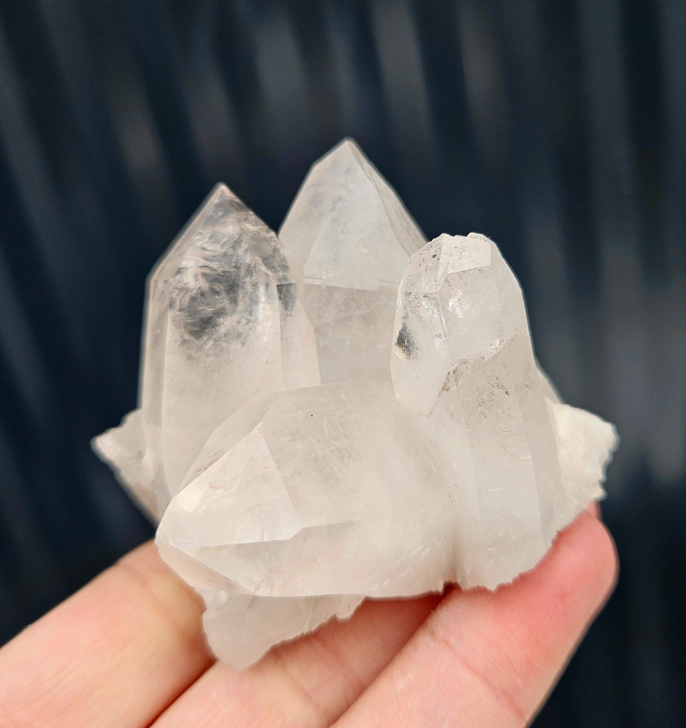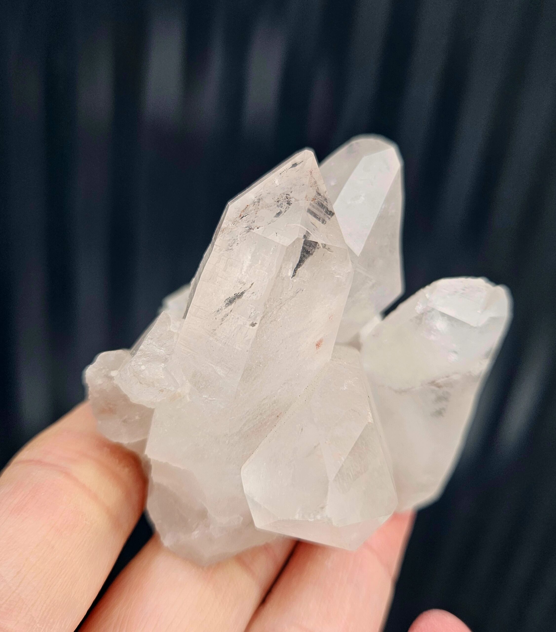 Táto krásna krištáľová drúza zaujme svojou kompaktnou formou a viacerými prirodzene ukončenými hrotmi, ktoré spolu vytvárajú harmonický a vyvážený celok. Jemne mliečny vzhľad jej dodáva nežný, upokojujúci charakter.