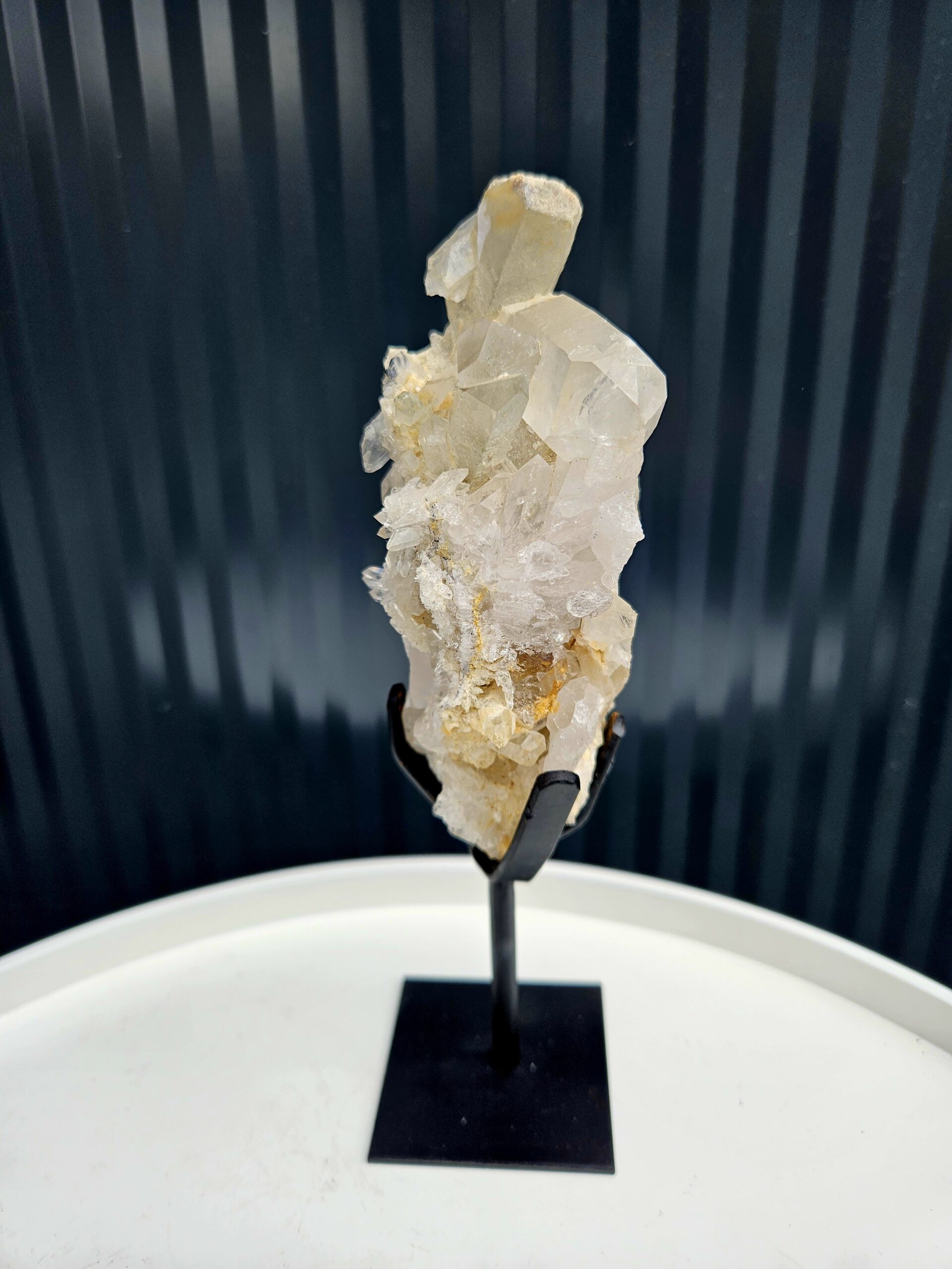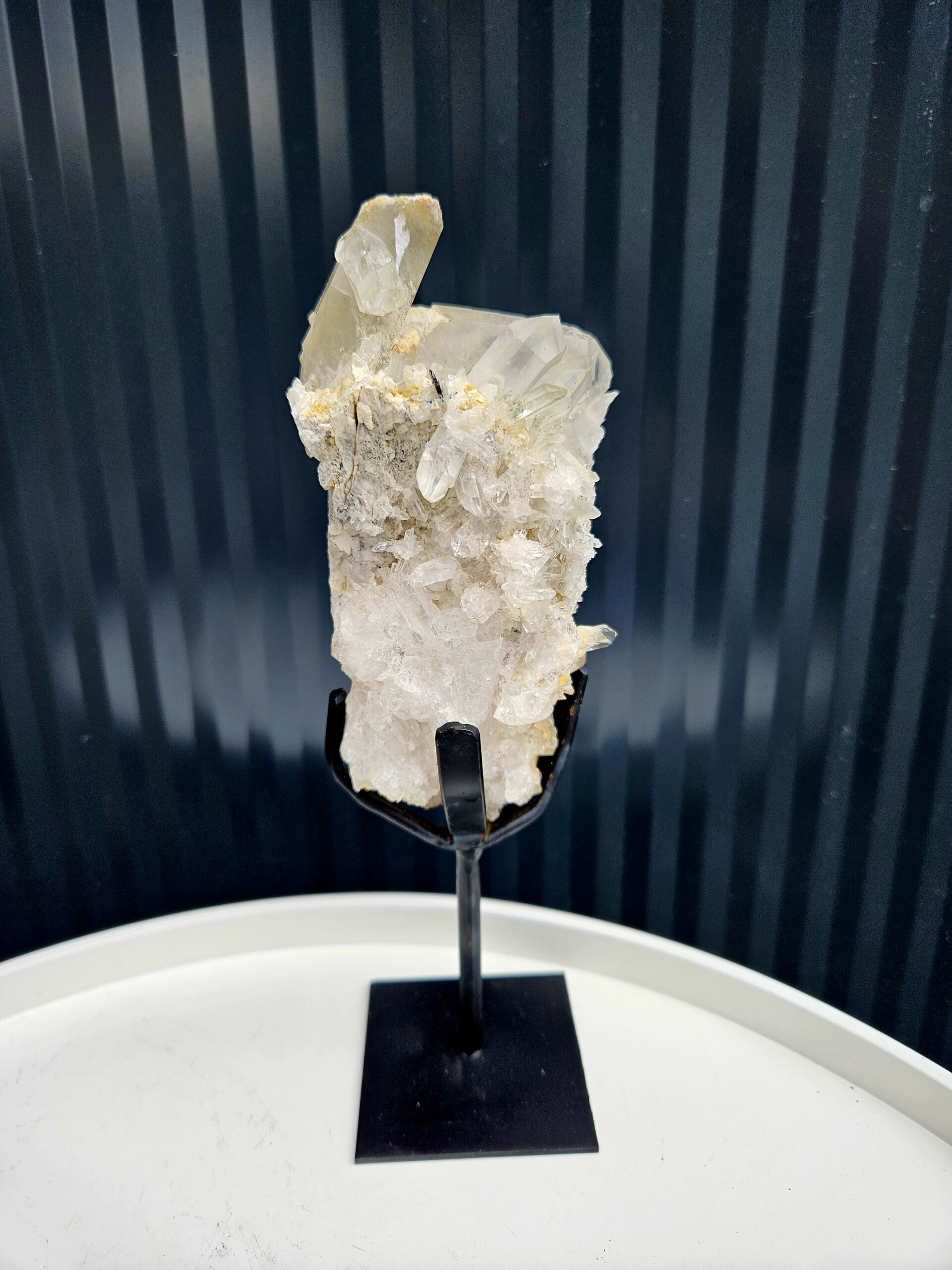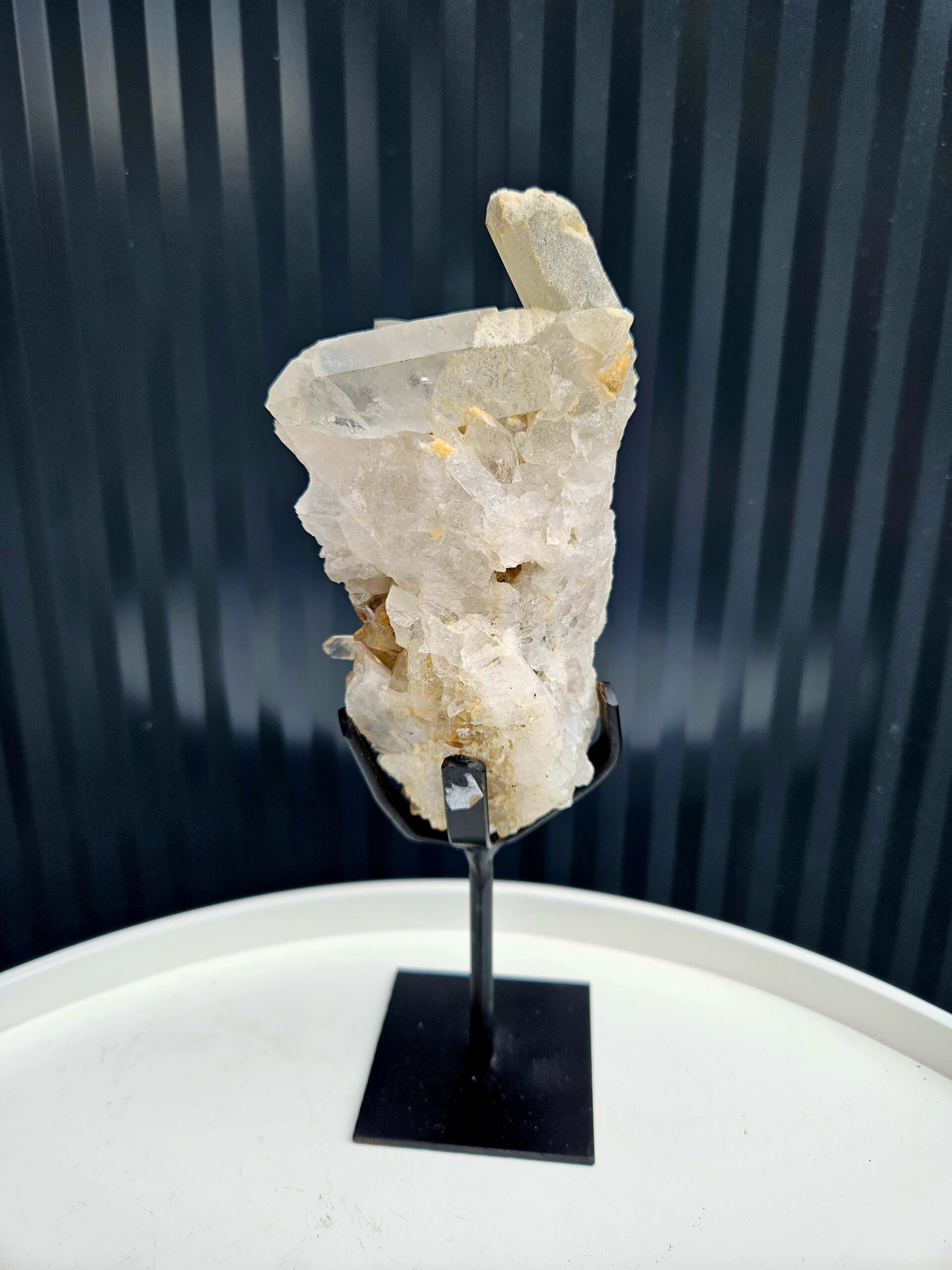 Táto štíhla krištáľová drúza pôsobí ako prírodná socha – jedinečný vertikálny rast kryštálov vytvára dynamický, takmer sochársky efekt. Dominantný hrot na vrchu spolu s jemnými kryštálikmi po stranách zachytáva svetlo z každého uhla a odhaľuje krásu prírody v jej najčistejšej podobe.