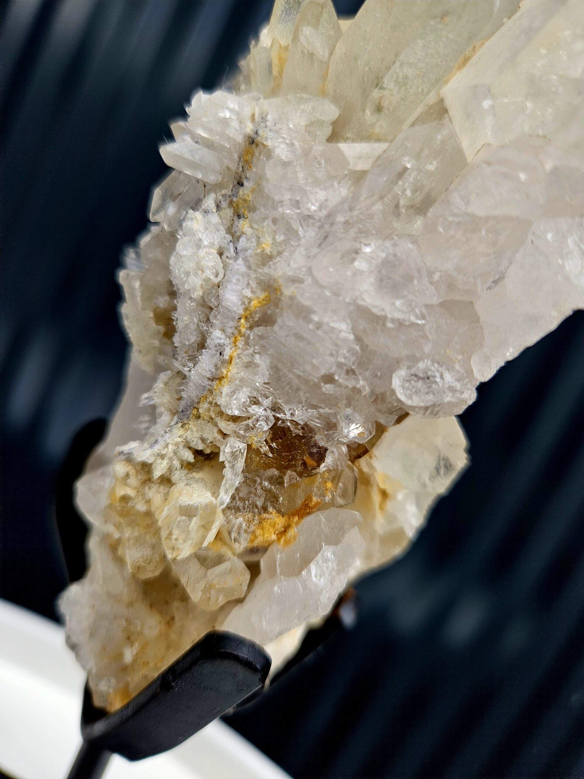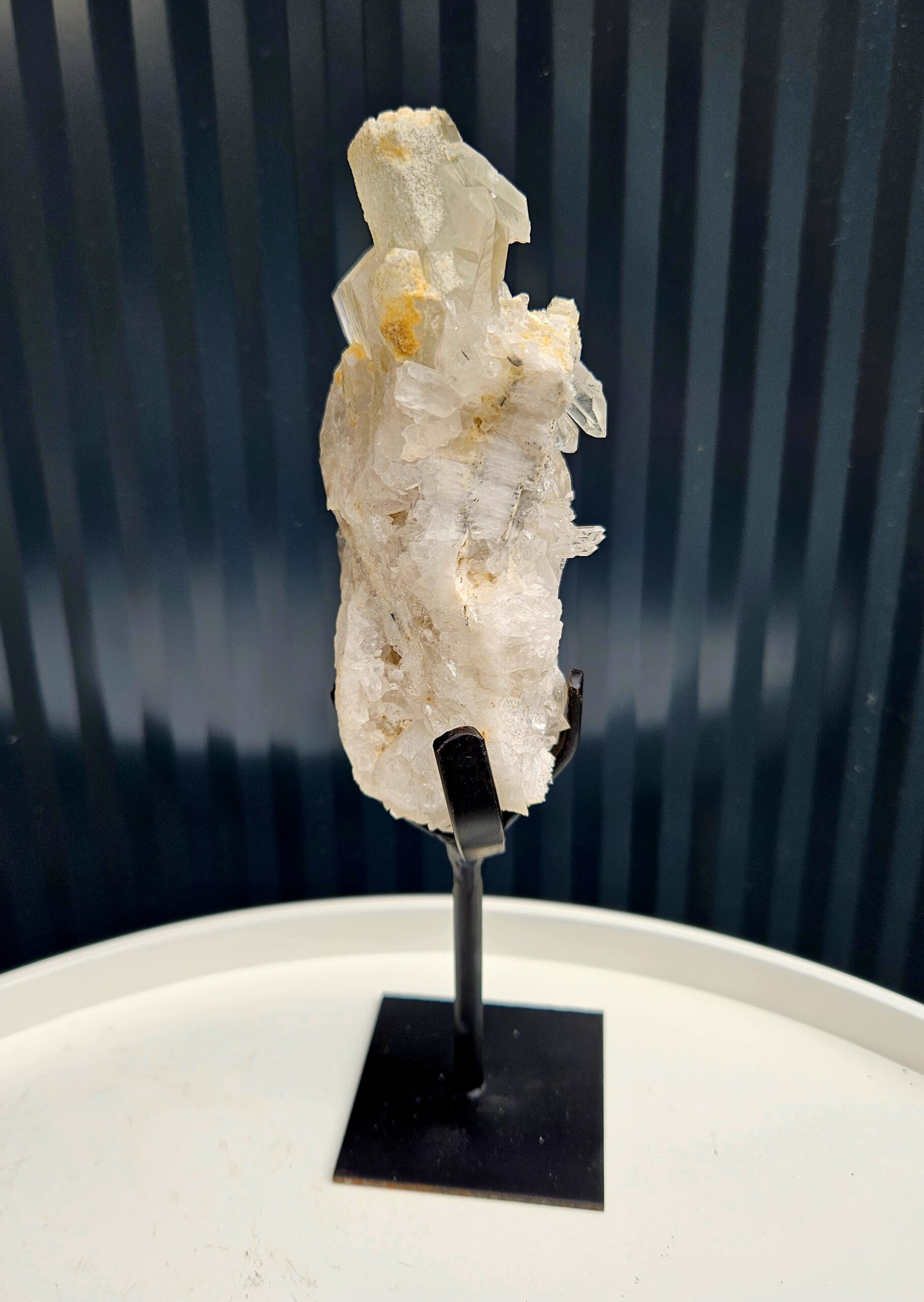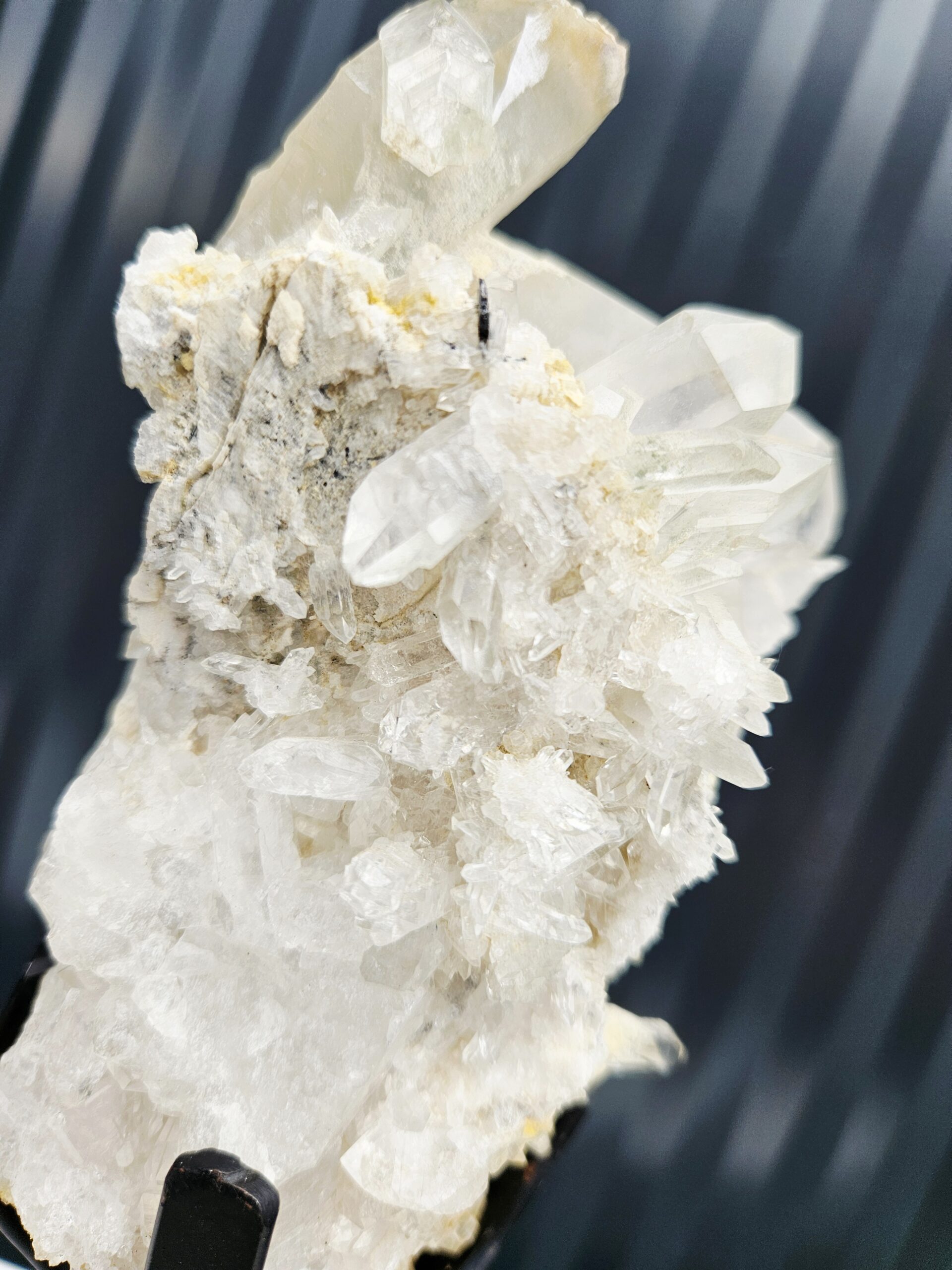Táto štíhla krištáľová drúza pôsobí ako prírodná socha – jedinečný vertikálny rast kryštálov vytvára dynamický, takmer sochársky efekt. Dominantný hrot na vrchu spolu s jemnými kryštálikmi po stranách zachytáva svetlo z každého uhla a odhaľuje krásu prírody v jej najčistejšej podobe.