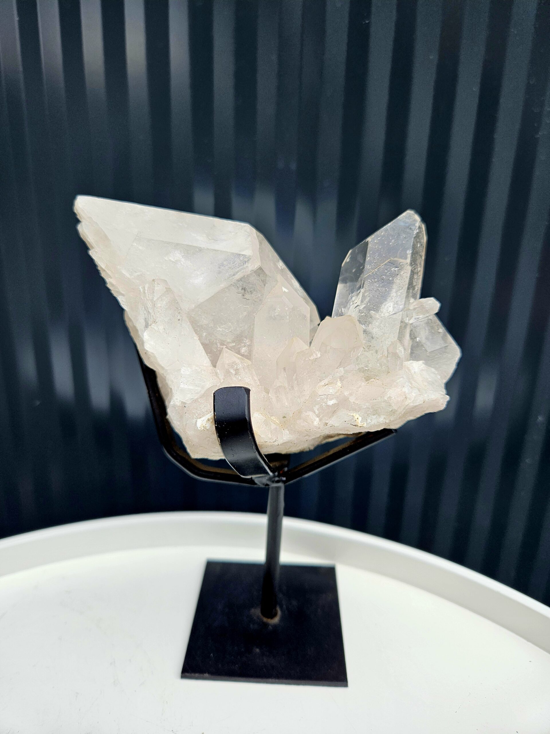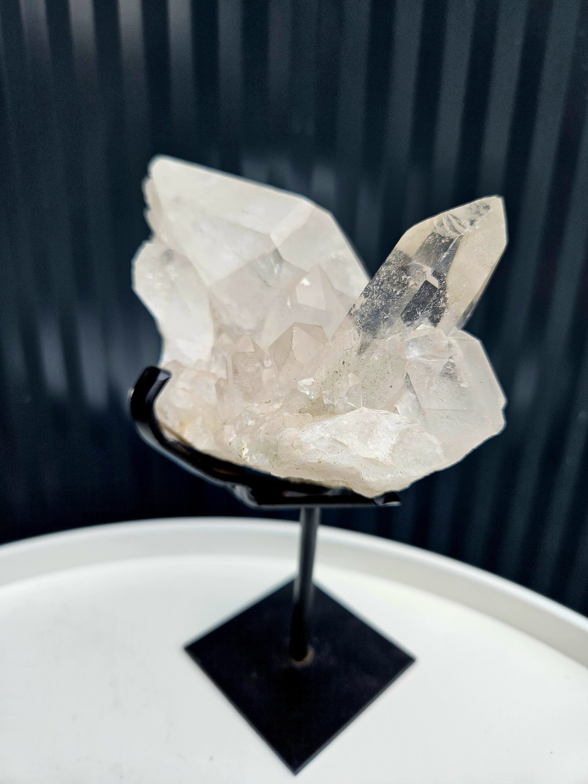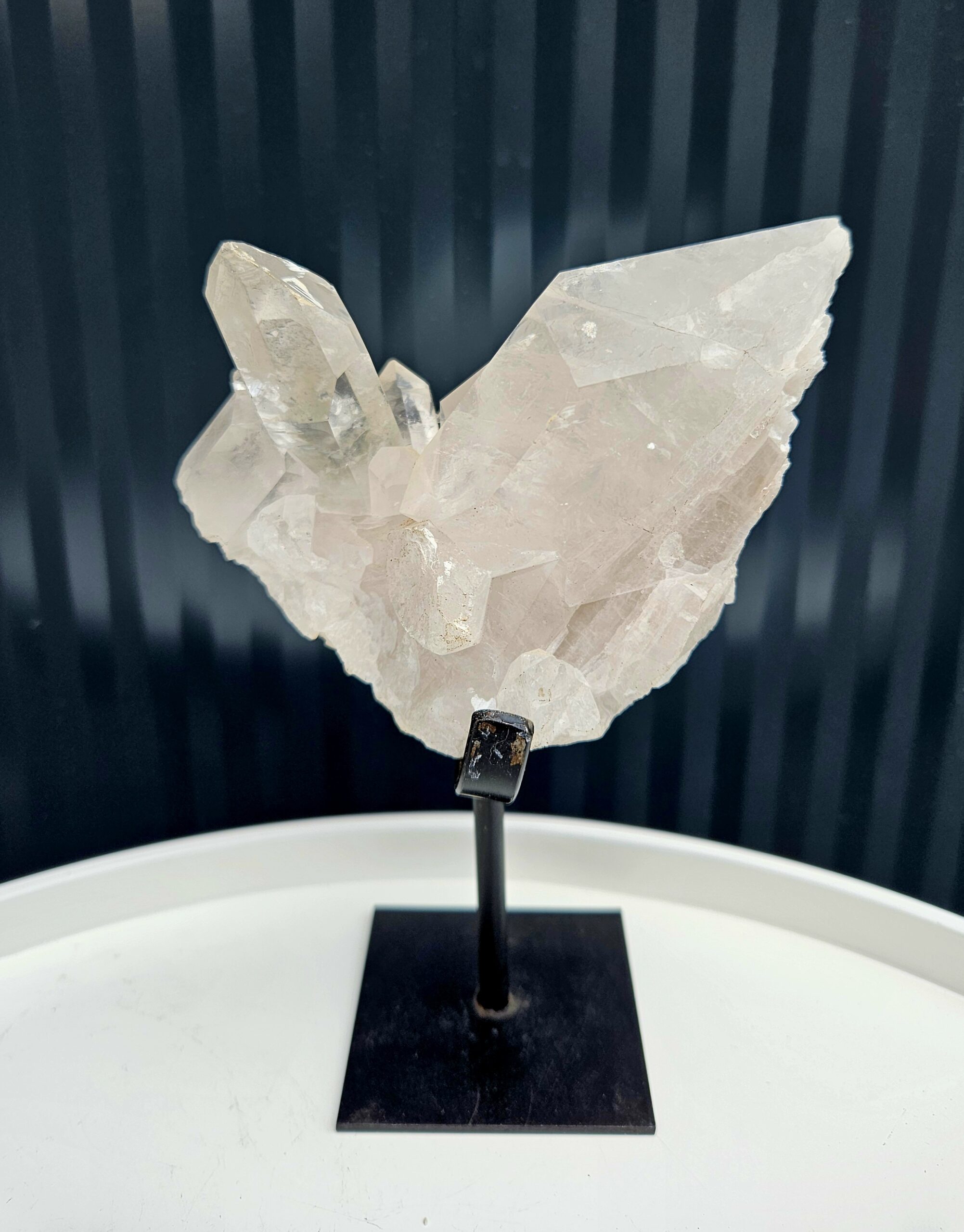 Táto jedinečná krištáľová drúza očarí svojou jemnosťou aj silou zároveň. Väčšie, výrazne ukončené kryštály vytvárajú harmonickú kompozíciu, ktorá pripomína krištáľové krídla – symbol ľahkosti, ochrany a slobody. V kombinácii s minimalistickým čiernym stojanom pôsobí moderne a zároveň nadčasovo.