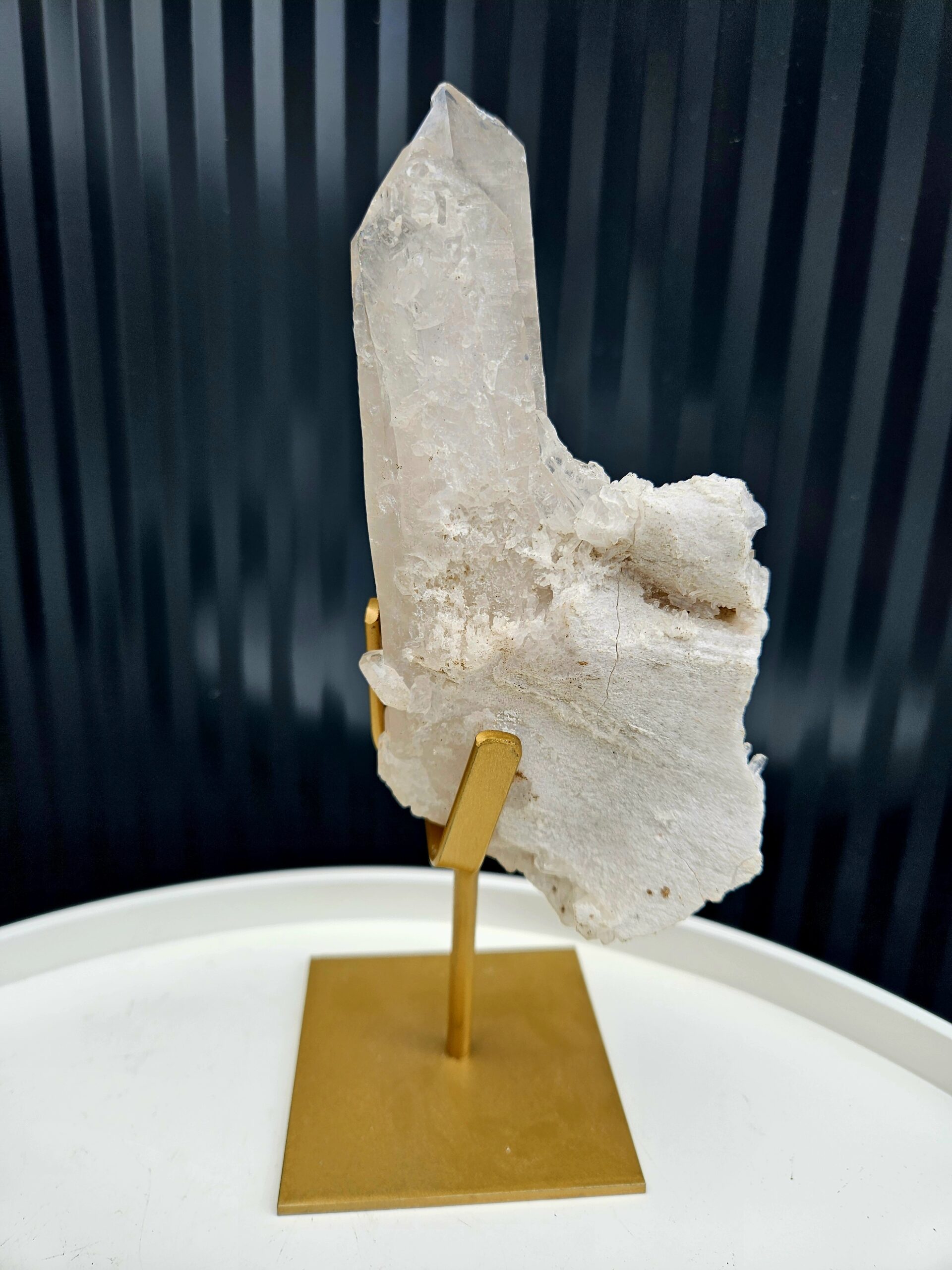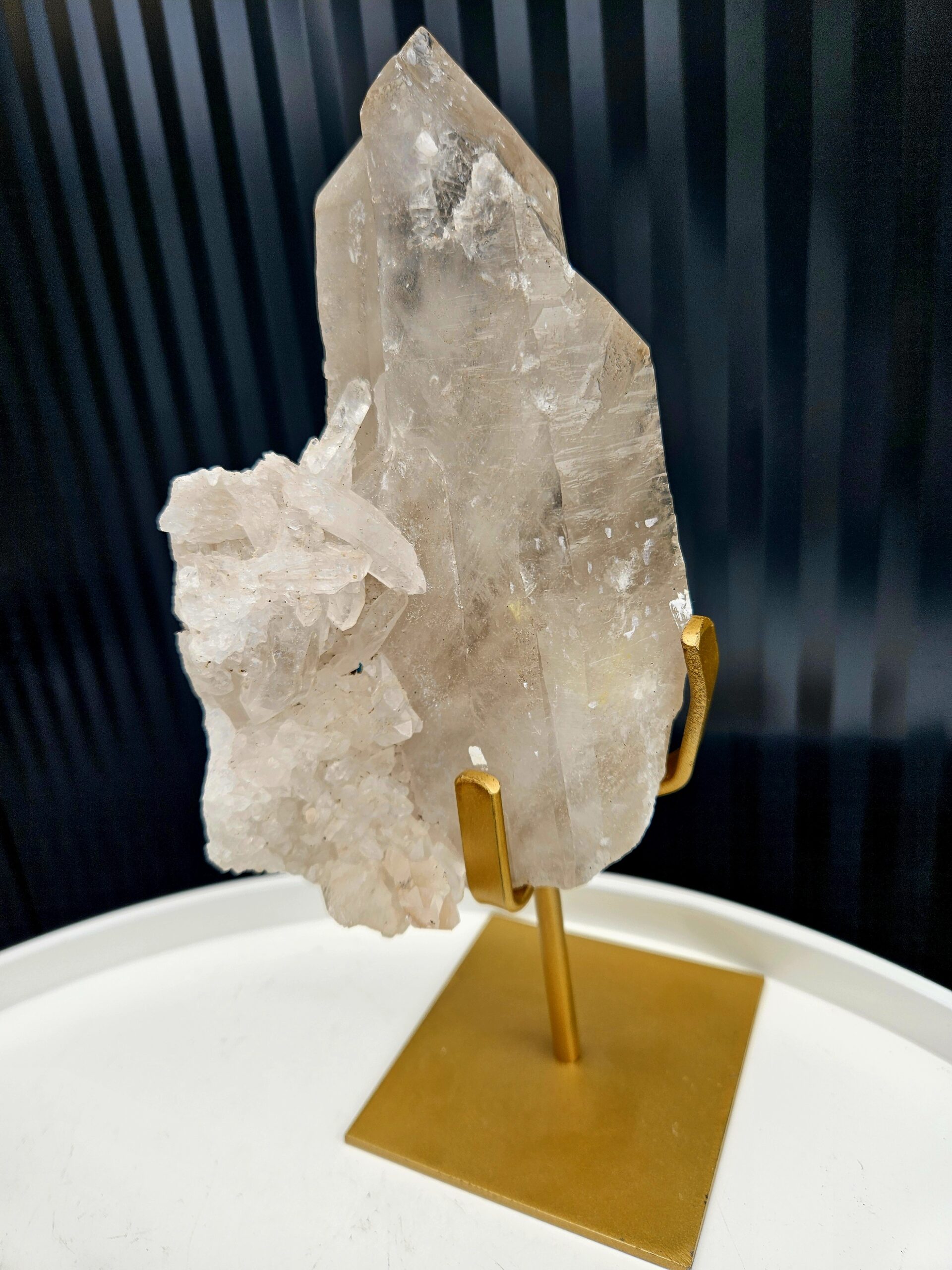 Tento výnimočný kúsok okamžite upúta svojou dominantnou krištáľovou špicou, ktorá sa hrdo dvíha nad jemnou drúzou menších kryštálov. Kombinácia mohutného, priezračného hrotu a drobných kryštálikov vytvára fascinujúci kontrast – silu aj jemnosť v jednom.