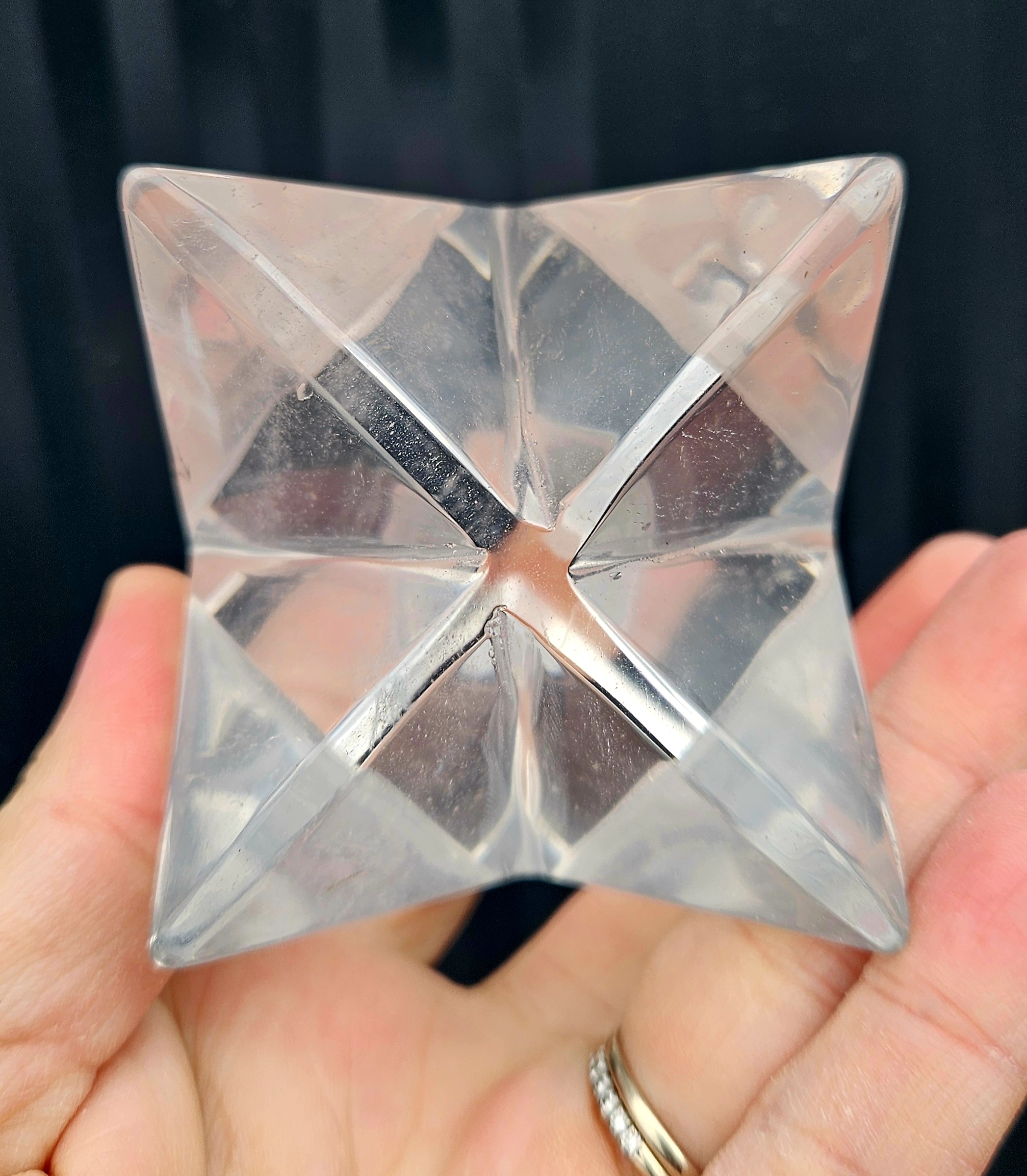 Táto nádherná krištáľová Merkaba je výnimočný tvar posvätnej geometrie, ktorý symbolizuje spojenie tela, mysle a ducha. Jej precízne brúsené plochy vytvárajú fascinujúcu hru svetla a čistoty.