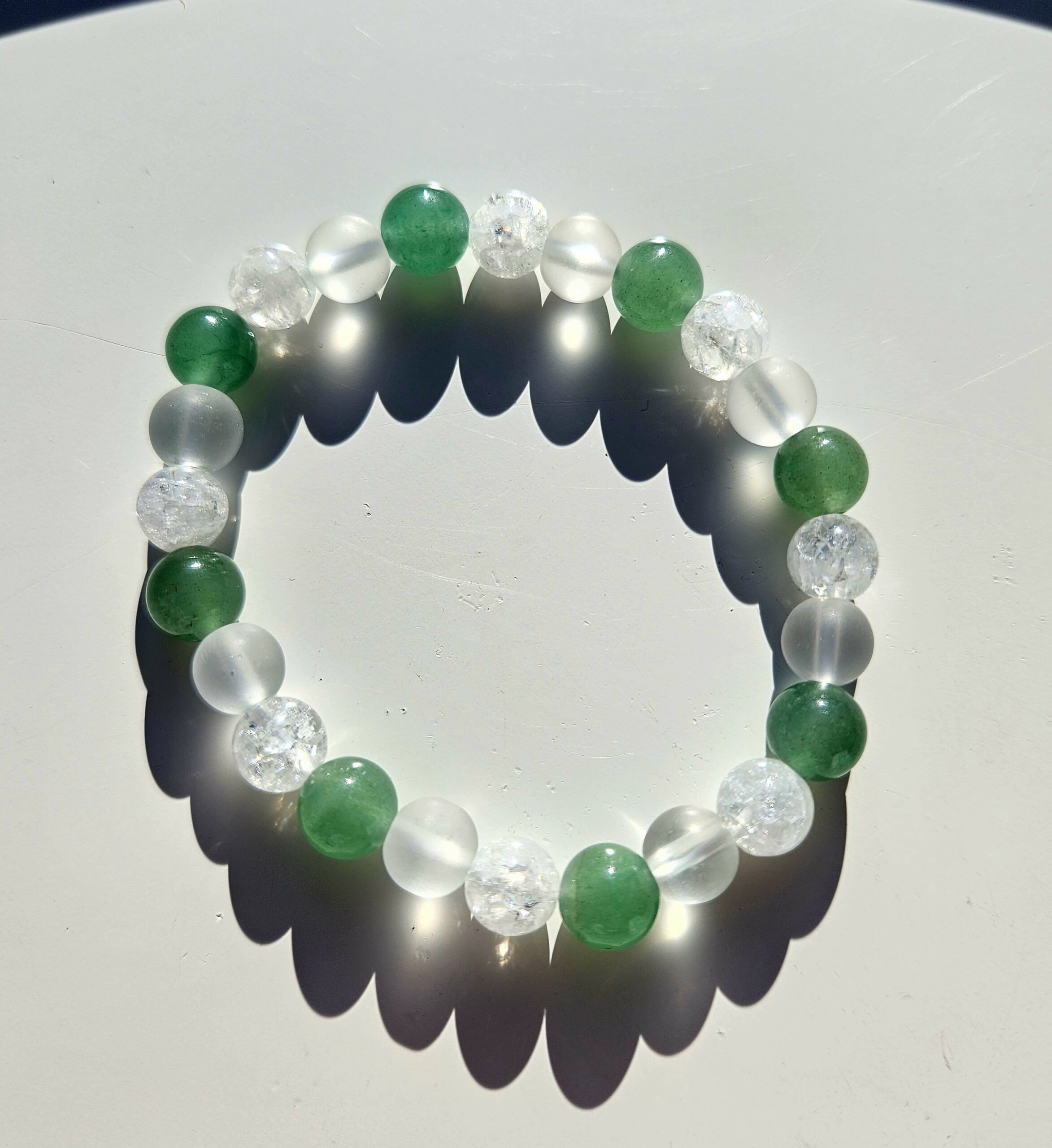 Jemný, harmonický náramok vytvorený z 8mm praskaného krištáľu, matného krištáľu a prírodného avanturínu – kameňa šťastia, pokoja a nových príležitostí