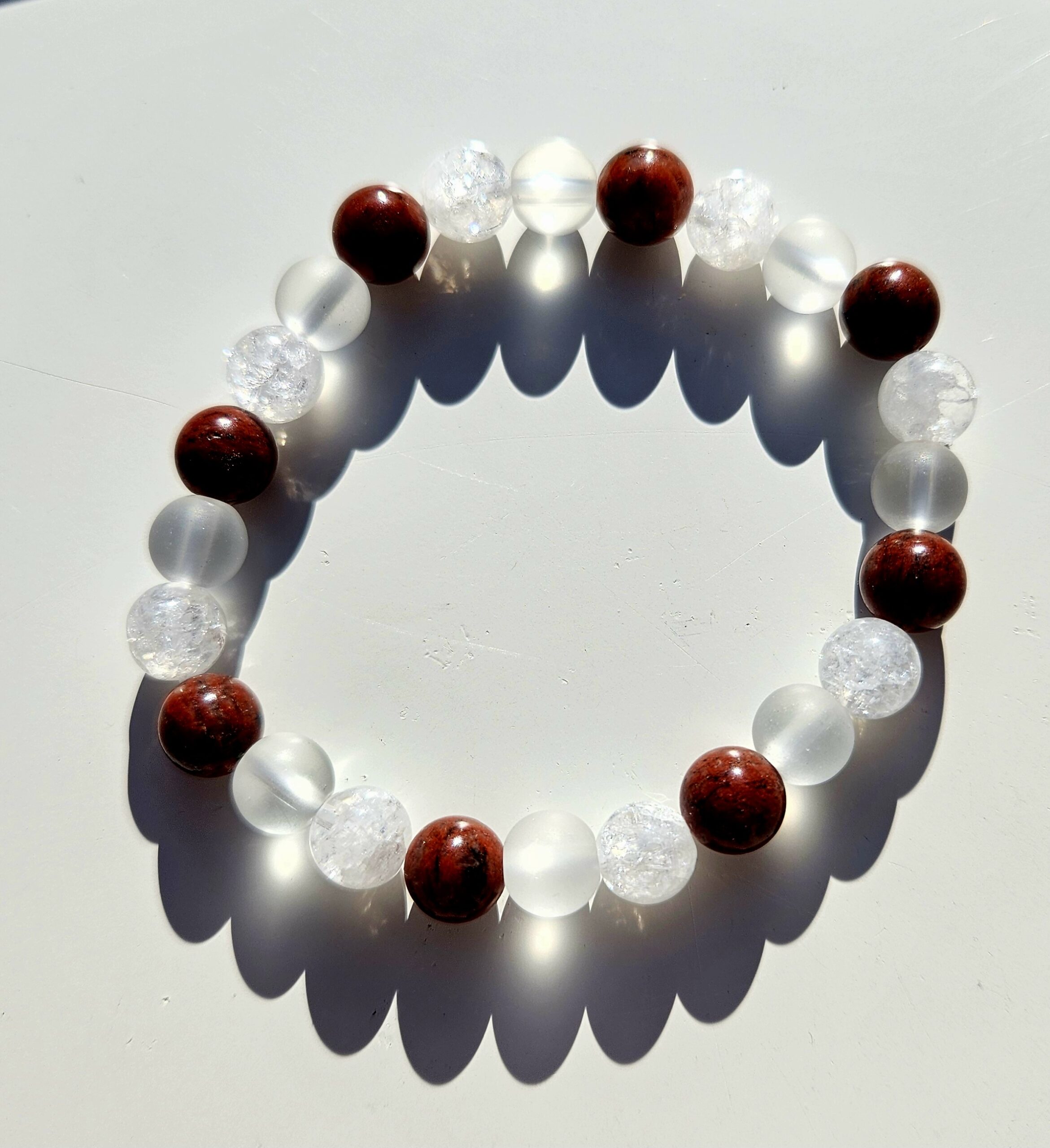 Silný a harmonický náramok vytvorený z praskaného krištáľu, matného krištáľu a prírodného červeného jaspisu – kameňa stability, odvahy a životnej sily