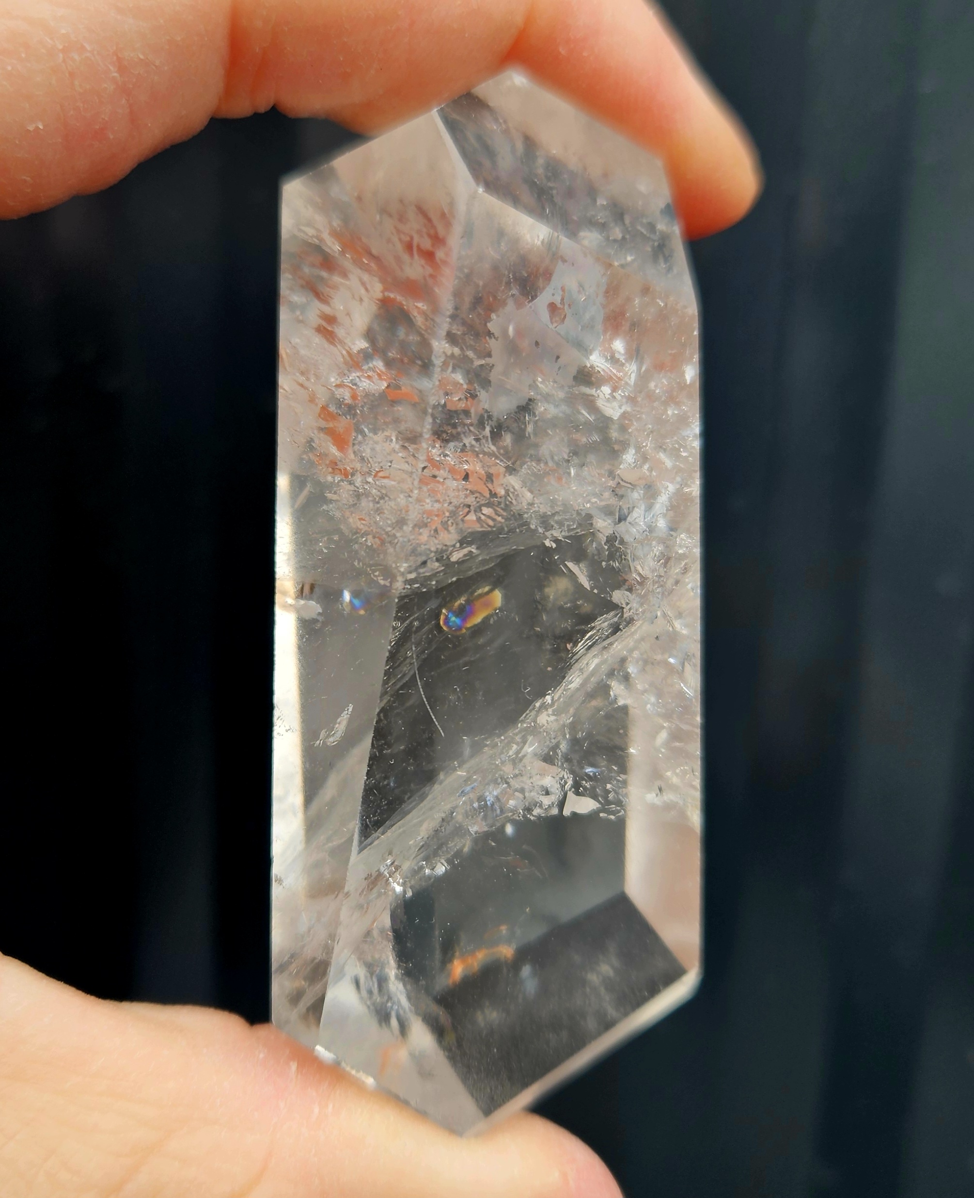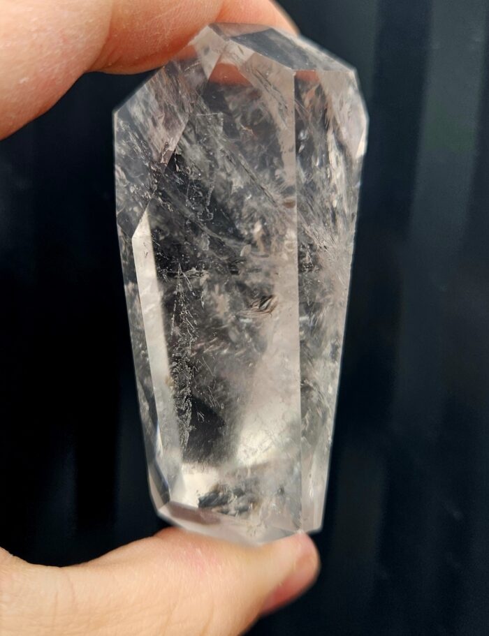 Tento nádherný krištáľový výbrus zaujme svojím elegantným tvarom s dvoma hrotmi, vďaka ktorým energia prúdi plynulo v oboch smeroch. V jeho vnútri sa ukrýva fascinujúca štruktúra plná detailov a jemných odleskov.