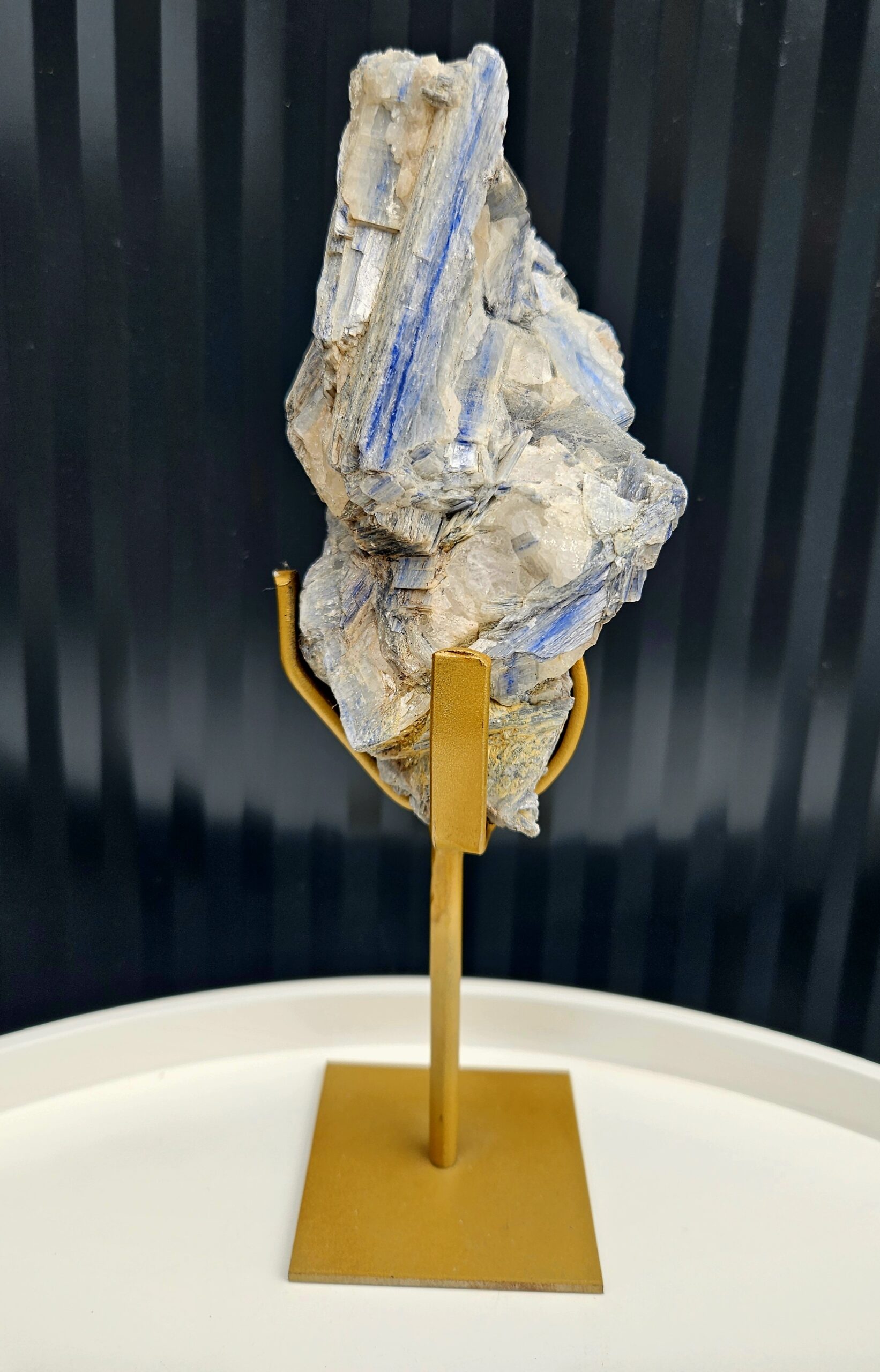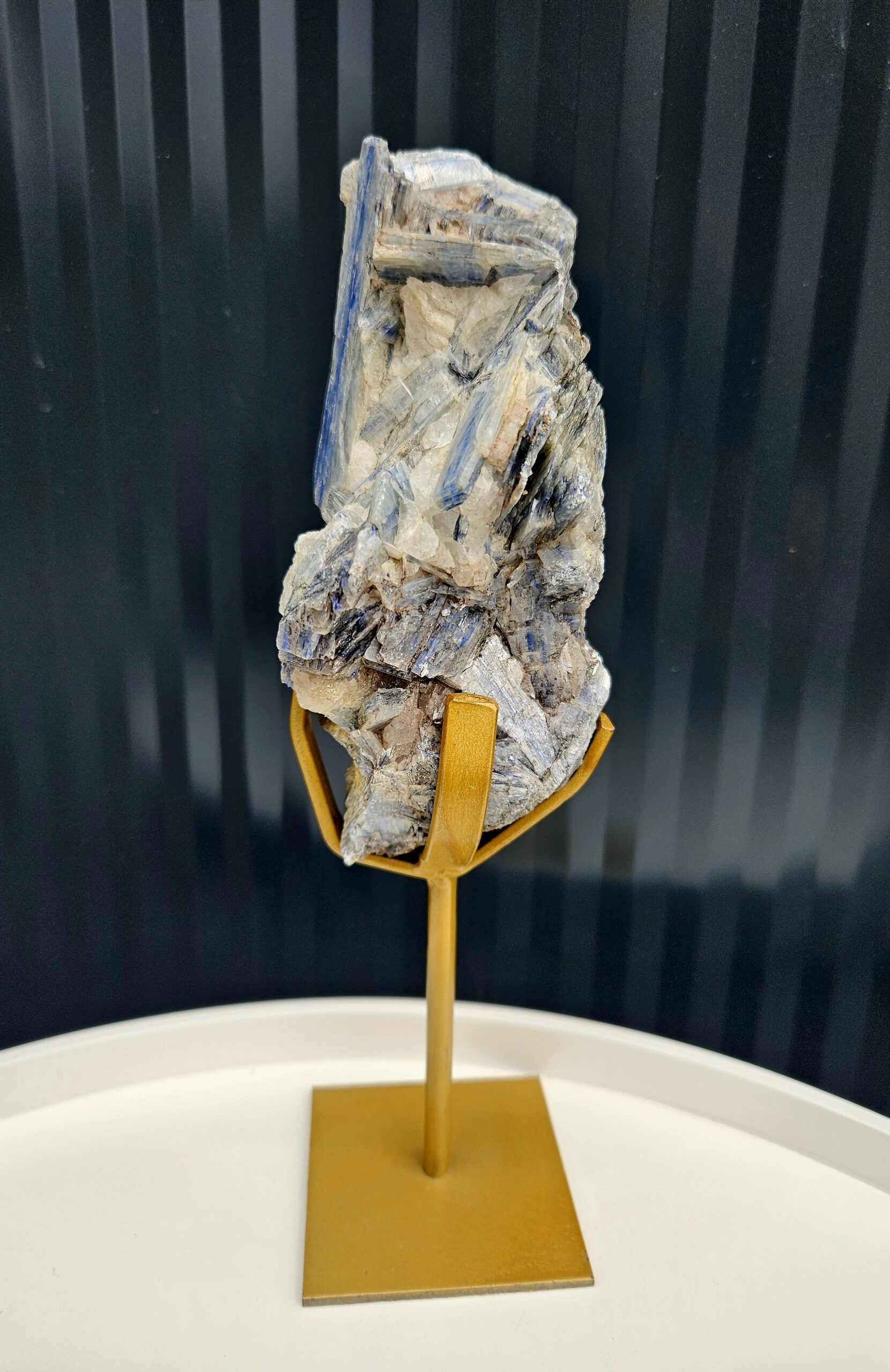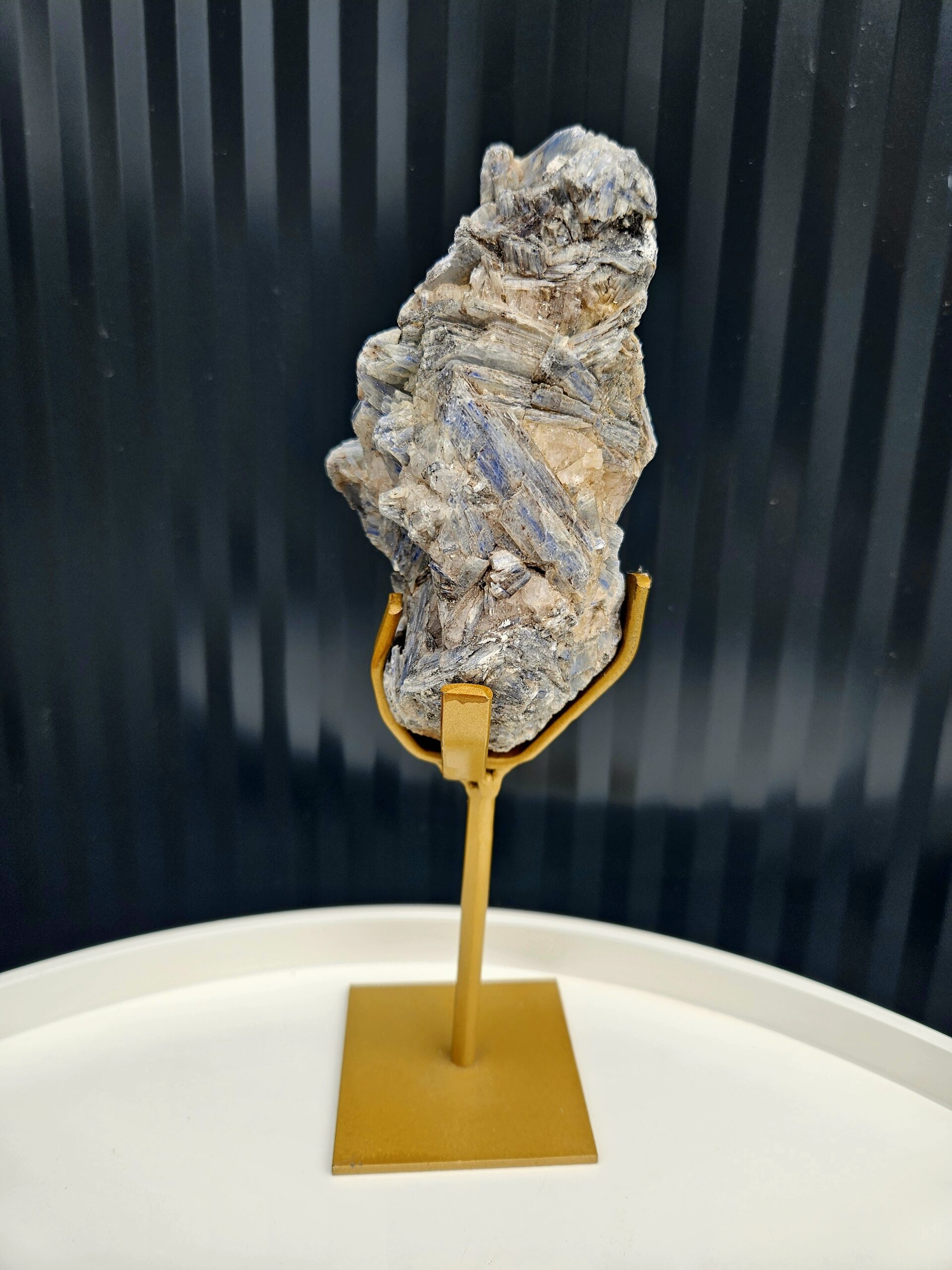 Impozantný prírodný kyanit osadený na elegantnom zlatom stojane, ktorý z neho robí skutočný umelecký objekt. Dynamická štruktúra čepeľovitých kryštálov v jemných modrých a sivých tónoch vytvára fascinujúcu hru svetla a textúr.