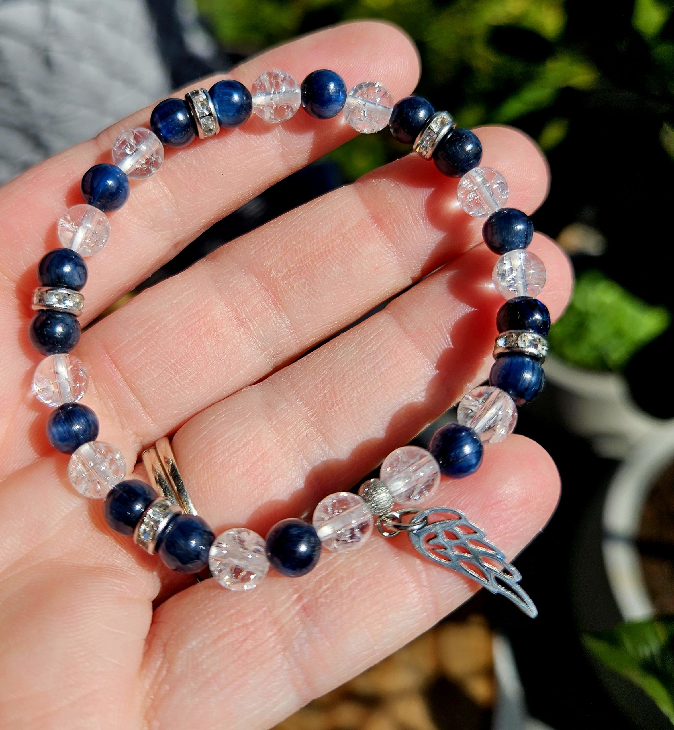 Kyanit – Disten + Krištáľ náramok 6mm Anjelske krídlo