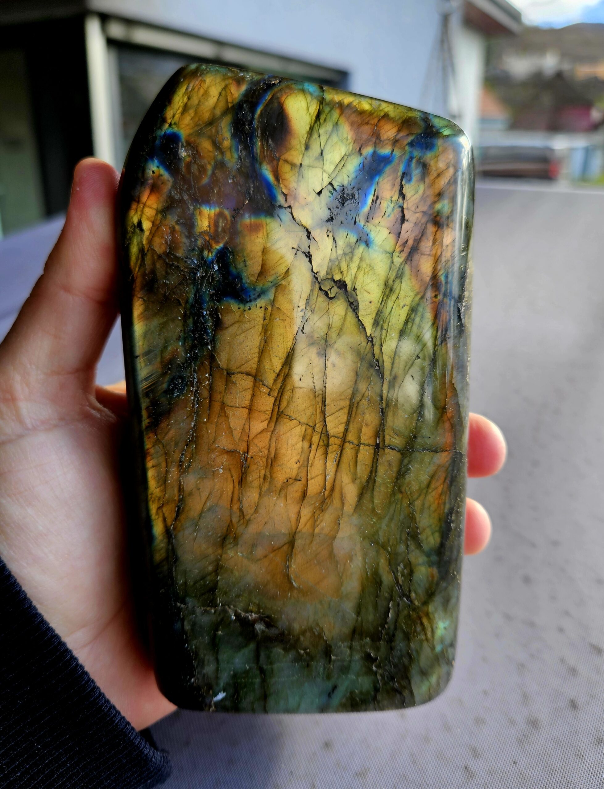 Tento výnimočný labradorit vás očarí svojou intenzívnou hrou farieb – od hlbokých modrých odleskov, cez smaragdovo zelené tóny až po jemné zlatisté záblesky. Každý pohľad odhalí inú časť jeho tajomnej krásy, ktorá je typická pre kvalitný labradorit s výraznou labradorescenciou.
