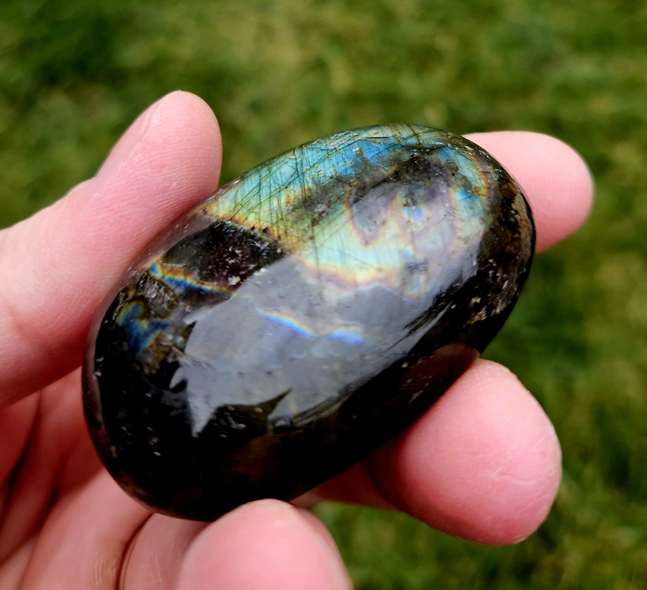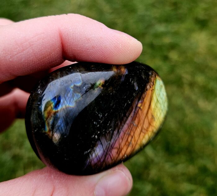 Tento leštený labradorit očarí svojou výraznou hrou farieb, kde sa prelínajú zlaté, fialové, modré aj jemne dúhové odlesky. Každý pohyb odhaľuje novú dimenziu jeho krásy, akoby sa svetlo prebúdzalo priamo v jeho vnútri. Hladký, príjemný povrch z neho robí ideálny kameň do dlane, ktorý môžete nosiť stále pri sebe.