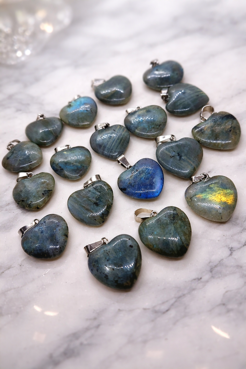 Labradorit je považovaný za kameň ochrany, intuície a vnútornej rovnováhy. Pomáha posilňovať sebadôveru, podporuje vnútorný pokoj a chráni pred negatívnymi vplyvmi. Tvar srdca dodáva prívesku jemnú symboliku lásky a harmónie.