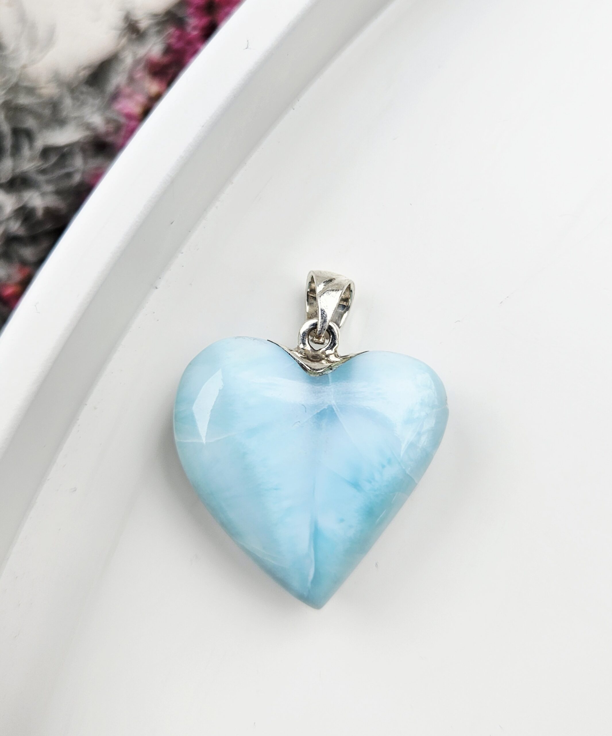 Jemné srdiečko z pravého larimaru, vzácneho kameňa pochádzajúceho výhradne z Dominikánskej republiky. Každý kus je originál s jedinečnou kresbou tyrkysovo-modrých odtieňov, pripomínajúcich pokoj mora a karibskú energiu.