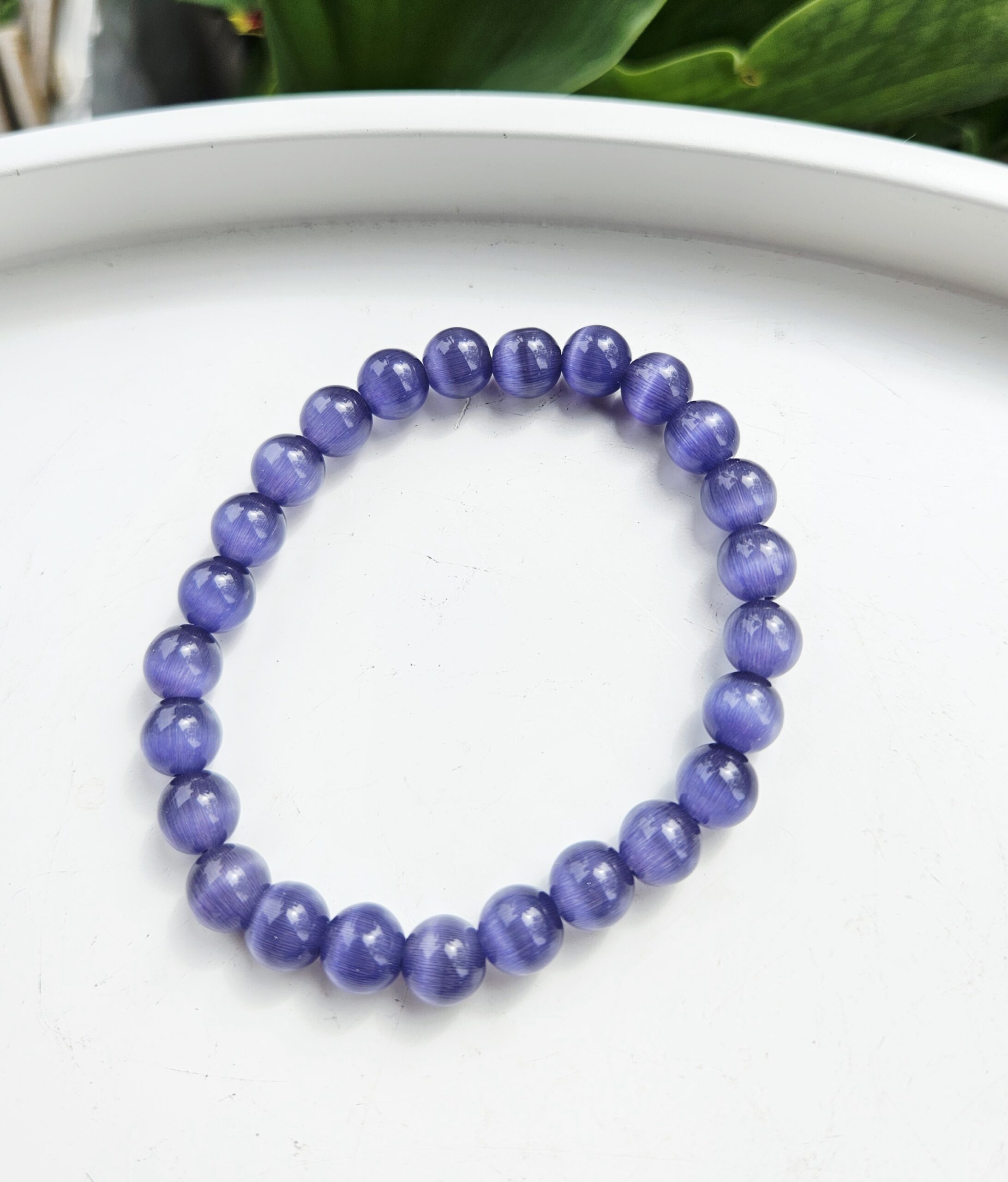 Tento elegantný náramok z kameňa „mačacie oko“ v nádhernom fialovom odtieni vytvára pri pohybe jemný svetelný efekt, ktorý pôsobí luxusne a výnimočne.