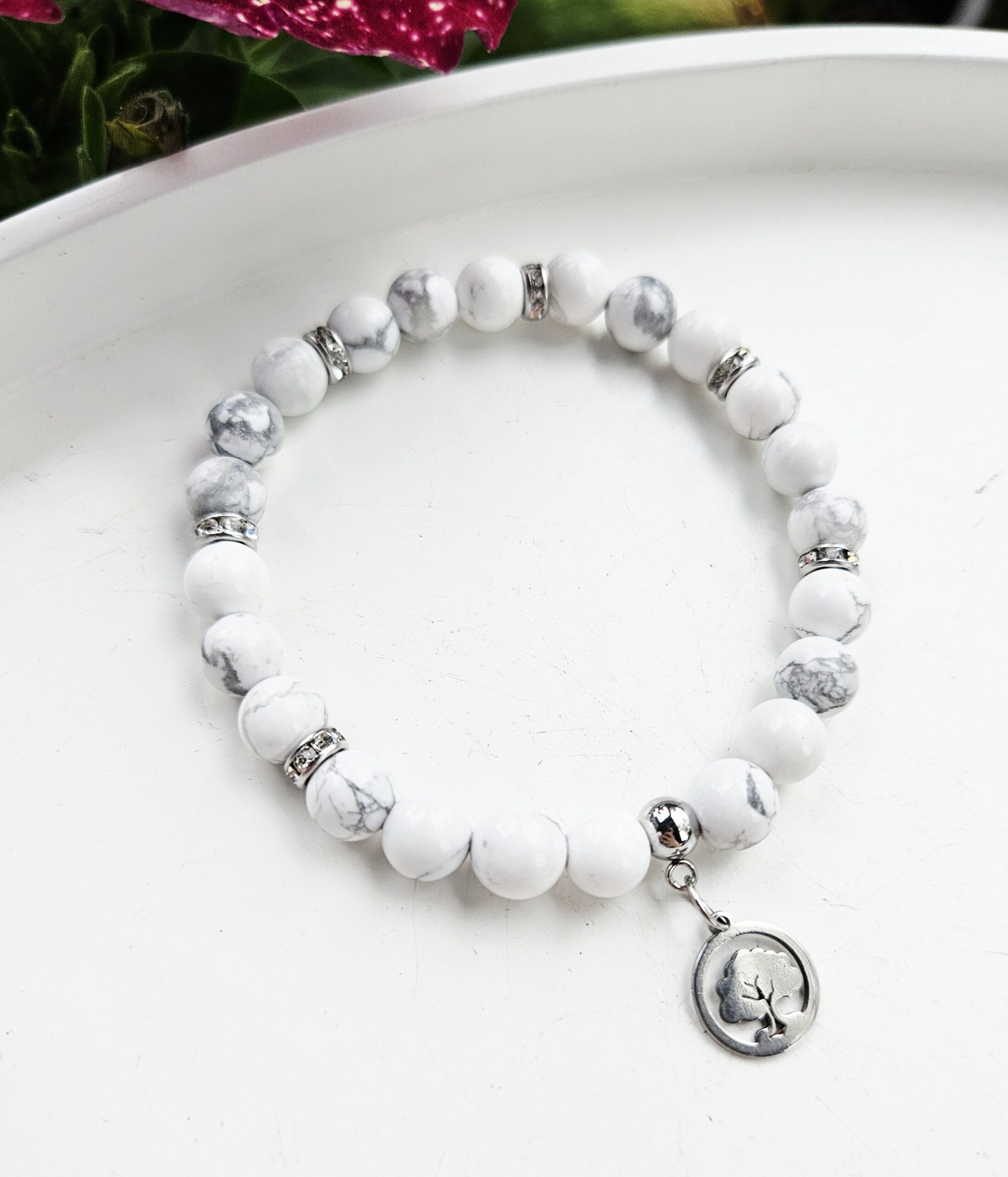 Náramok z magnezitu v sebe nesie čistotu bieleho kameňa s jemným sivým žilkovaním, pripomínajúcim mramor – nadčasový, elegantný a harmonický. Je ideálnym spoločníkom pre chvíle, keď túžite spomaliť, uvoľniť myseľ a nájsť vnútornú rovnováhu.
